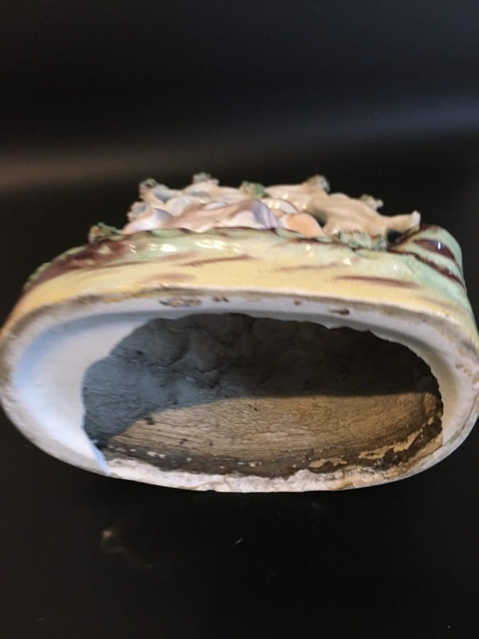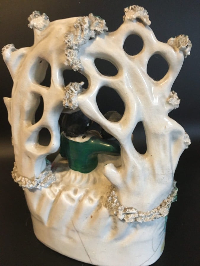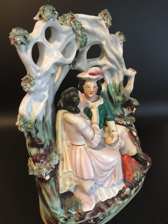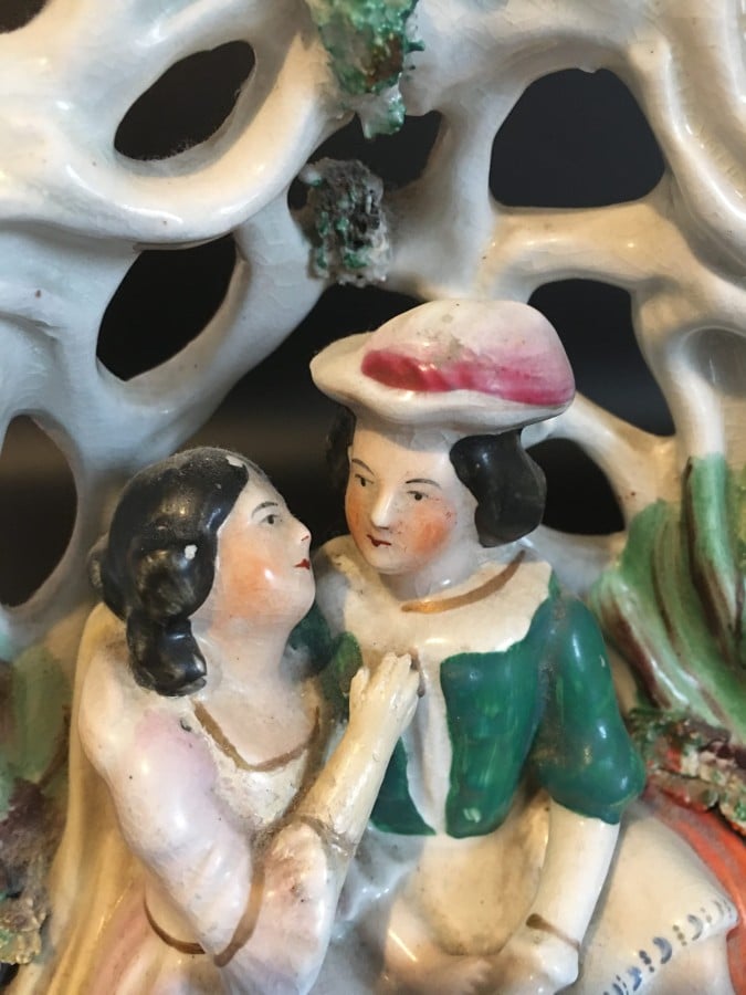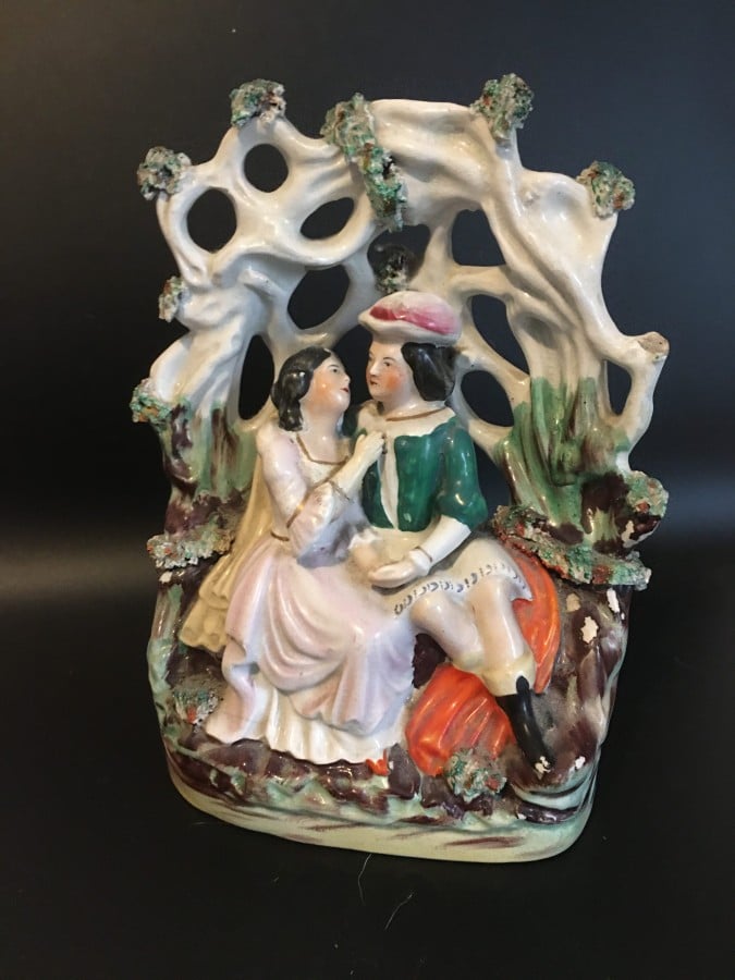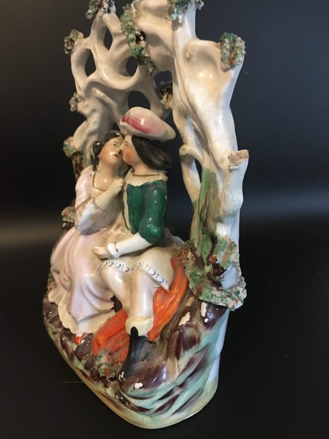 A Staffordshire figurine depicting a pair of lovers on a lover’s seat nice, detailed work and colours. This piece has damage with the base completely missing showing the press moulding technique used in the making also a couple of cracks to the base and some colour loss, there is also damage to the top of one of the tree limbs. The piece measures 8″x 6″inches. Having said all that this piece is still a great collector’s item with the damage not detracting the look at all.