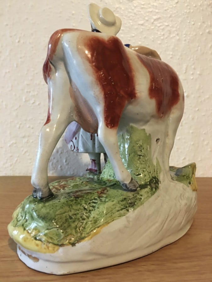 A Staffordshire Figurine depicting a milkmaid and cow in excellent condition (bar from slight screeches to colour) for age, well modelled with lots of nice detail. This piece stands at 8″x 7.5″ inches and has no chips cracks or restoration. A great piece for the collector’s cabinet.