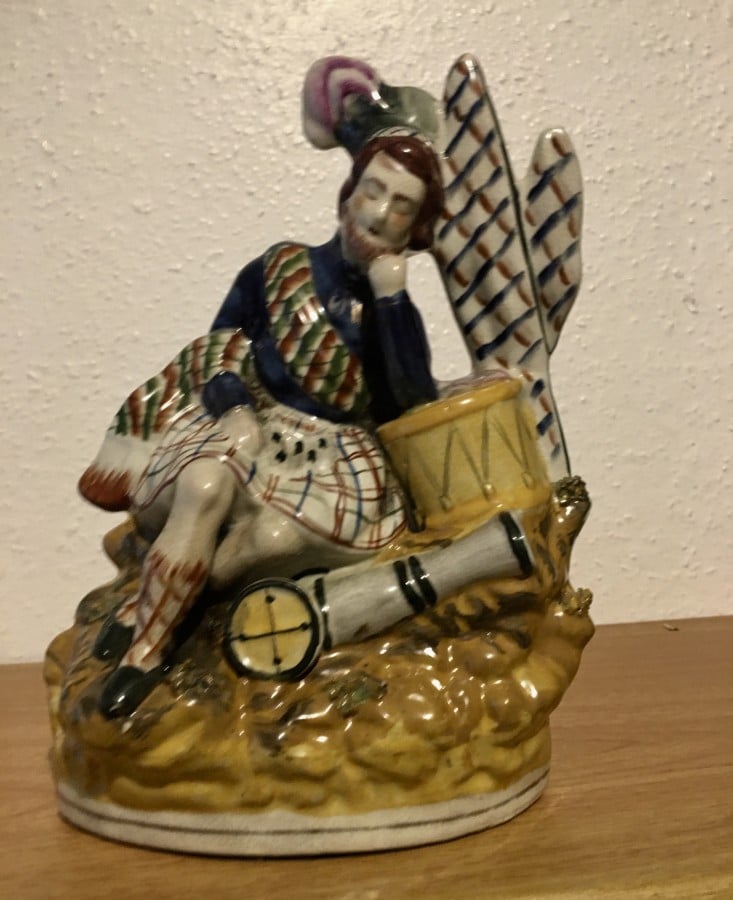 Reproduction Staffordshire Figurine dating from mid twentieth century depicting a tired soldier back from war, probably made in China but in very good condition. Standing at 11″x 8″ inches.