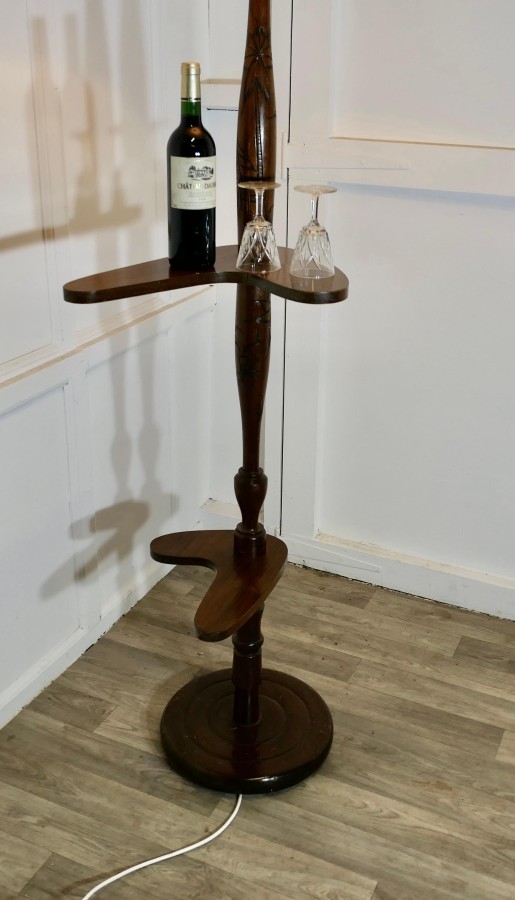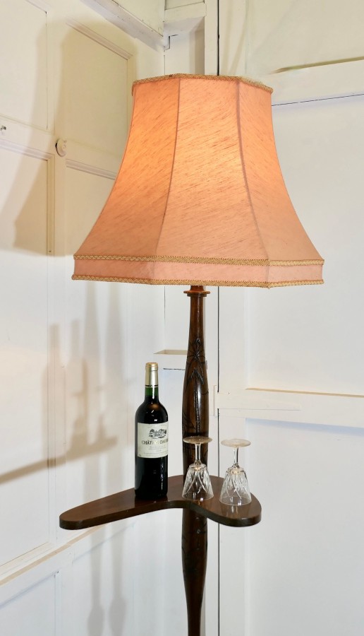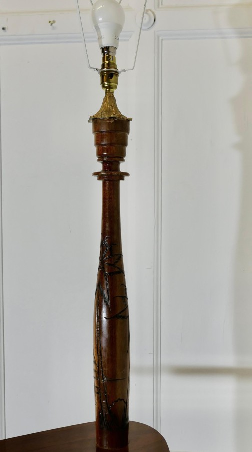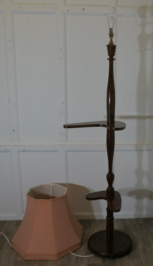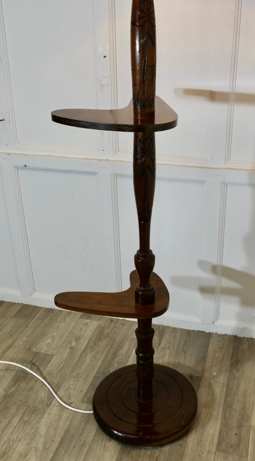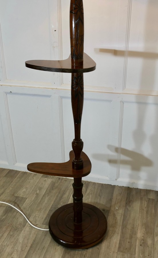 Standard or Floor Lamp with Palm Decoration This is an attractive piece, the round base of the lamp supports a turned and carved upright, this has 2 shelves and the column is decorated with carvings of palm trees The lamp is in good condition and comes with a large linen shade The lamp is 76” tall and 22” in diameter TZX237 Manufacture Date : 1930 Materials : Teak