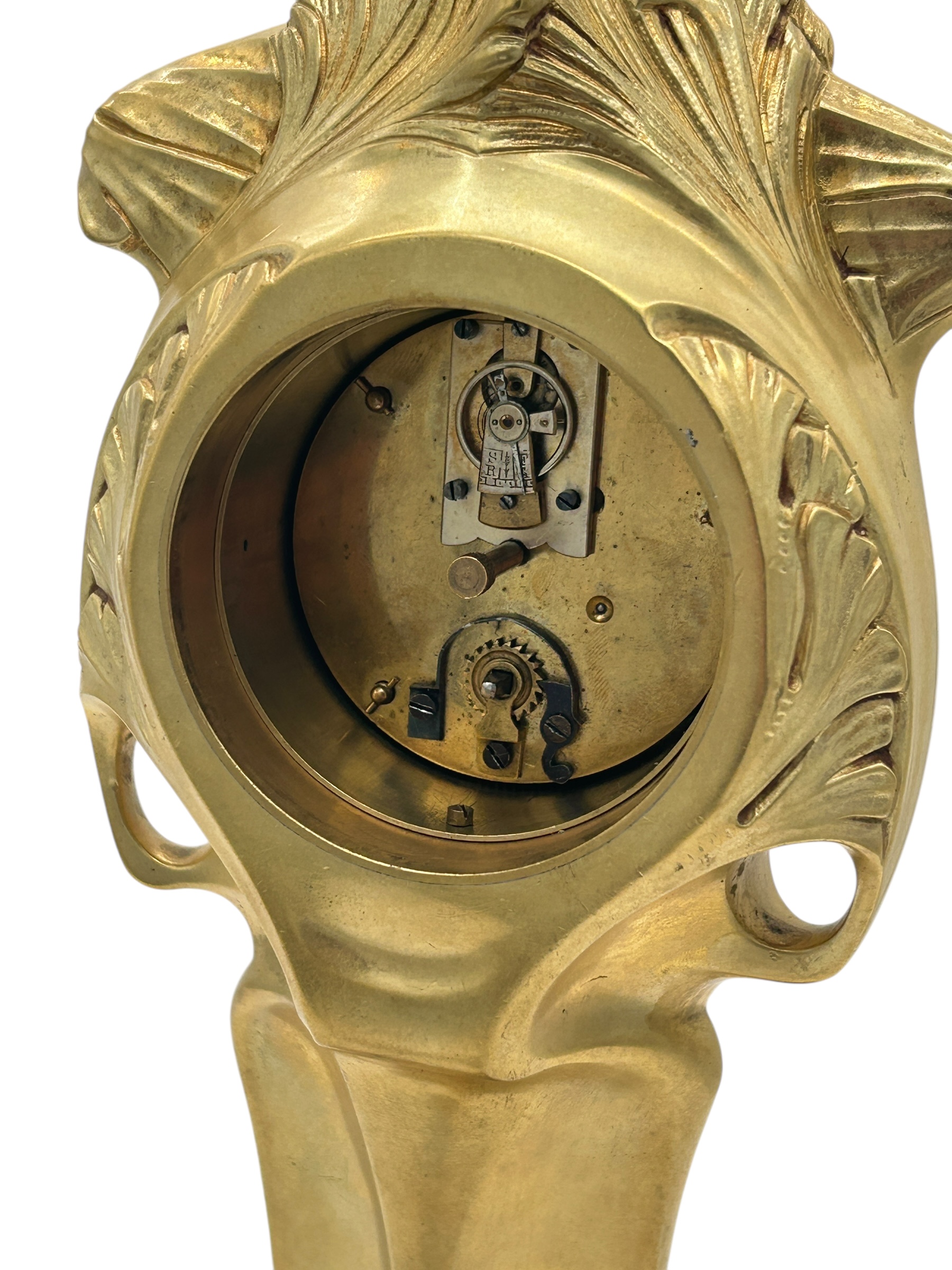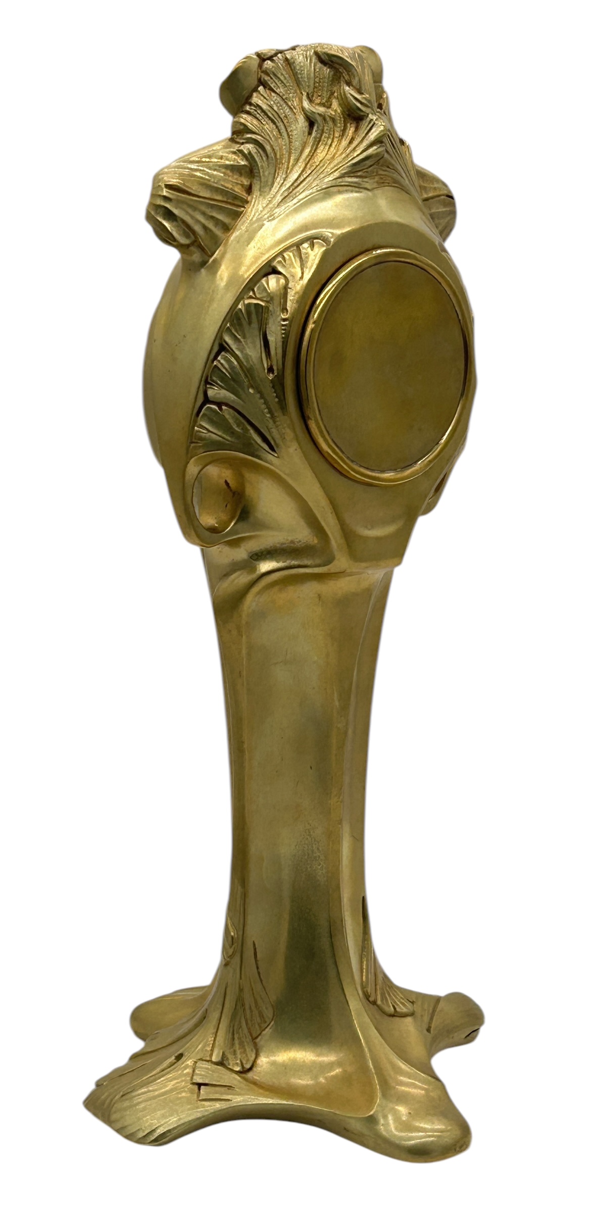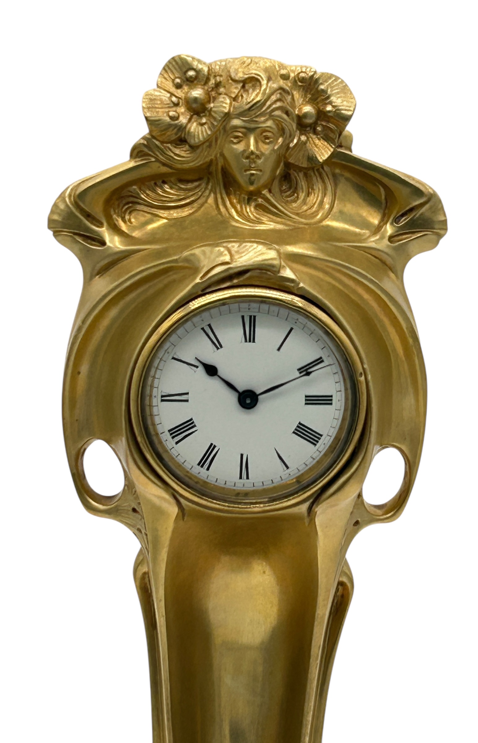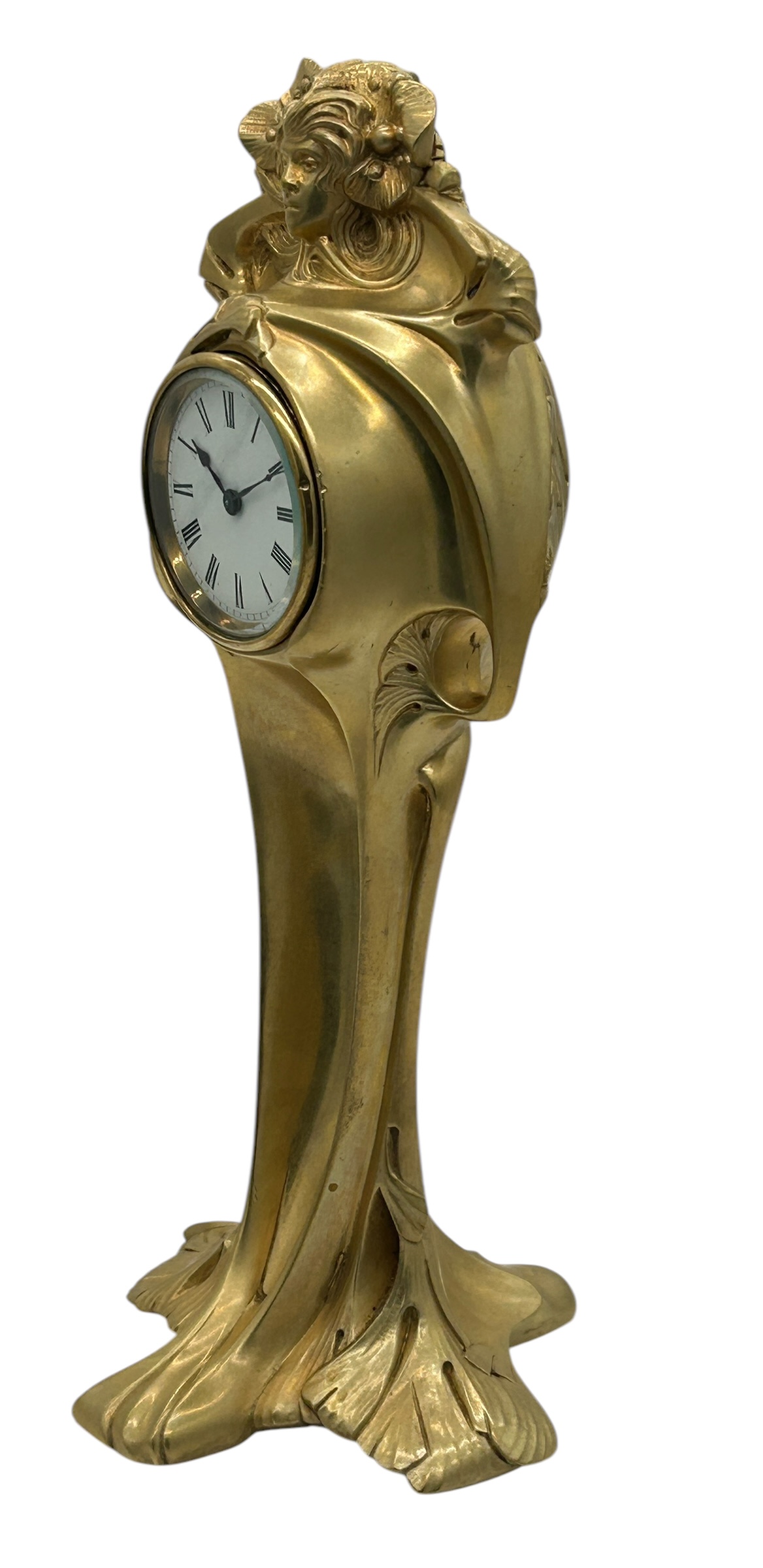 Solid cast bronze ormolu finished case, cast in an art nouveau lady figural shape.