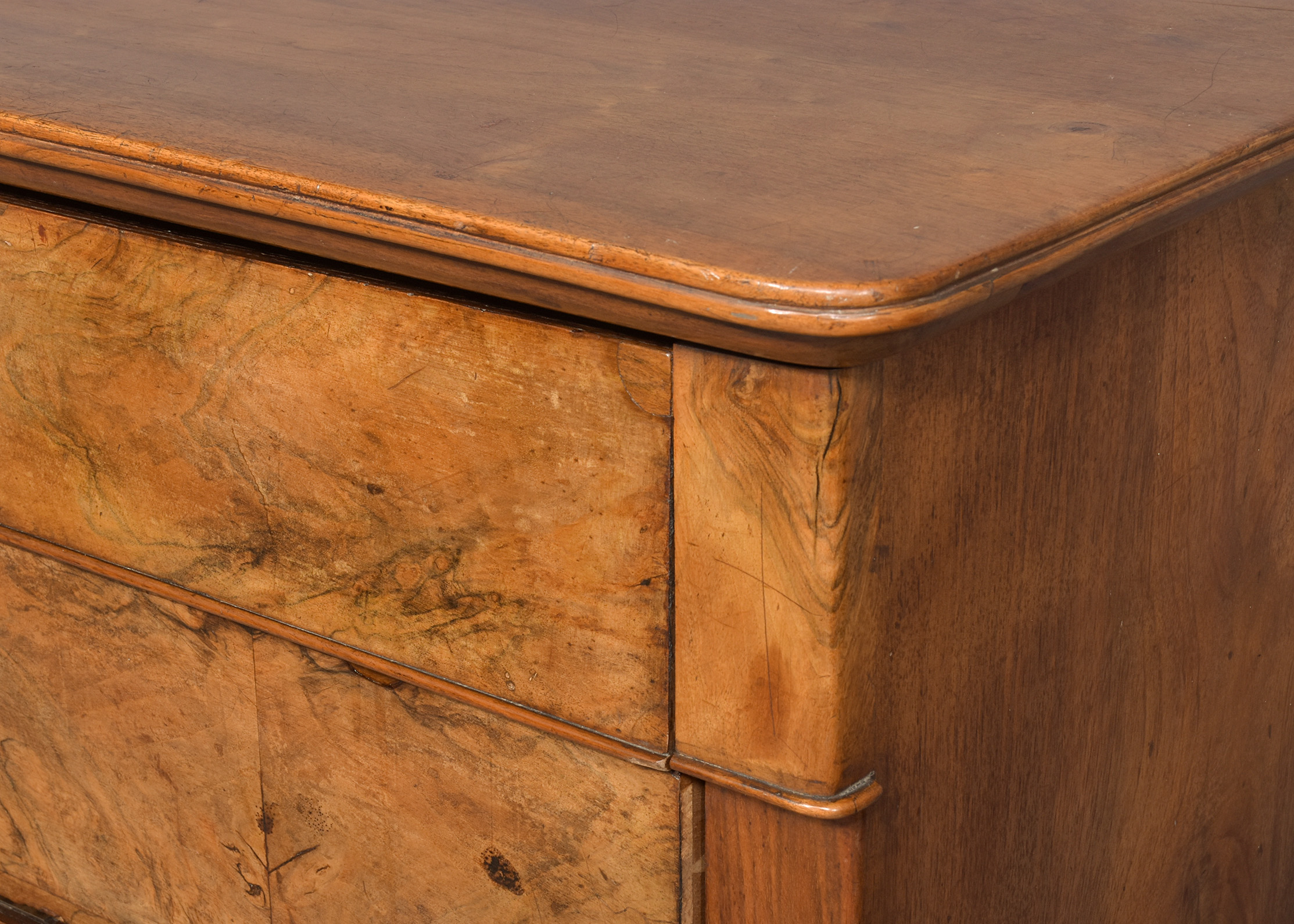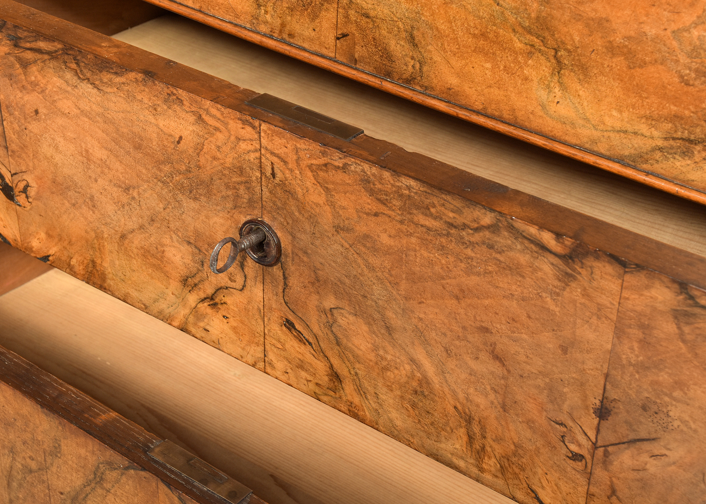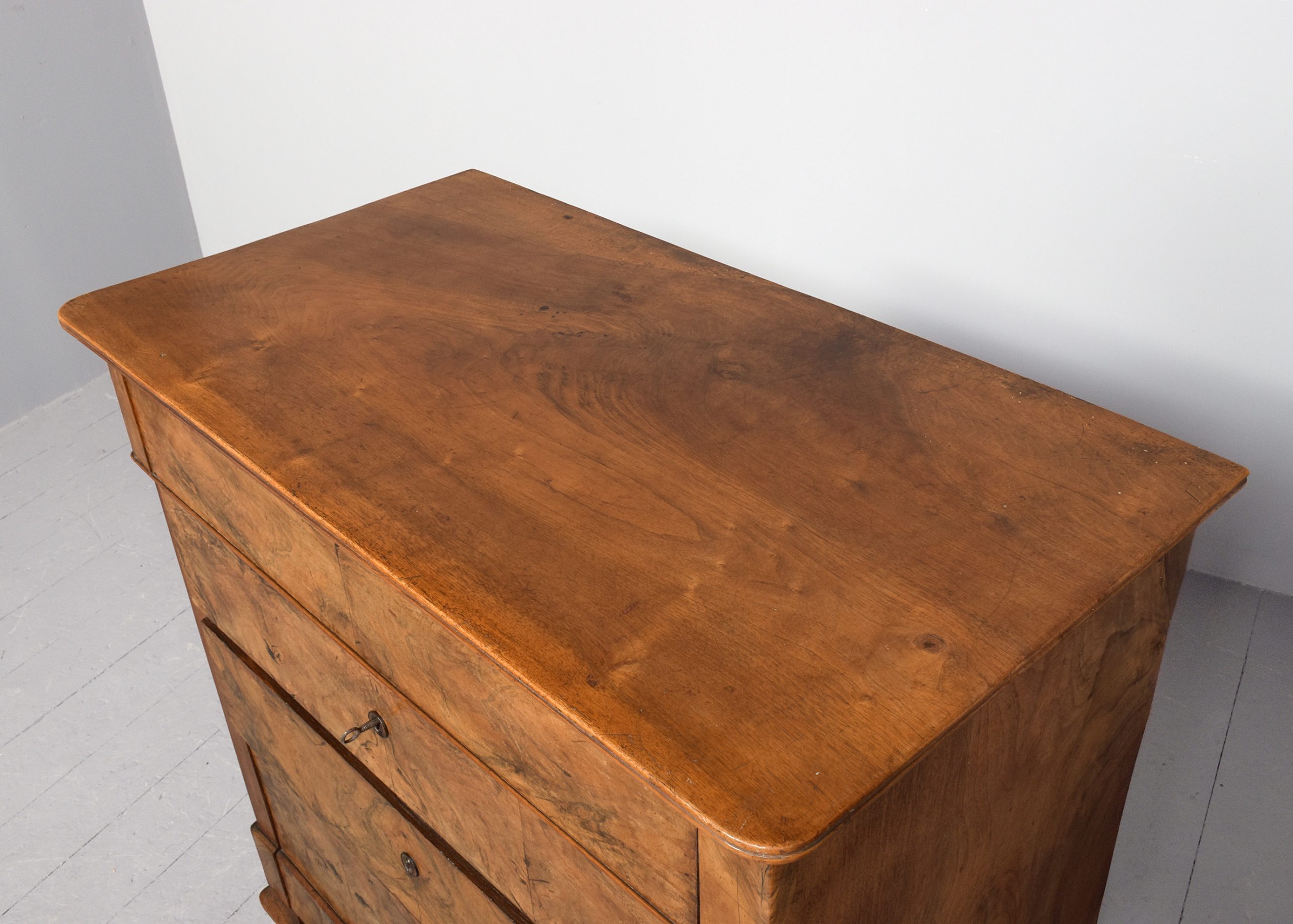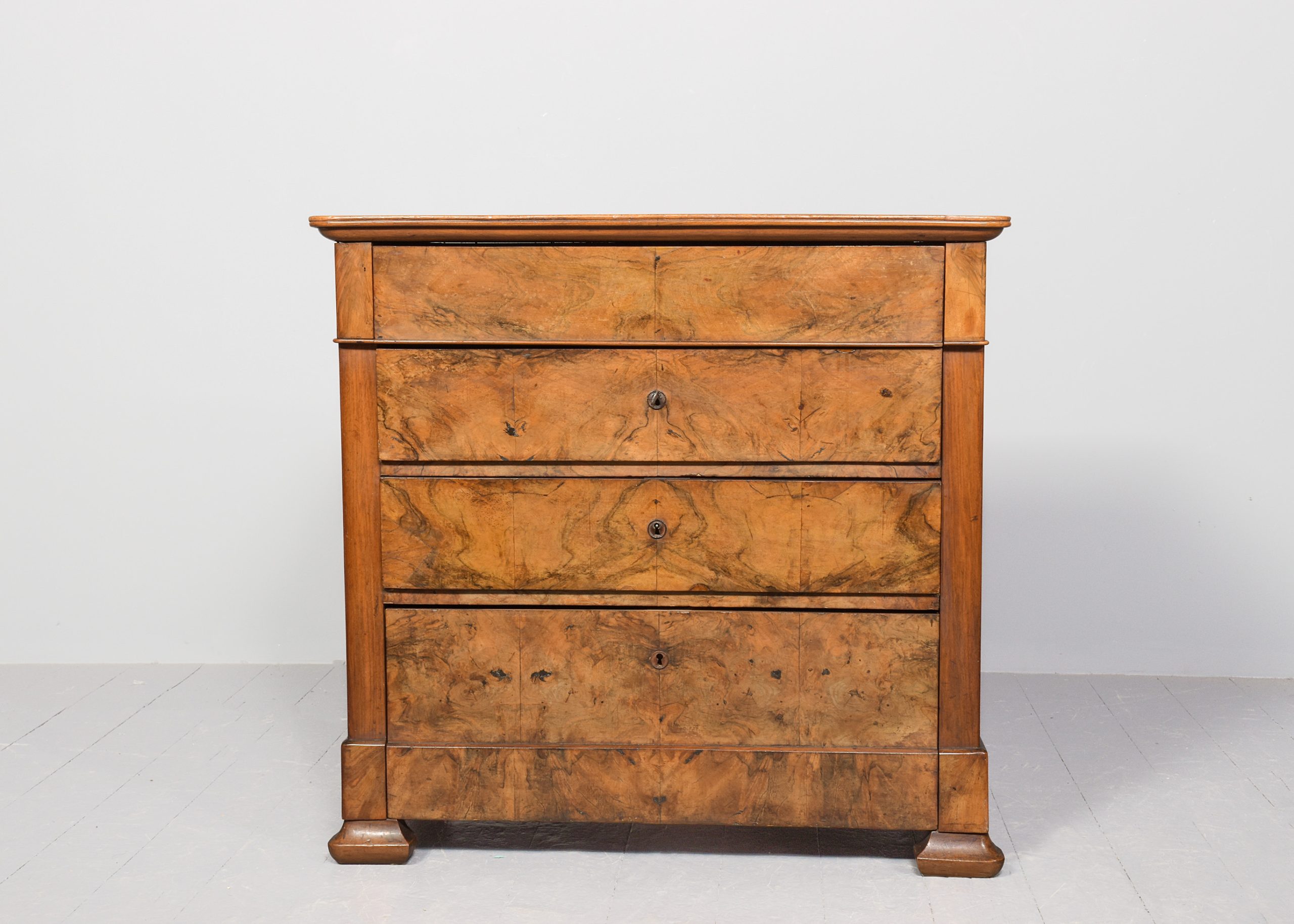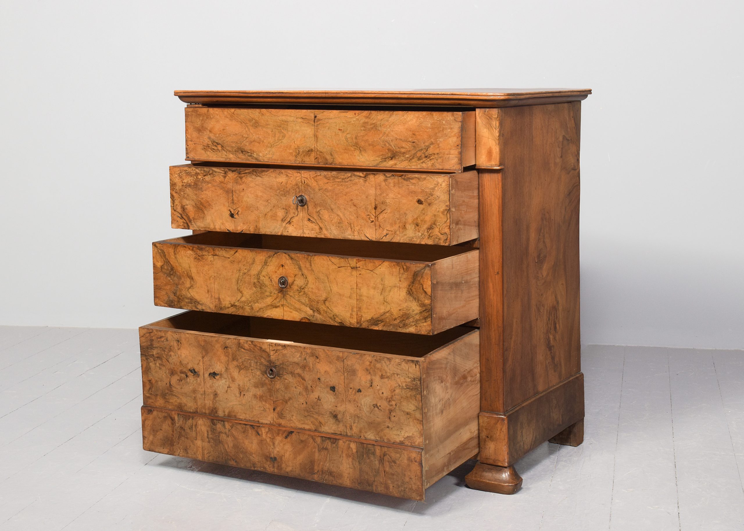 Stylish blonde, figured-walnut Biedermeier chest of drawers
