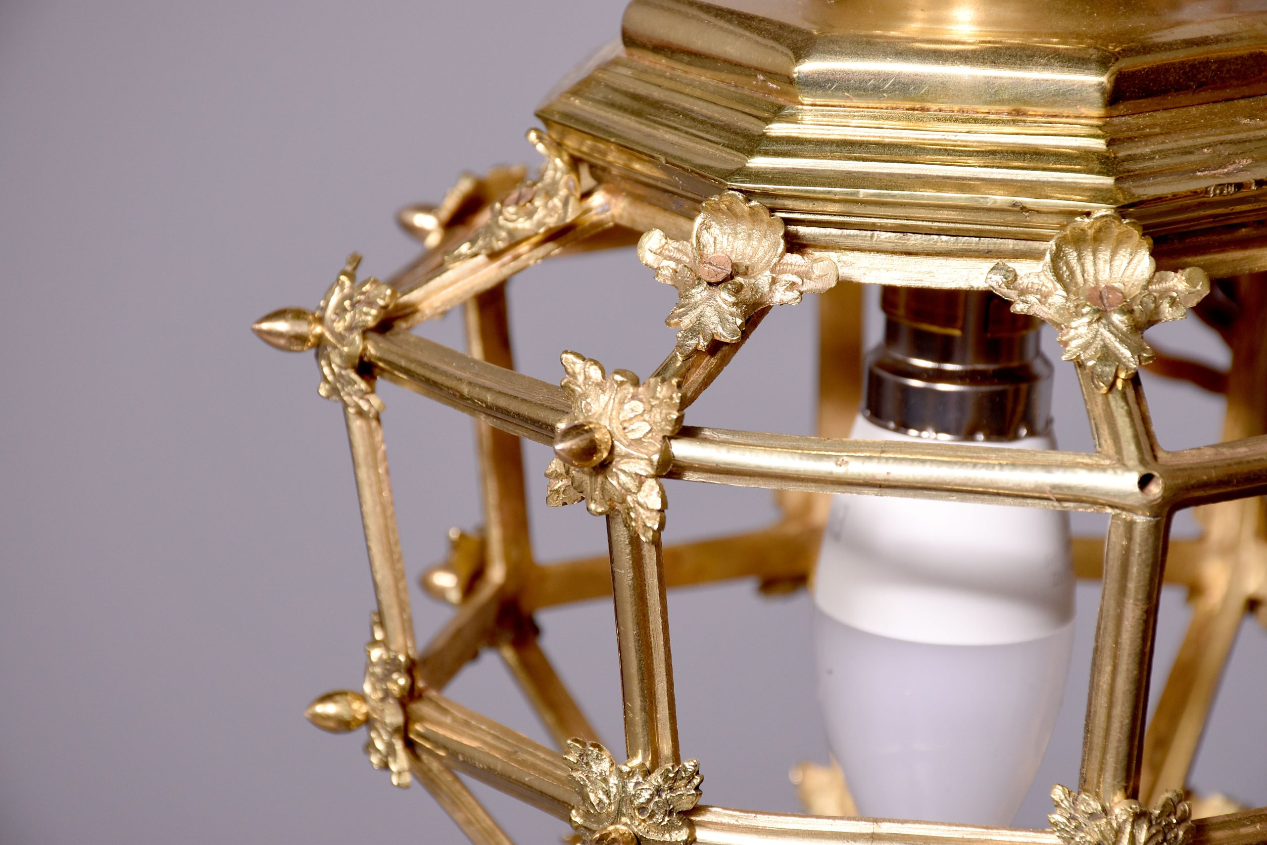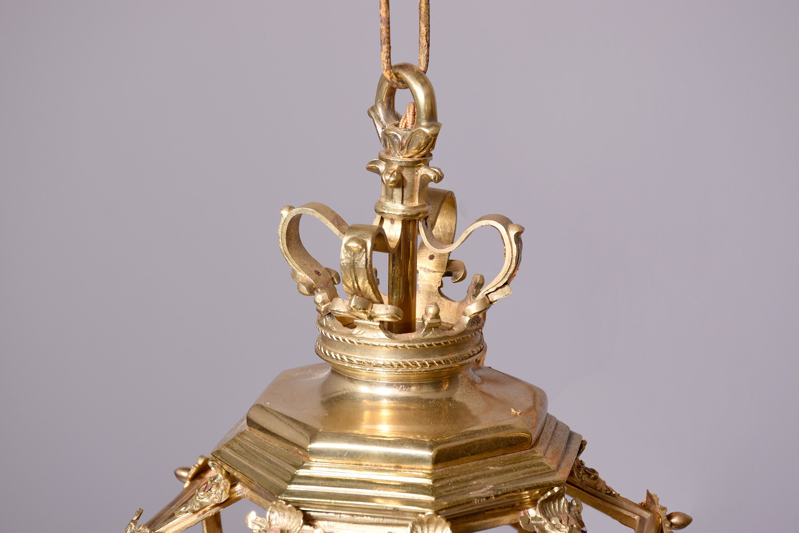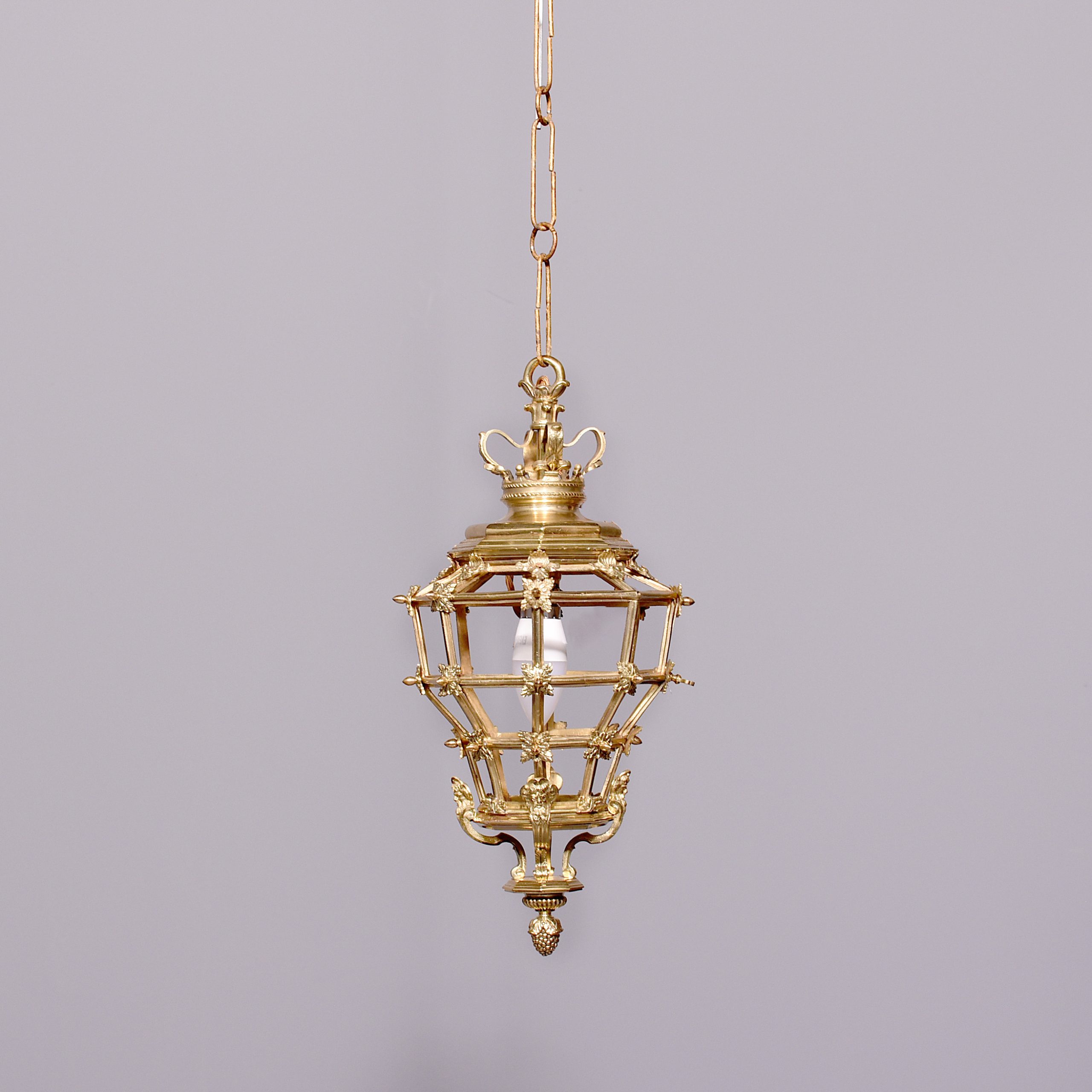Circa 1890. Magnificent ormolu lantern of hexagonal form, surmounted by a pierced crown, the gilded body concealing an access door which is held in place by square flower heads, the tapering body with four classical masks terminating on a downward facing finial, includes chain and ceiling mount.