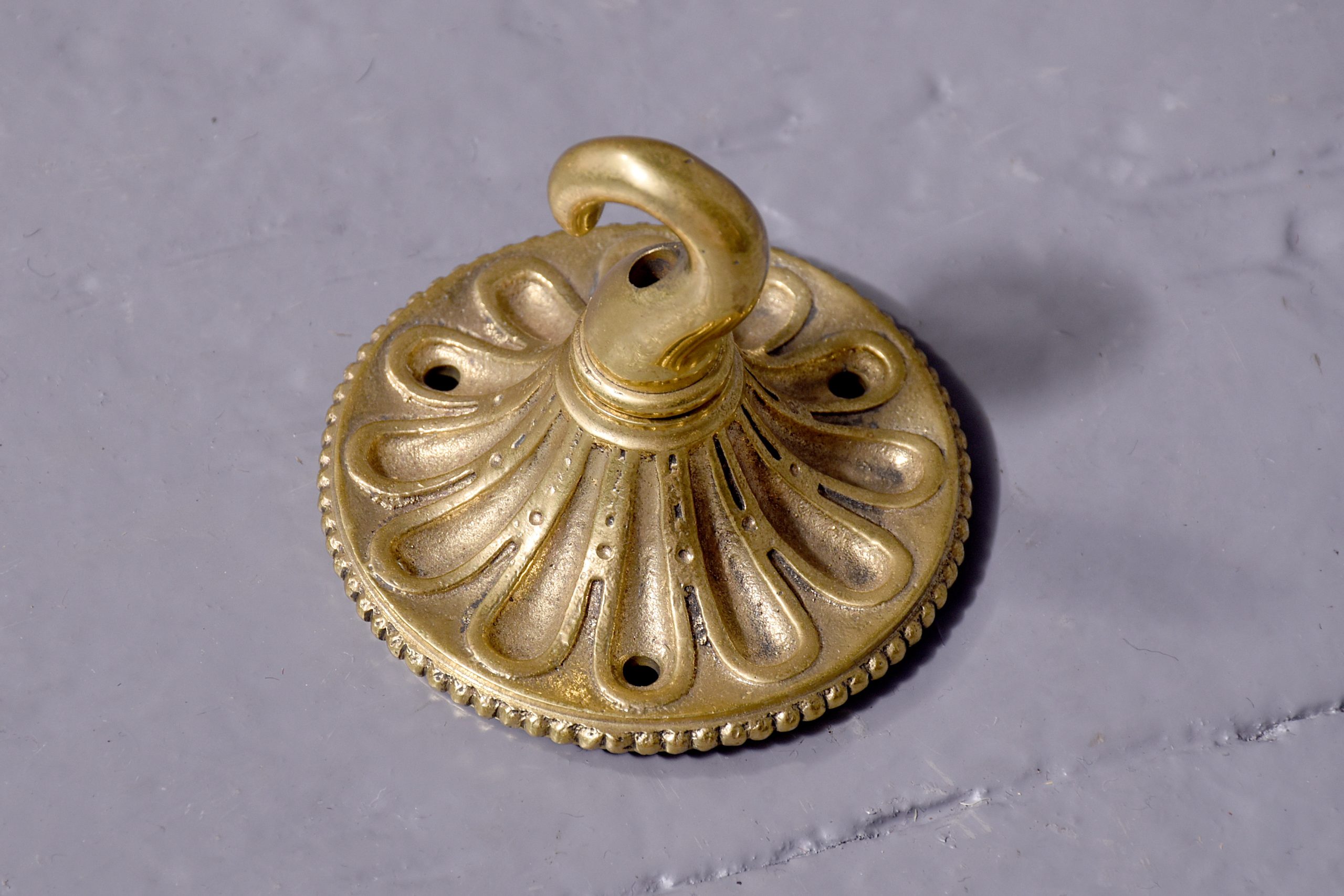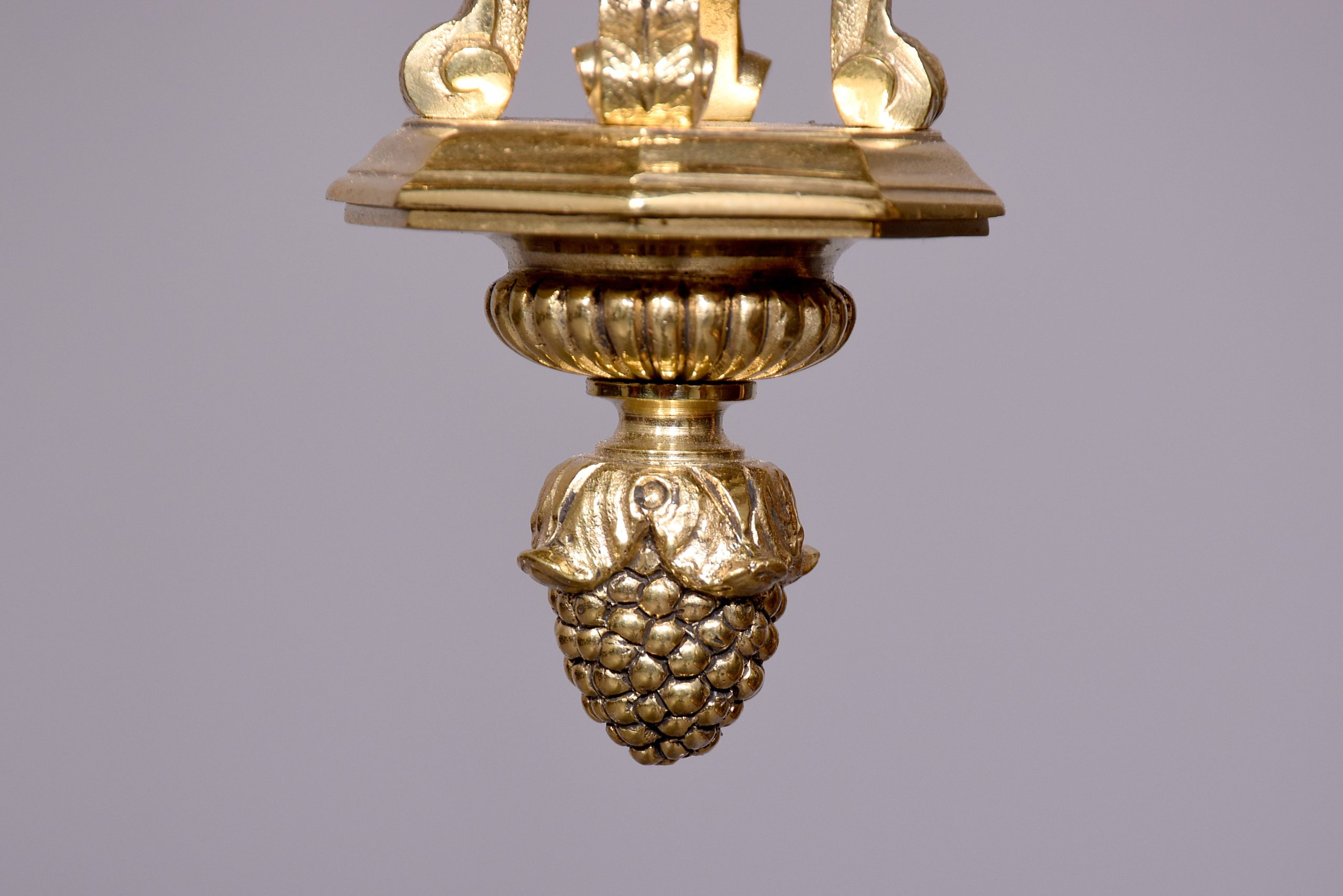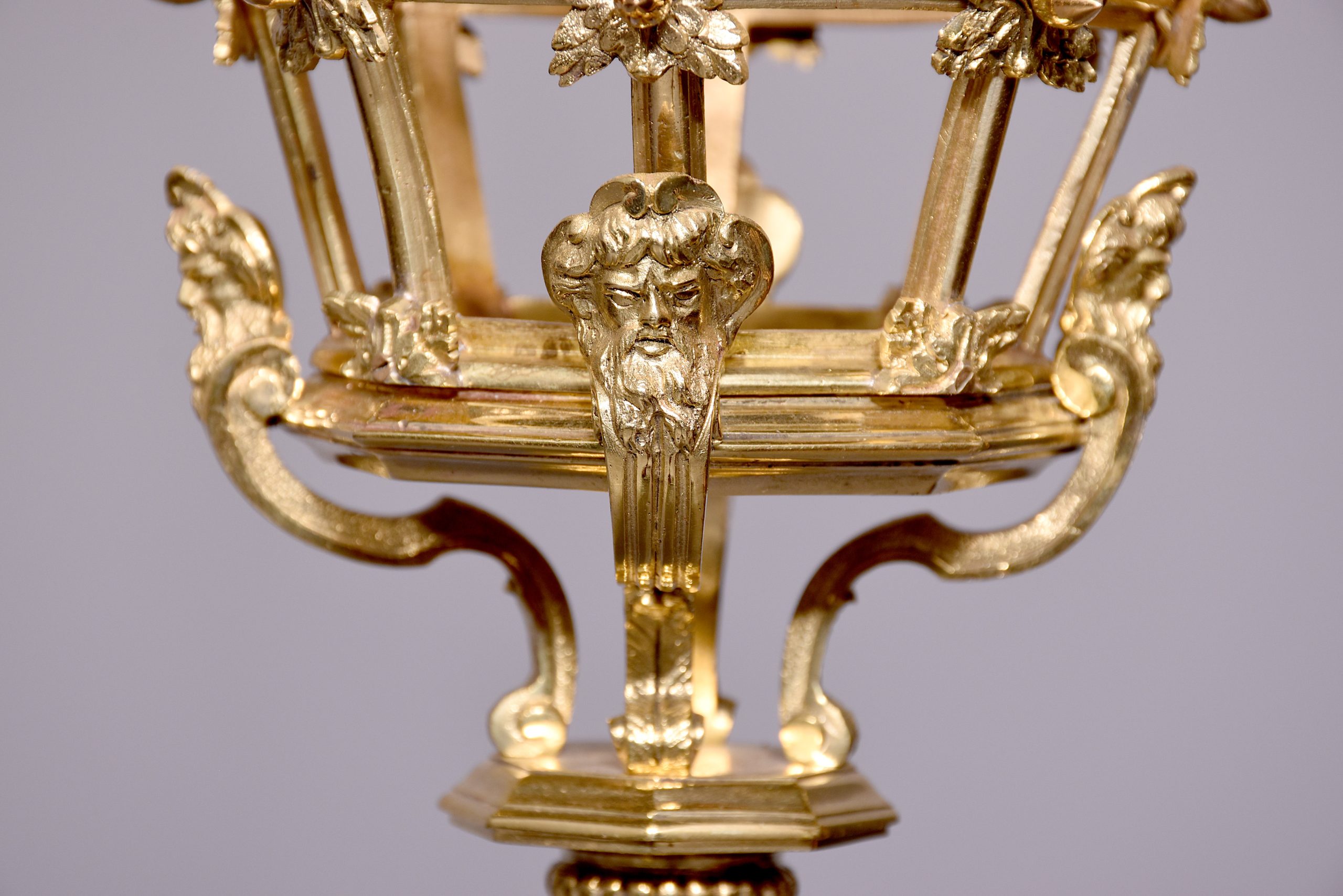 Circa 1890. Magnificent ormolu lantern of hexagonal form, surmounted by a pierced crown, the gilded body concealing an access door which is held in place by square flower heads, the tapering body with four classical masks terminating on a downward facing finial, includes chain and ceiling mount.