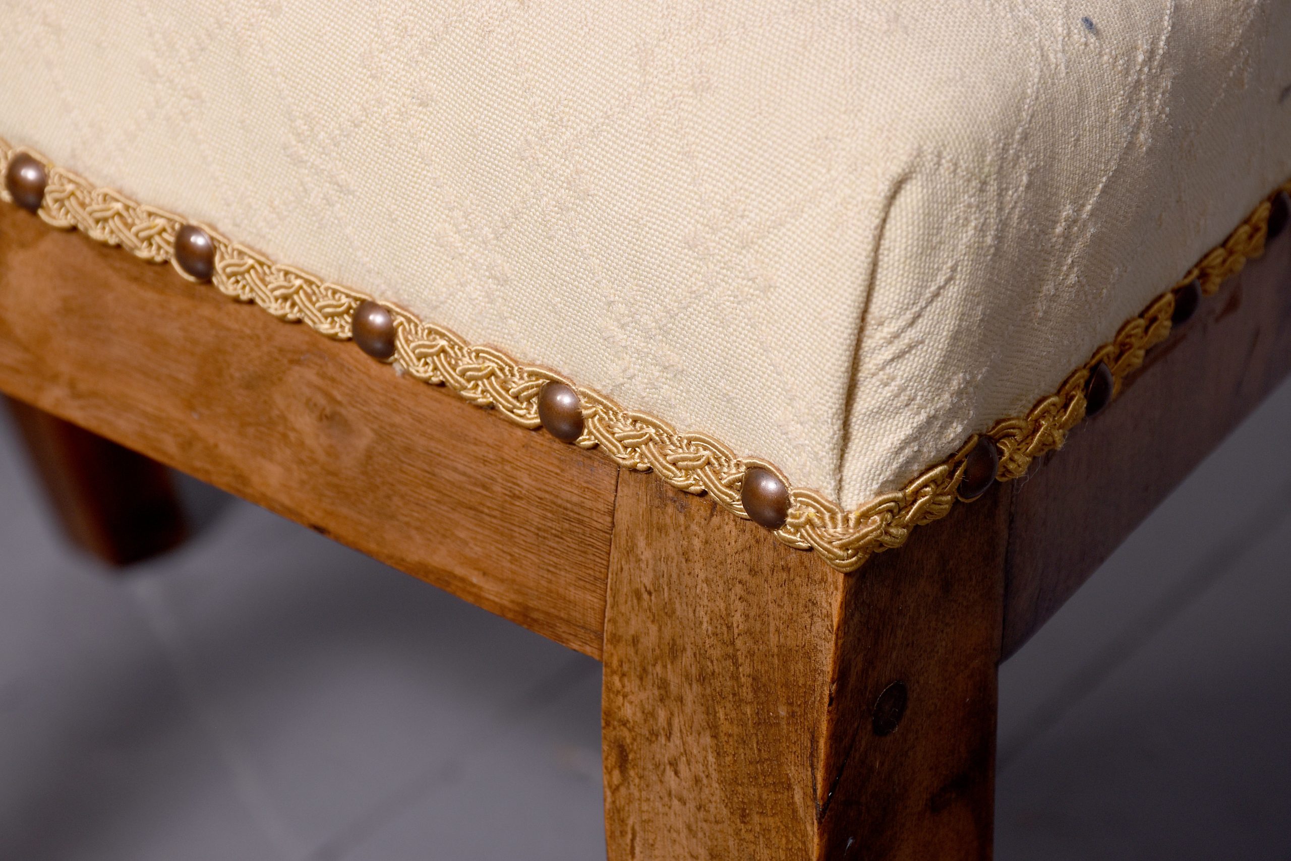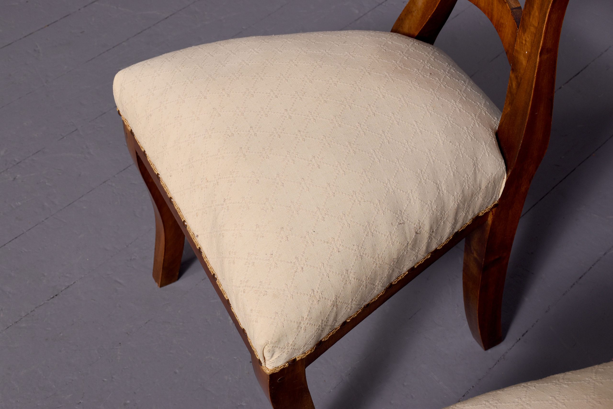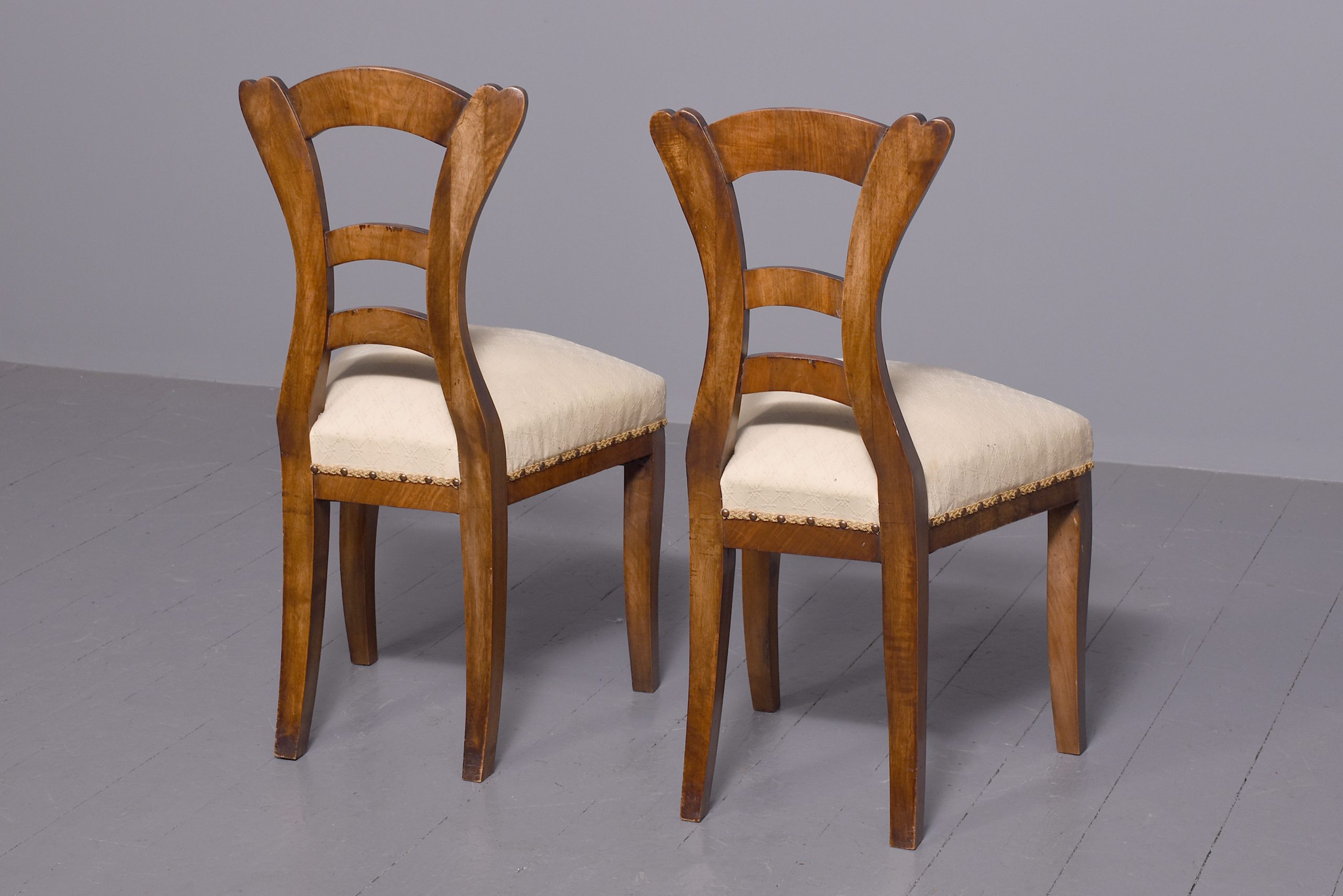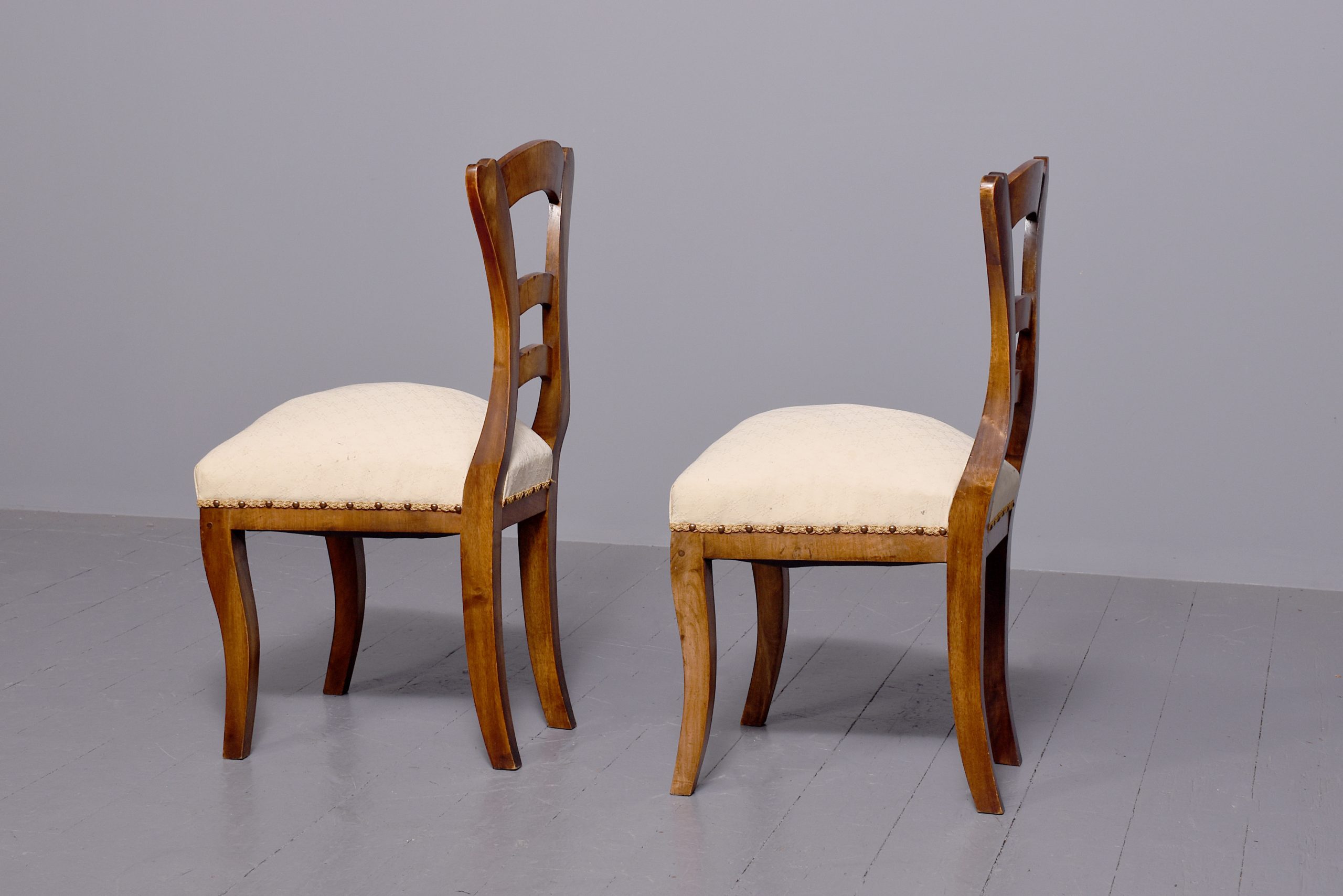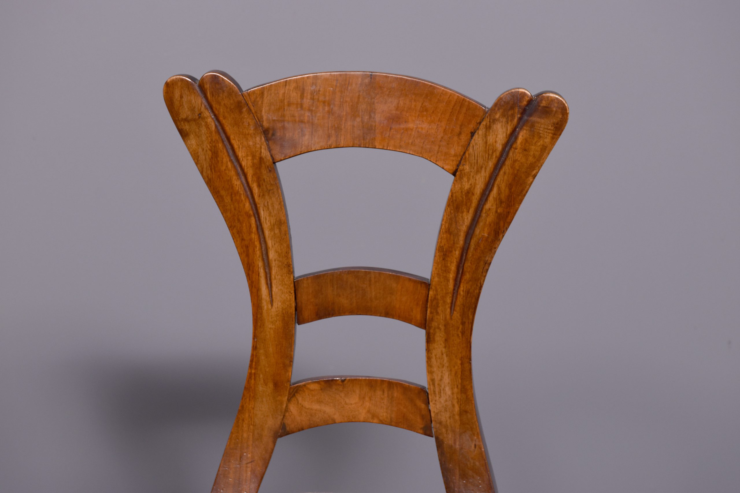 Circa 1860. An unusual pair of Austrian walnut side chairs, the shaped back with a curved cresting rail supported on a deep upright with ribbing in the center, with two curved spars beneath, the large domed upholstered seat with the upholstery held in place by gimp and brass studs, the back legs are square and slightly out swept and the front saber legs with visible peg dowels and simple seat rails.