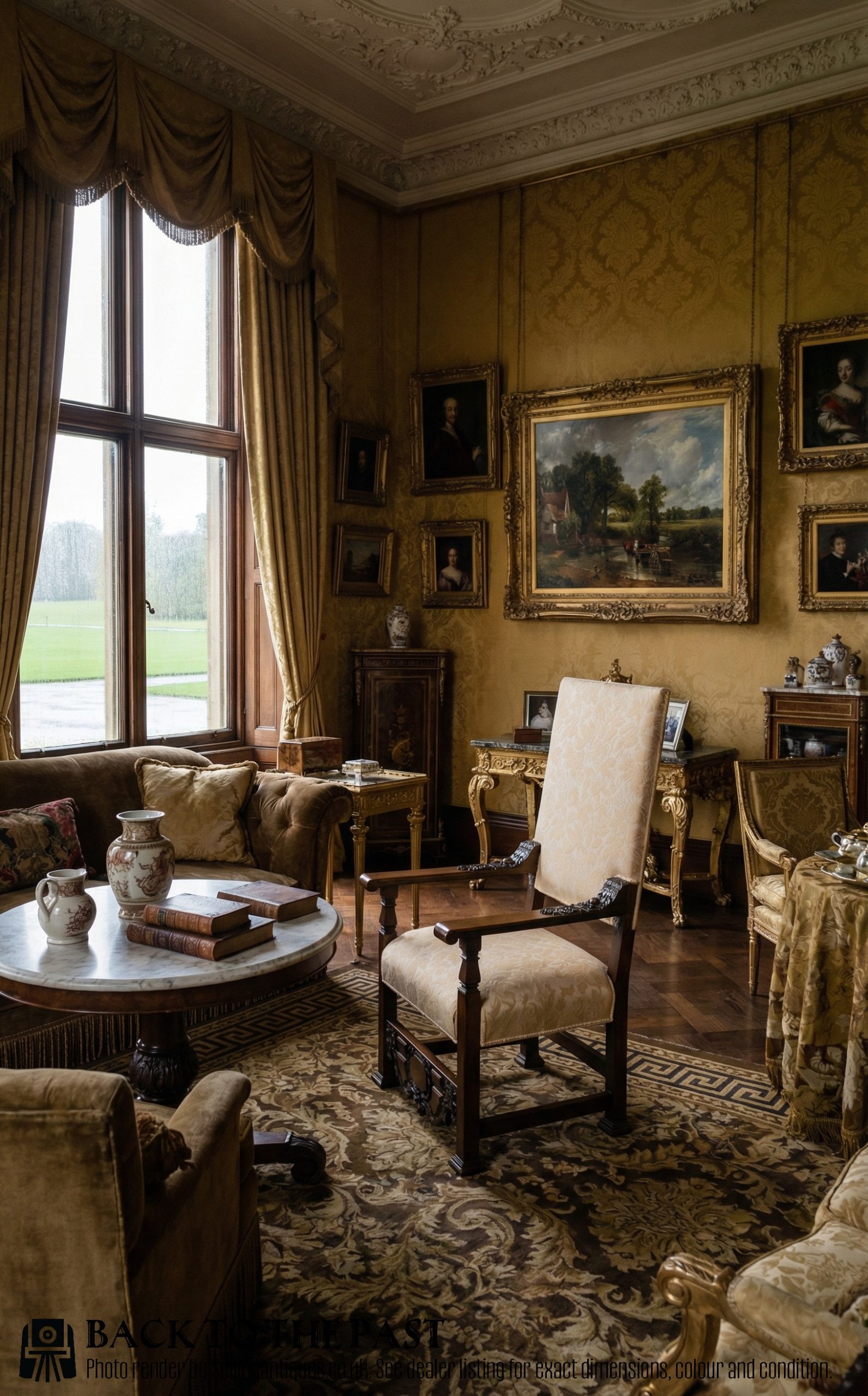Intricate hand-carved details adorn the arms and stretcher, reflecting the artisan’s skill and adding to the chair’s ornate presence. Built for both durability and elegance, it serves as a majestic statement piece, blending functionality with historical charm.