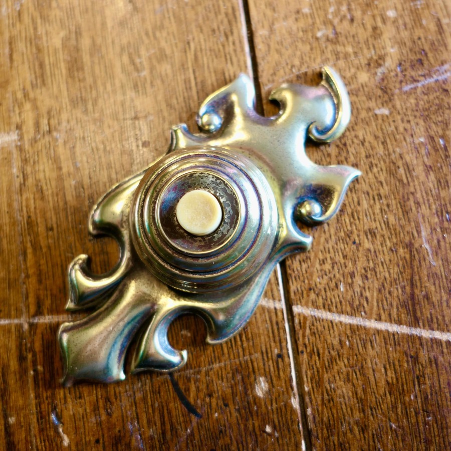 Superb Art Nouveau brass bell push This is a superb looking piece, it has a 19th century registration marks on the back. The condition both inside and out is very good and the bell push could be connected either to a battery or with the use of insulators even to an electric supply The best looking bell push and very stylish, it is 6” long and 3” wide GF69. Manufacture Date : 1880 Materials : Brass