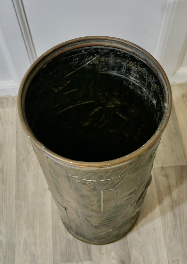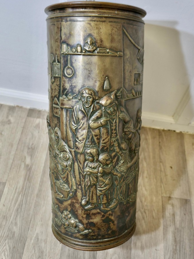 Superb French Brass Stick Stand, Umbrella Stand A very superb quality piece, the stand is round, it has a hand beaten brass design showing a rather mediaeval indoor country scene, the brass is darkened with age and it does have a few old dings This is a very old stand it is heavy and steady when in use It is 22” high, and 9” in diameter NG205 Manufacture Date : 19th Century Materials : Brass