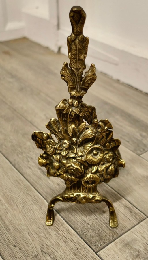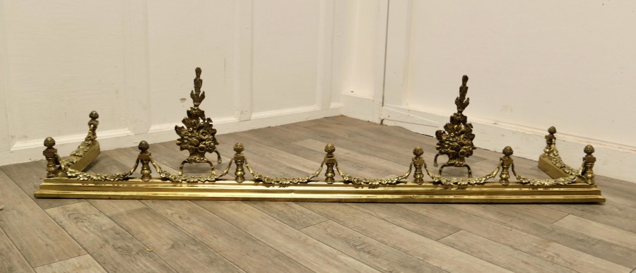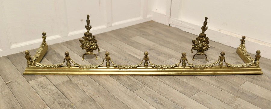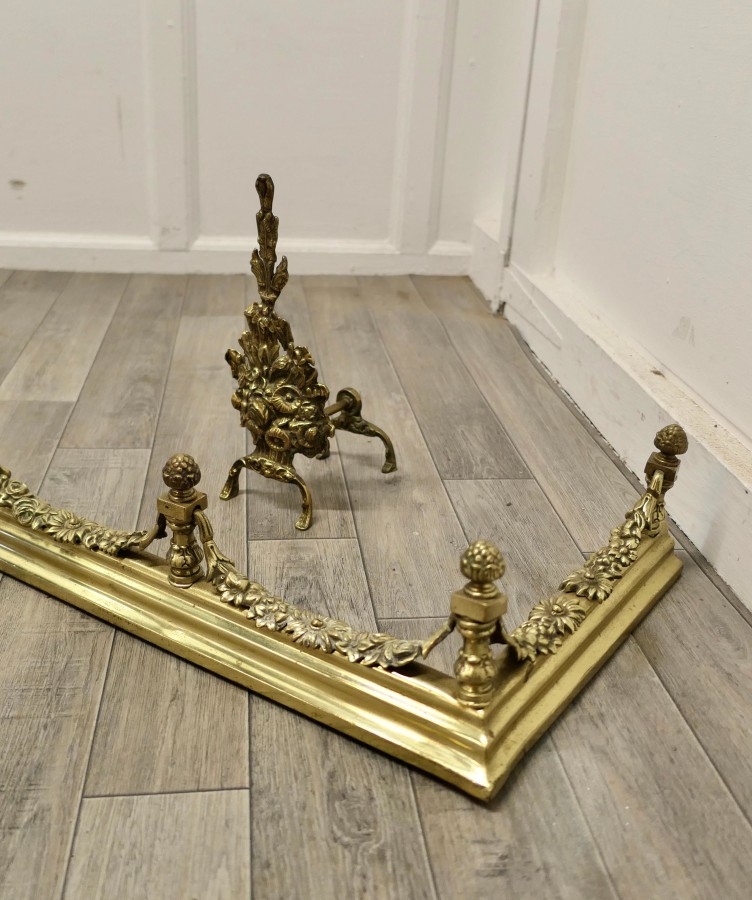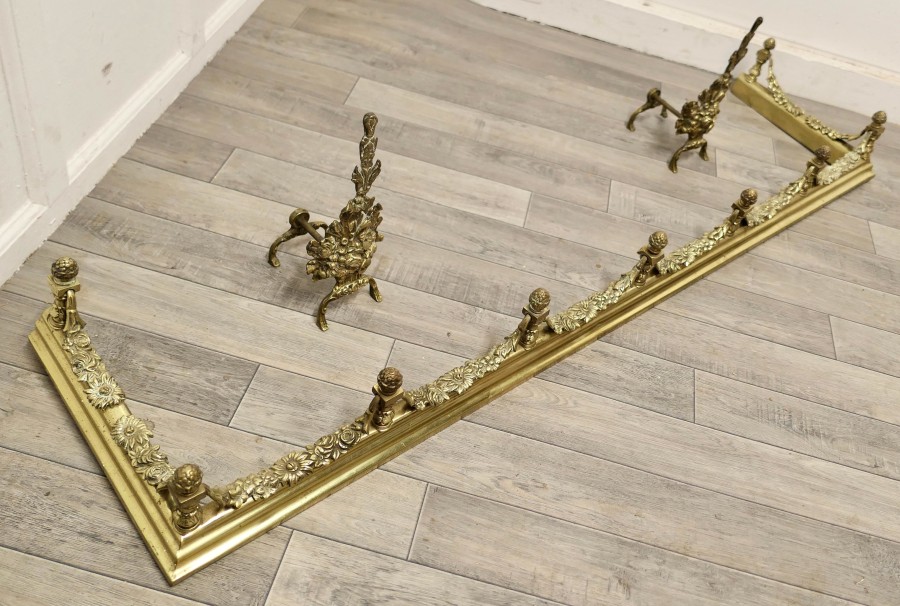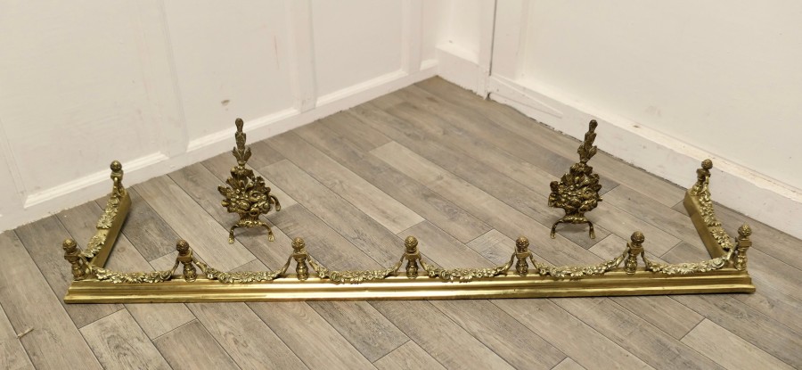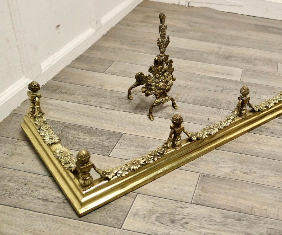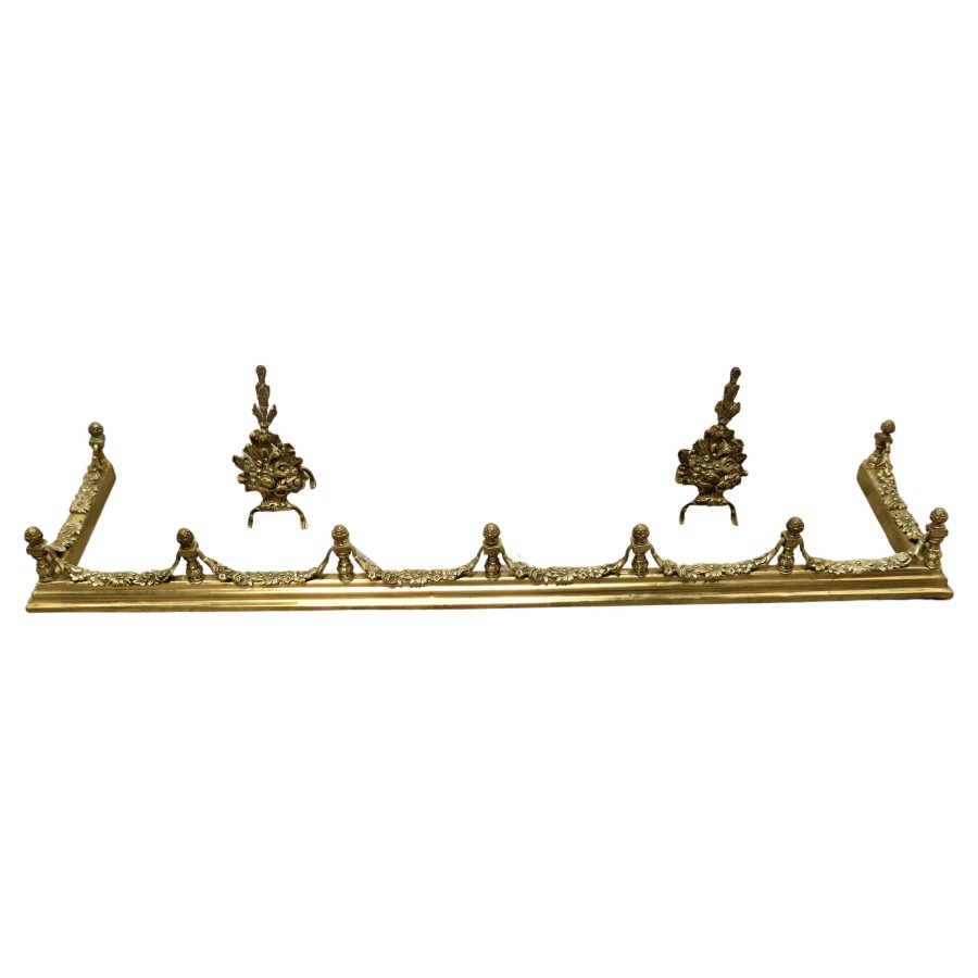 Superb quality and design 19th century heavy brass fender with andirons This is a superb quality Set it has elaborate spindles and garlands of leafy swags matching the floral decoration on the andirons, this is one of the heaviest quality and finest fender sets The Fender has delightfully crafted decoration worked in brass at both the front and along the sides The Fender and the andirons are in good condition the fender is is 7” high, and 58” long and 14” deep TJK147. Manufacture Date : 19th Century Materials : Brass
