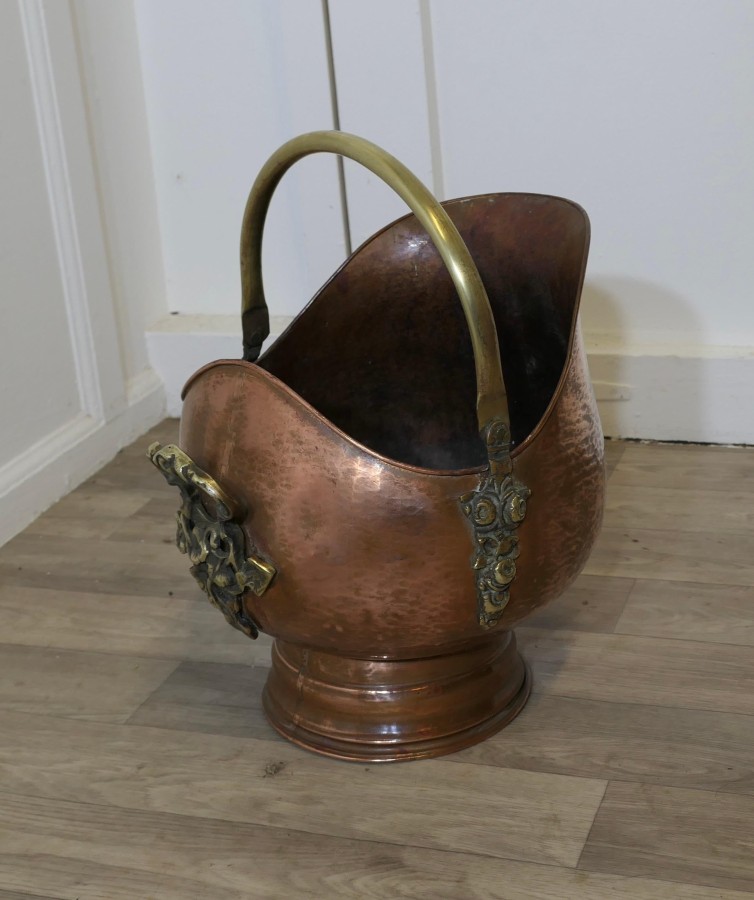 Superb Quality Arts and Crafts Copper Helmet Coal Scuttle This very top quality piece is a very unusual shape with heavy brass decoration to both the handle at the back and at the sides on the handle hinge The Scuttle is in good condition and ready to use, it has no faults just lots of character and is ready to go to work and grace your fireside at the same time The Scuttle is 17” tall, 14” long and 12” wide ZX179 Manufacture Date : 19th century Materials : Copper