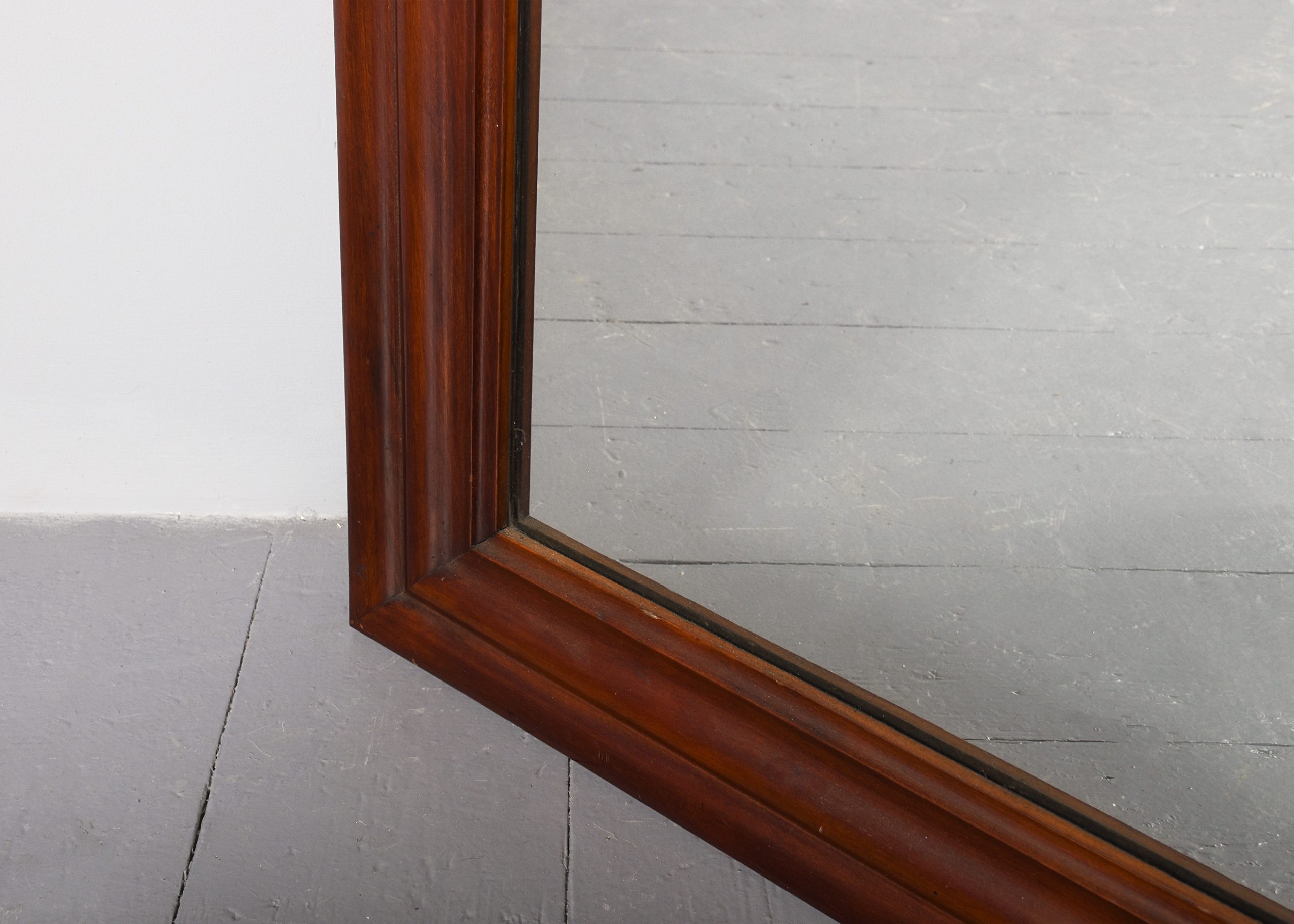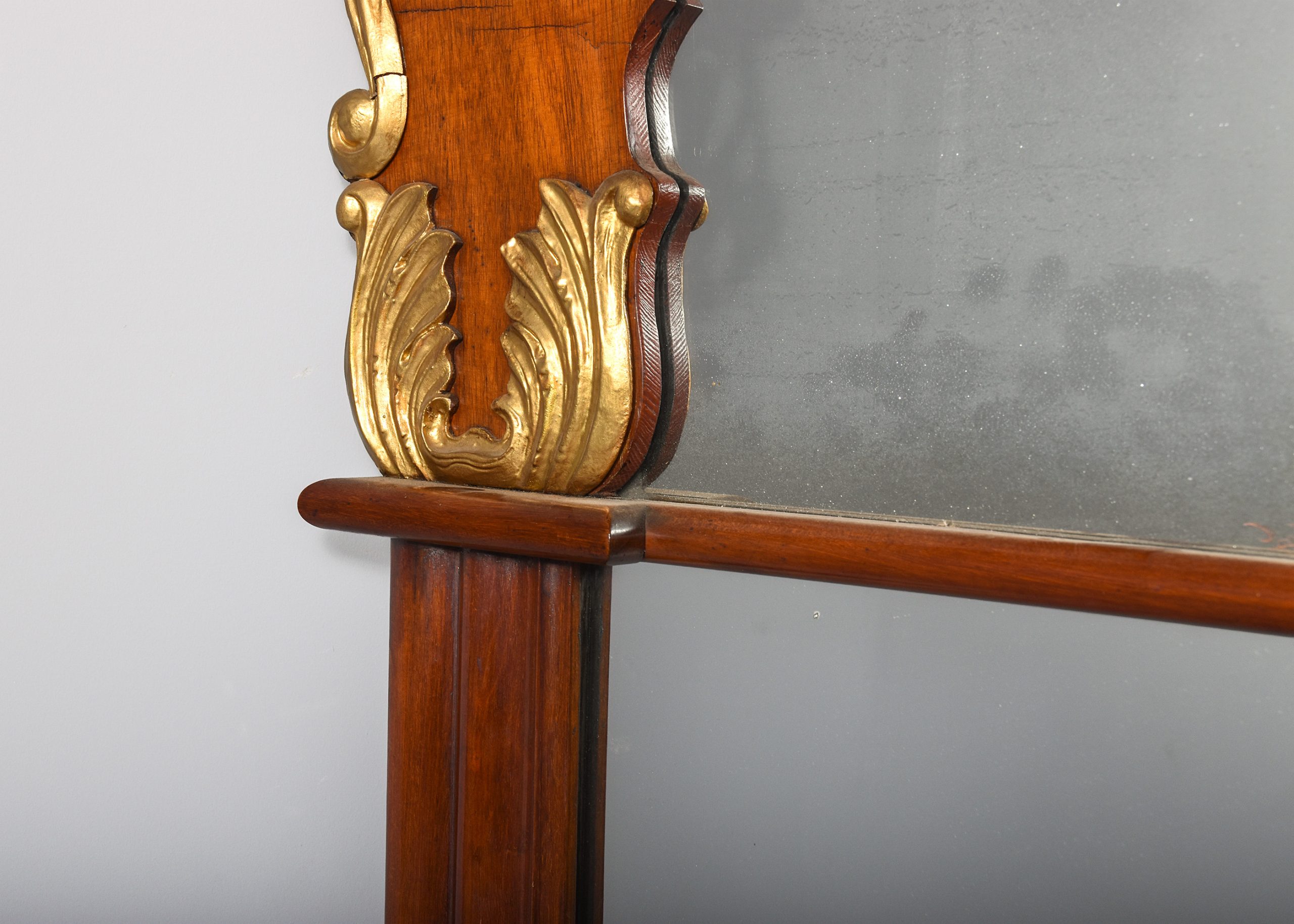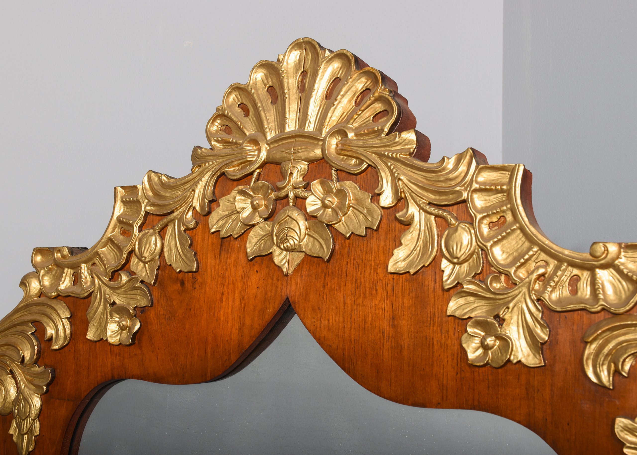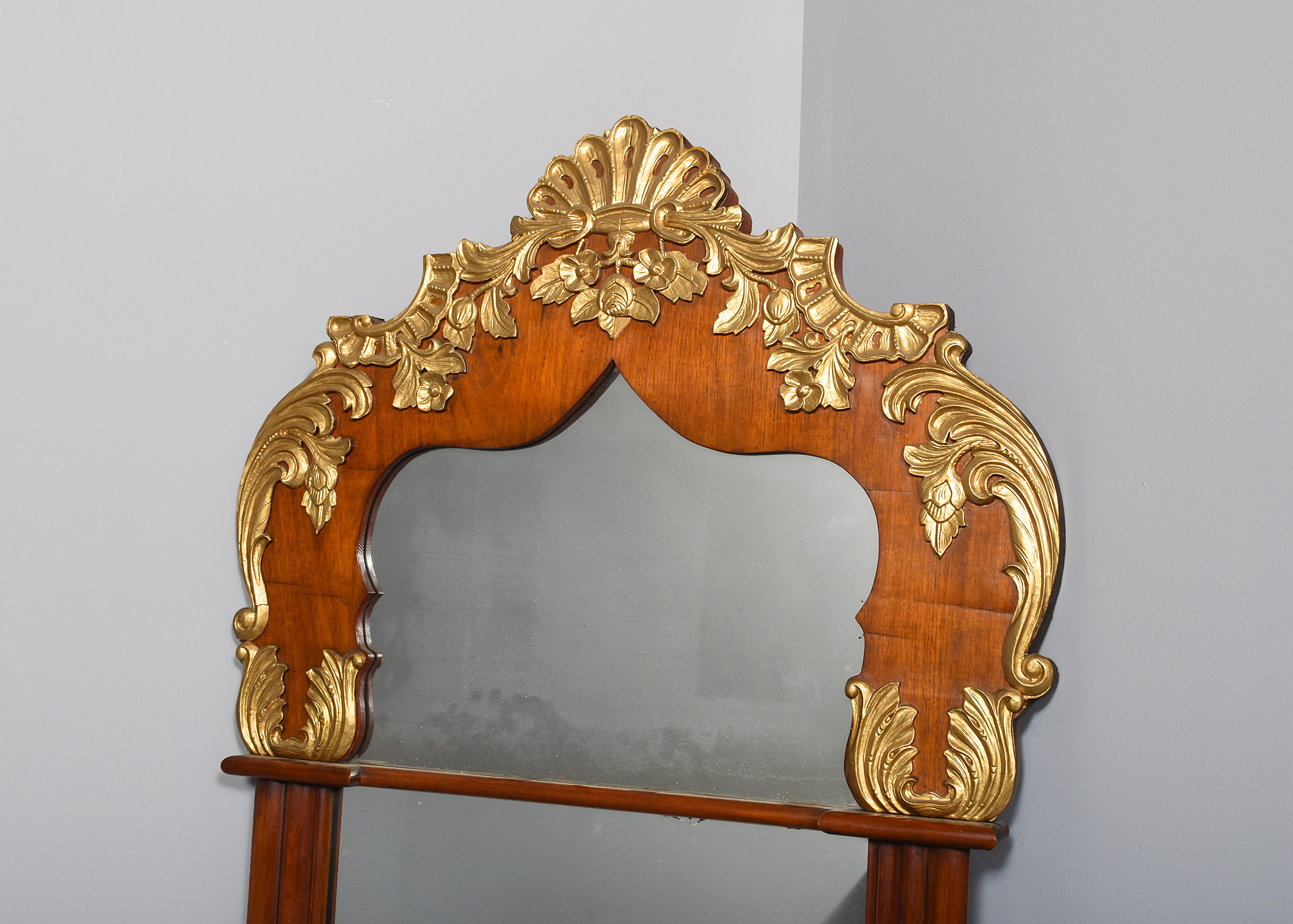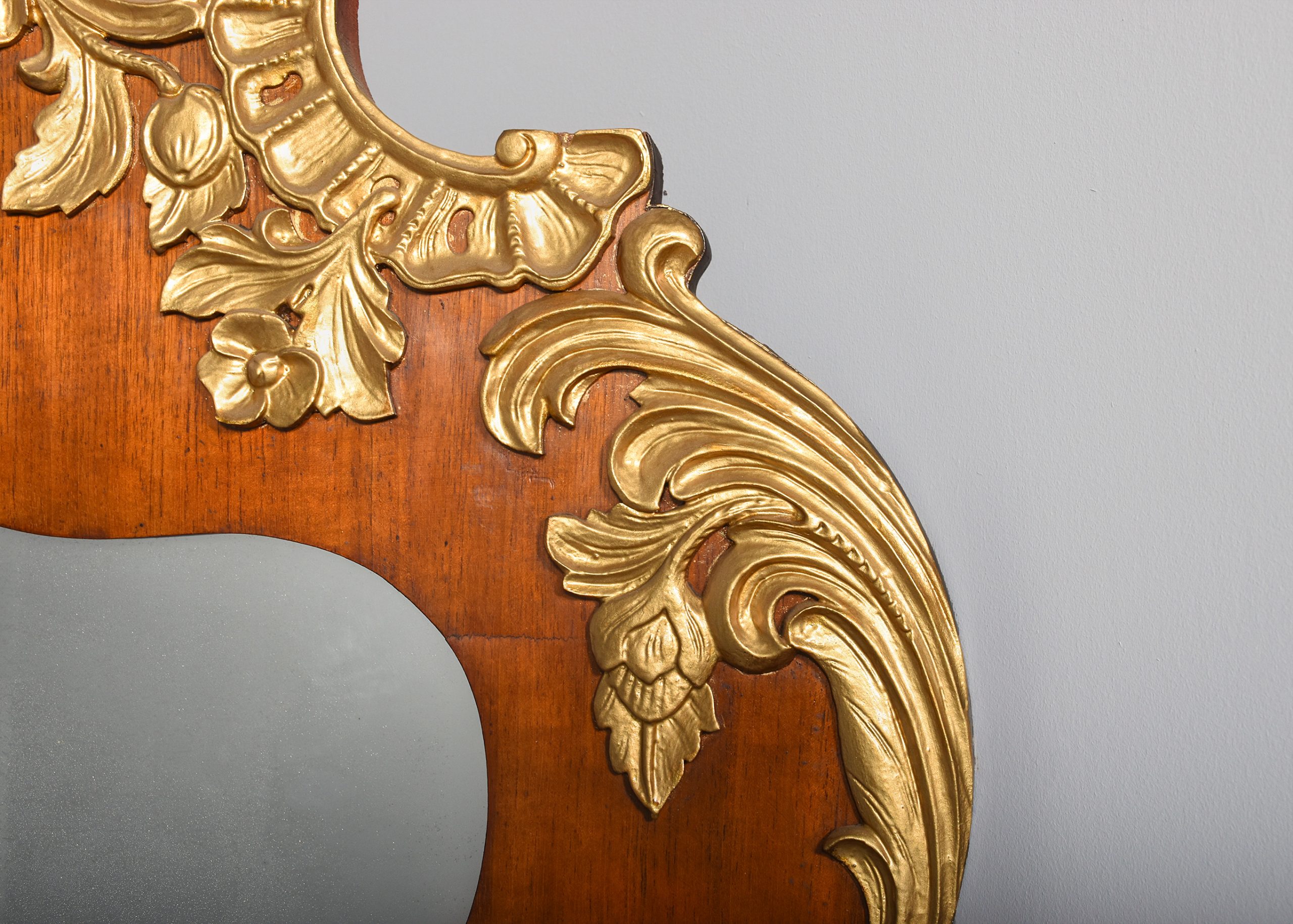 Circa 1870. Swedish mahogany and giltwood wall mirror with Rococo foliate carving to the shaped top section over a fluted frame to the rectangular base mirror. Solid back.