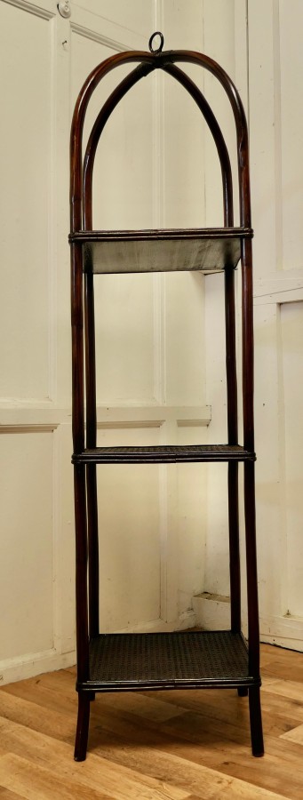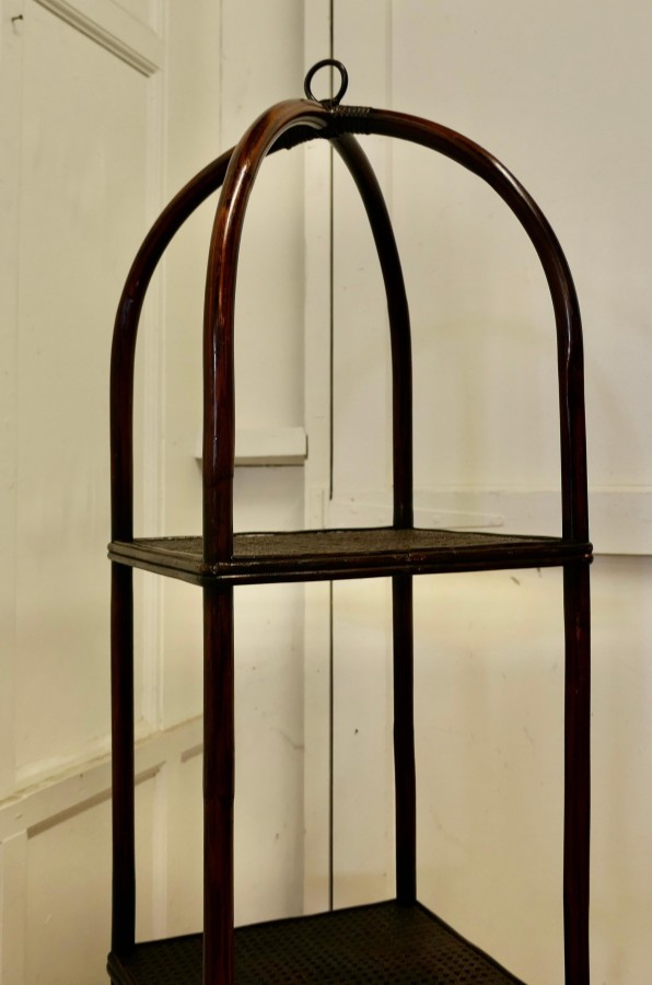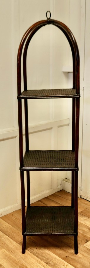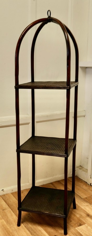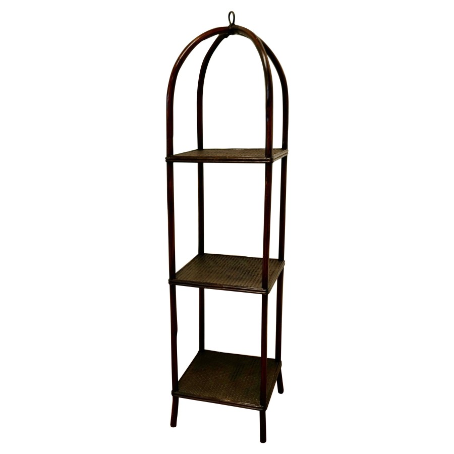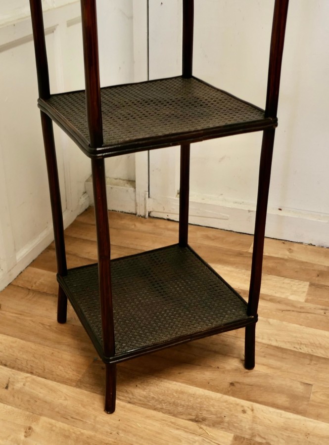 Tall Bamboo and Rattan What Not Shelf This is a free standing 4 sided Shelf Unit , made in the very Fashionable Bamboo, and it has 3 square rattan shelves The Stand is 64” high, 16” square THM192. Manufacture Date : 1960 Materials : Bamboo