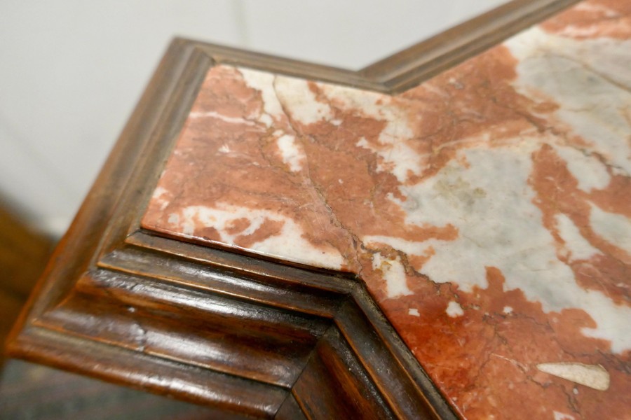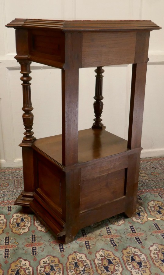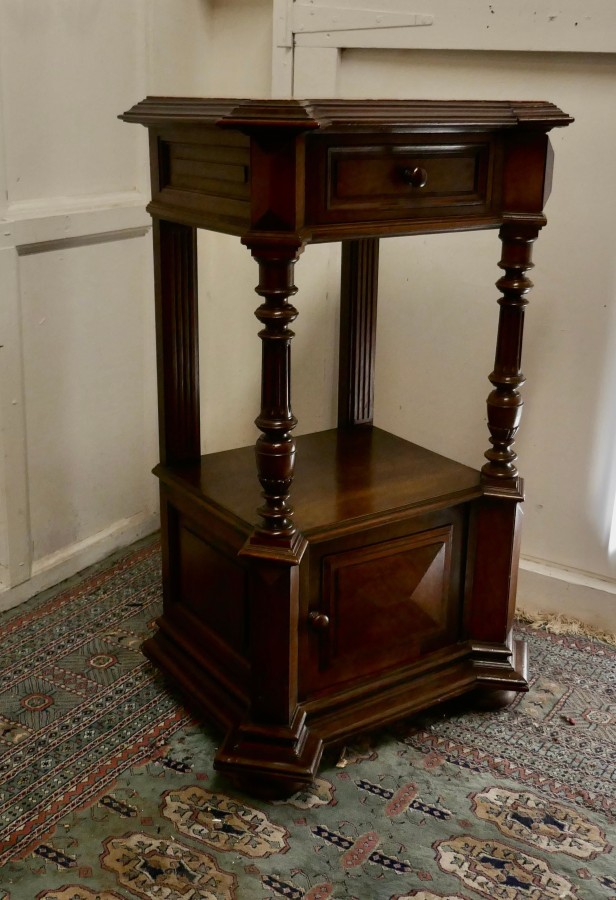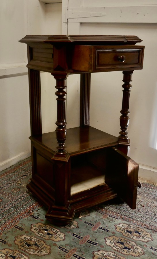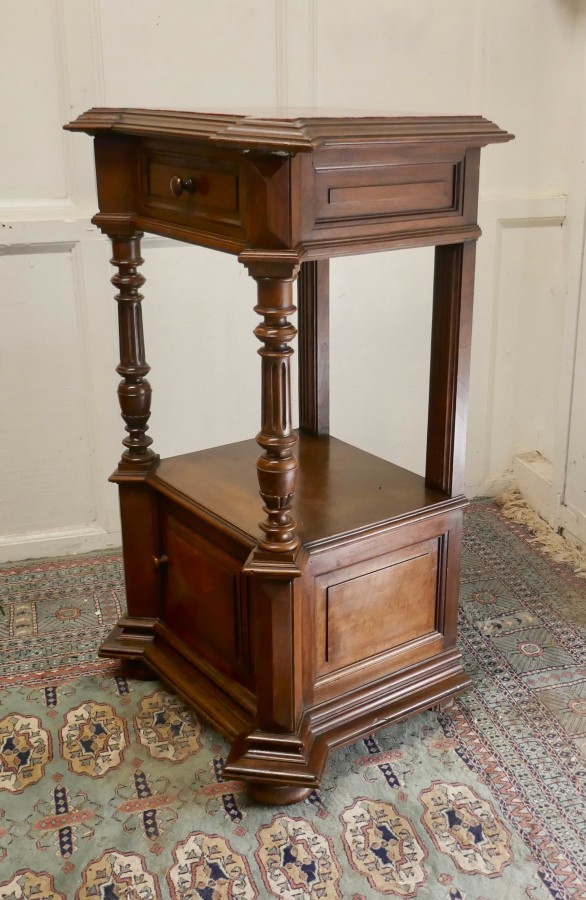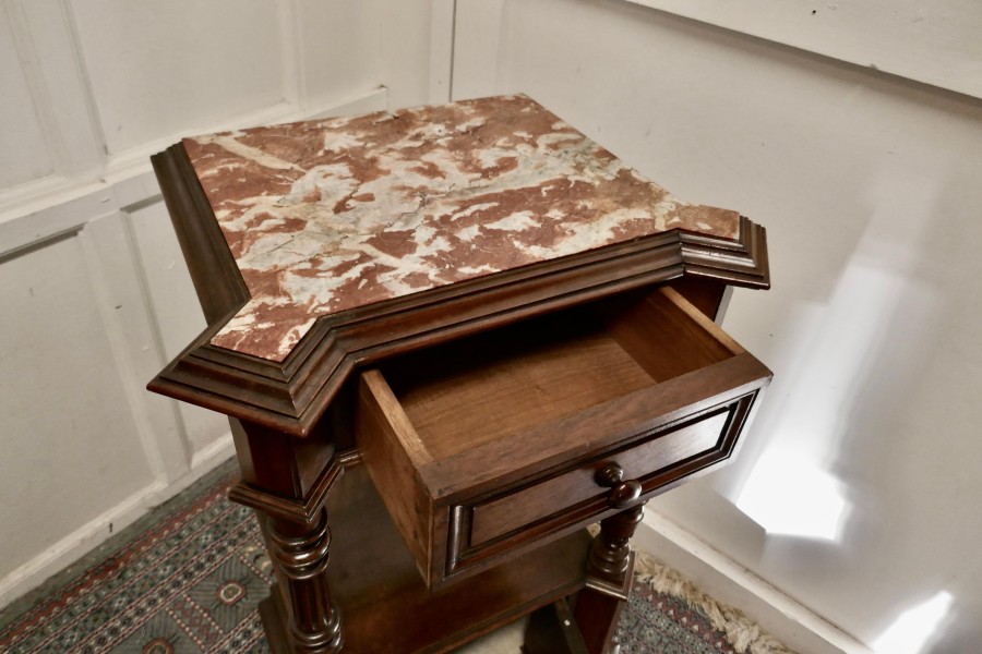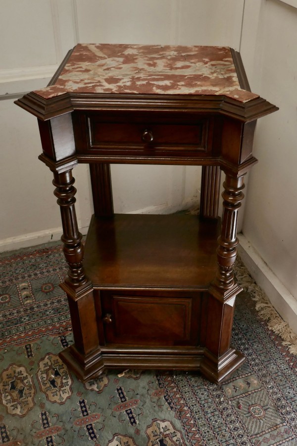 Tall French walnut side cabinet This is a very attractive piece of furniture, the cabinet has a small drawer at the top with a between tier and a cupboard beneath, these are in an unusual wing shape with turned fluted columns and a dark pink marble top. The cabinet is in good sound condition, it is fair to point out that there appears to be an old repair to the marble, this is almost unnoticeable as it is in a fissure of the marble grain The cabinet is 38” tall, 25” wide and 19” deep TNV260. Manufacture Date : 1880 Materials : Walnut