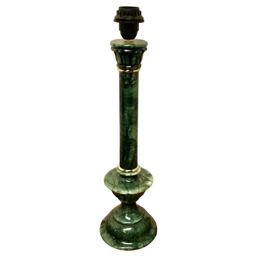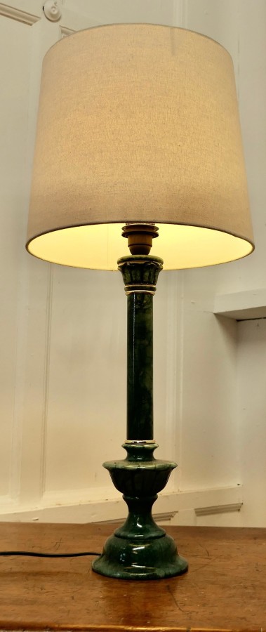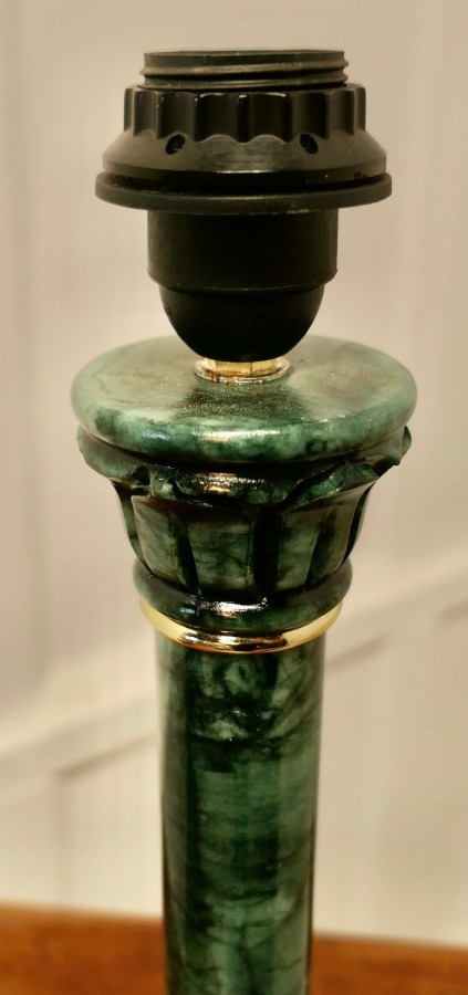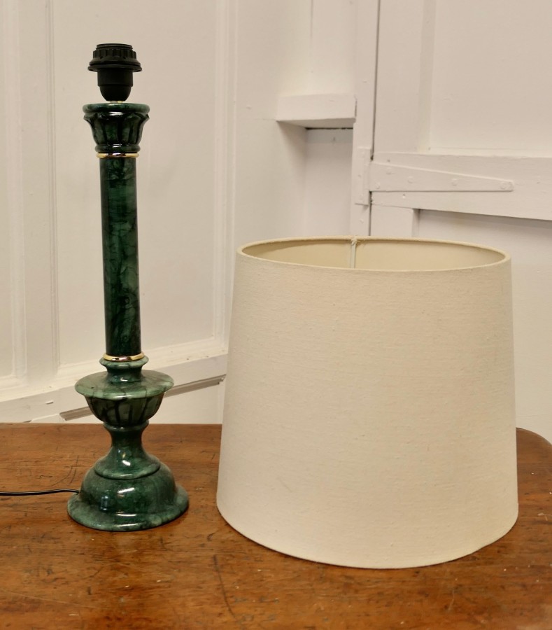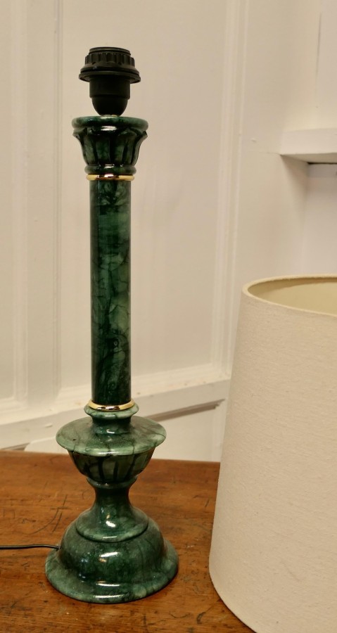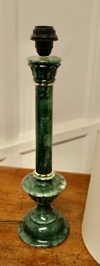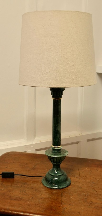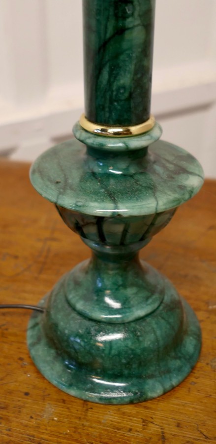 Tall Green Marble Table Lamp This is a very heavy piece it is made in solid marble, the lamp has a shaped carved central column with Superb Marbling and gold trim This is a very attractive piece it in good condition for its age and the wiring is good, I have shown it with a linen shade this can be included if requested The Lamp is 22” tall and stands on a 6” round base SW157 Manufacture Date : 1960 Materials : Marble