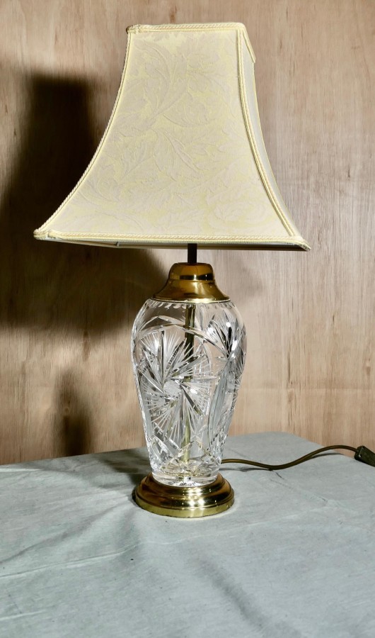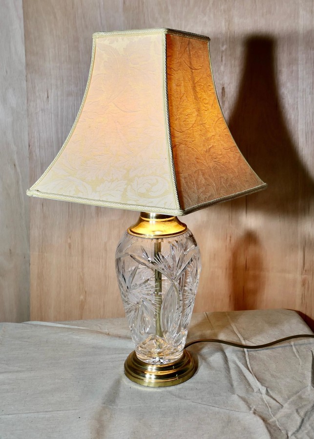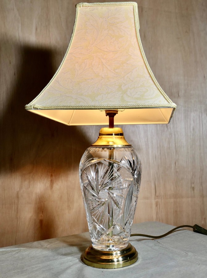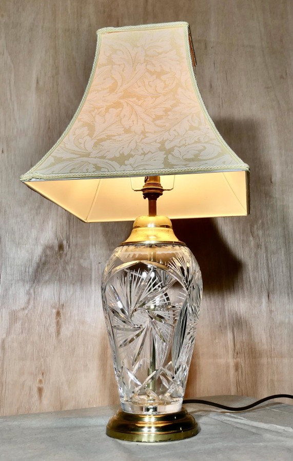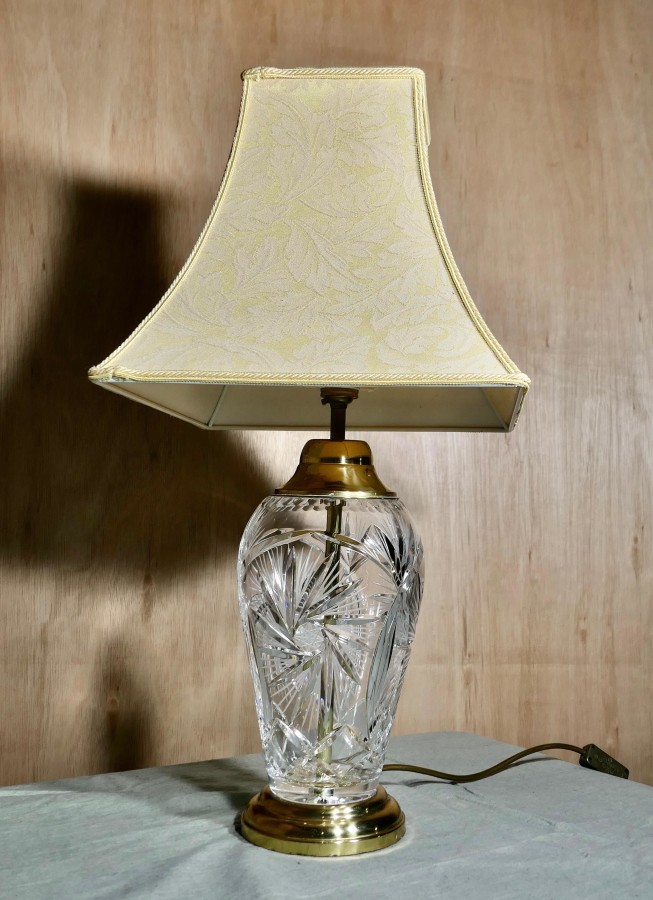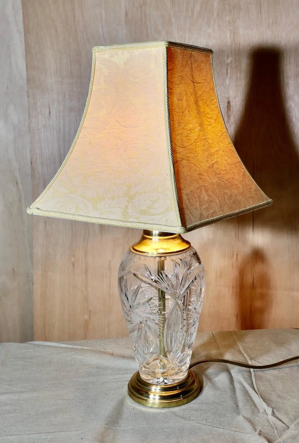 Tall Hand Star Cut Glass and Brass Table Lamp This is a very pretty piece, the base and collar of the lamp is made in Brass, the body of the lamp is bright diamond cut pinwheel design with a detailed star at the centre the design All the wiring is new, I have shown it with a square brocade lampshade which can be included The lamp and shade are 25” high and the shade is 12”square CS252 Manufacture Date : 1950 Materials : Crystal
