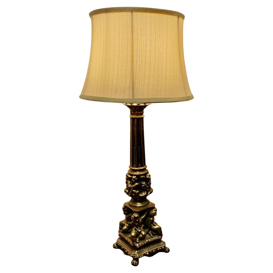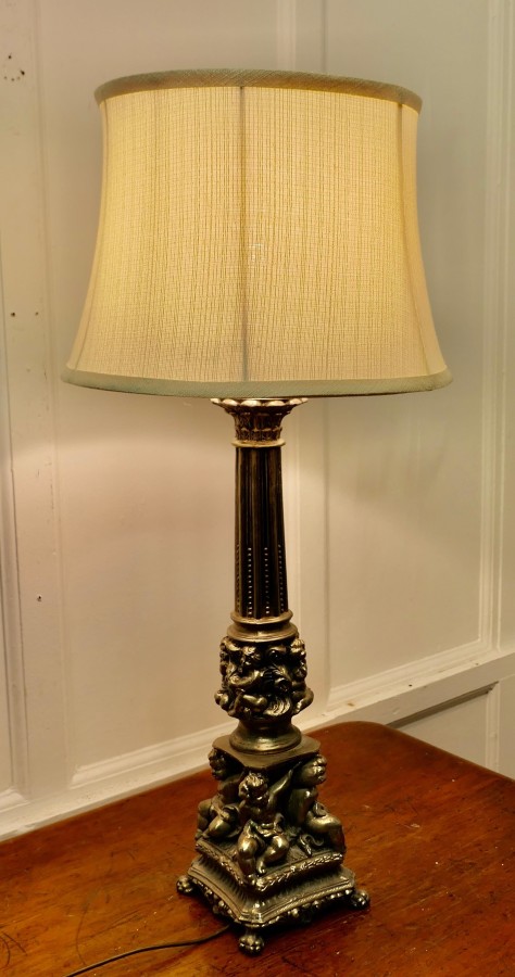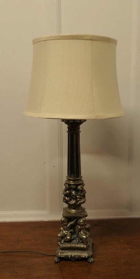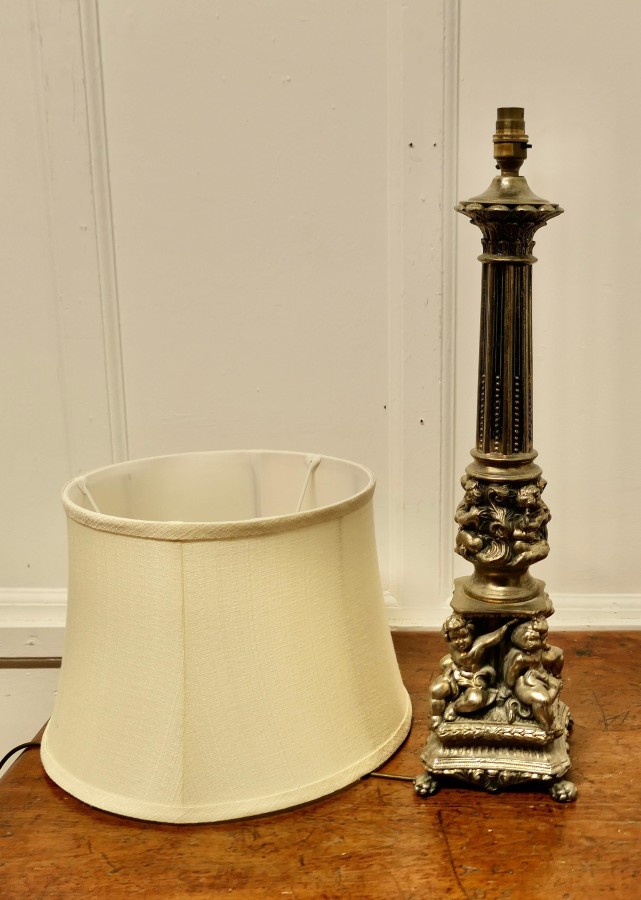 Tall Silver Gilt Metal Table Lamp with Putti This lamp is made in silver gilt metal, and it has a Corinthian column to the centre with playful cherubs around the stepped base The Lamp shade can be included if requested The lamp is 25” tall, and 6” square TSW54 Manufacture Date : 1920 Materials : Metal