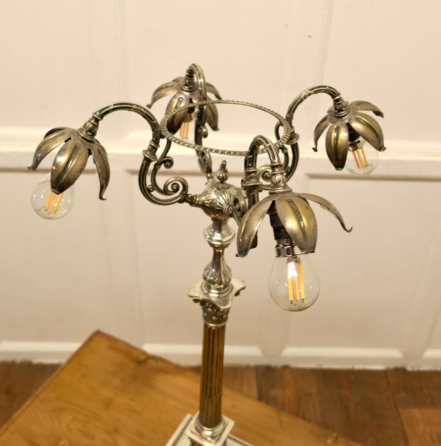Tall Silver Plated Table Candelabra Sideboard Lamp This is a very unusual piece, the lamp is made in heavy silver-plate, it is set on a square stepped base with a tall column supporting 4 lamps set with petal-like shades The lamp has new wiring and in very good antique condition The lamp is 29” tall, 17” across and 7.5” square at the base VY41 Manufacture Date : 1920 Materials : Silver-plate