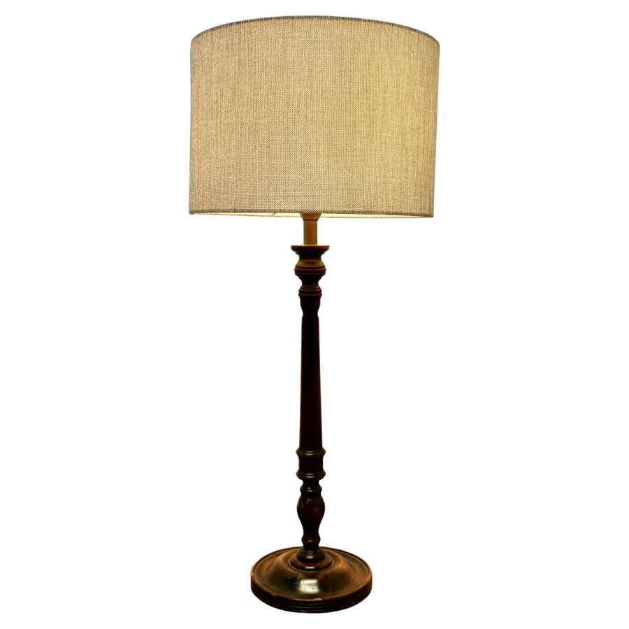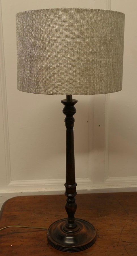 Tall Turned Dark Wood Table Lamp A good attractive table lamp made in beech in a dark finish, tall and sturdy and it comes with a silver/grey linen covered shade The Lamp is 21” high, 7” diameter made the shade is 12” in diameter SW101 Manufacture Date : 1920 Materials : Beech