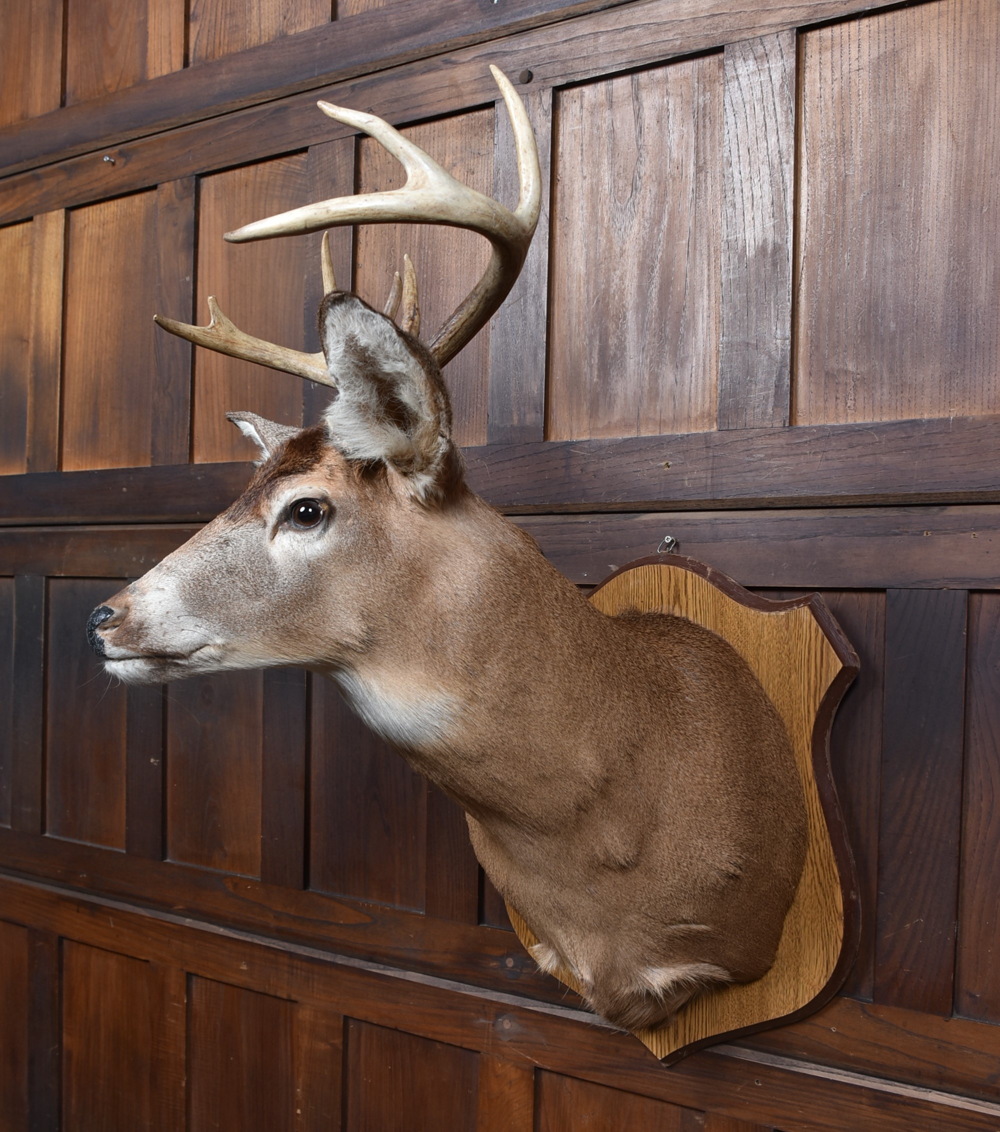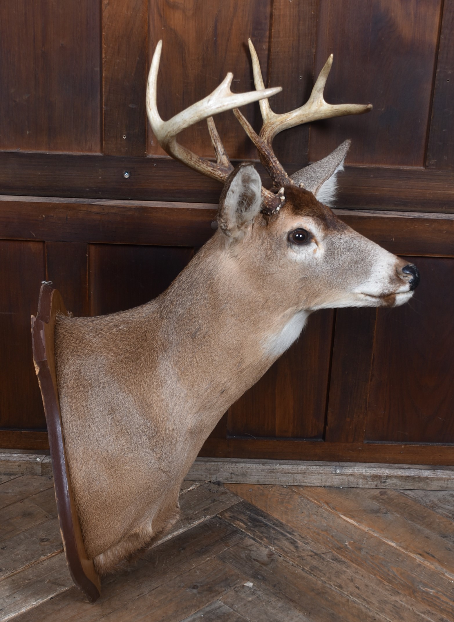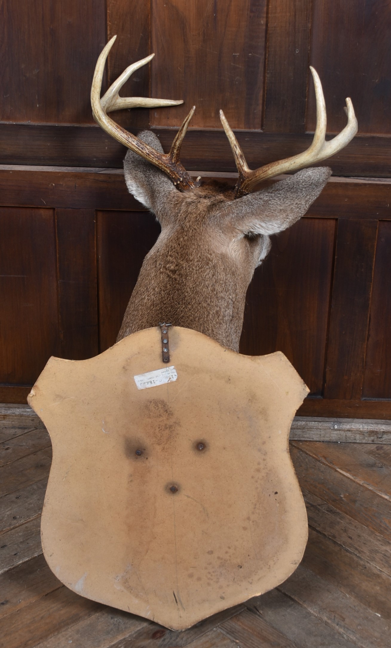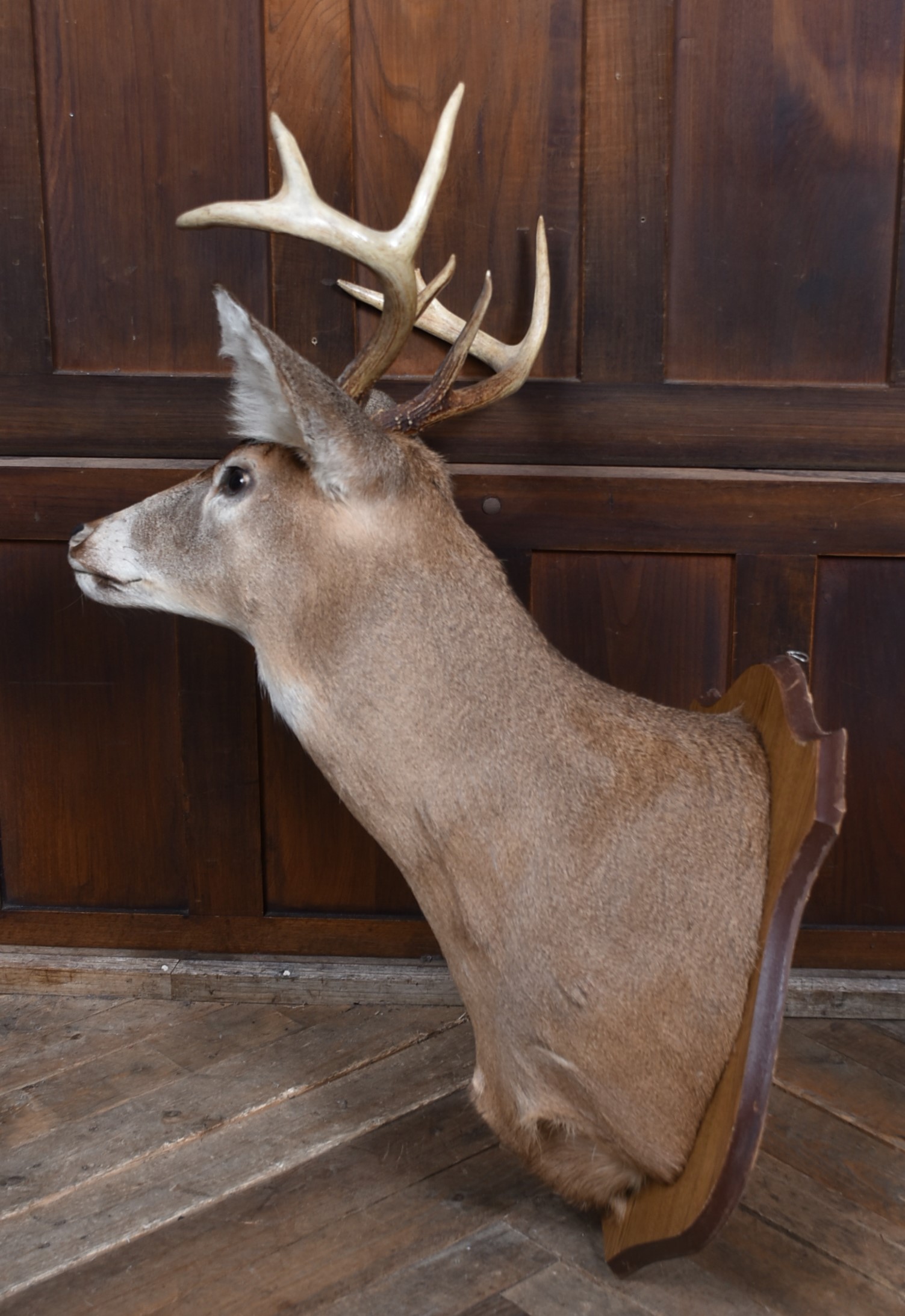 A striking taxidermy whitetail deer shoulder mount, beautifully presented on a shield shaped wooden backboard. The mount displays a fine mature buck with well‑formed antlers, natural colouring, and lifelike detailing to the face, ears, and coat. The craftsmanship is confident and sympathetic, giving the piece strong presence without feeling overly dramatic. The wooden shield‑shaped plaque complements the warm tones of the fur and makes the mount easy to hang and display. The reverse retains its original fixing plate and label. A classic decorative piece for a lodge‑style interior, country house, bar, study, or eclectic wall display — full of character and traditional charm.