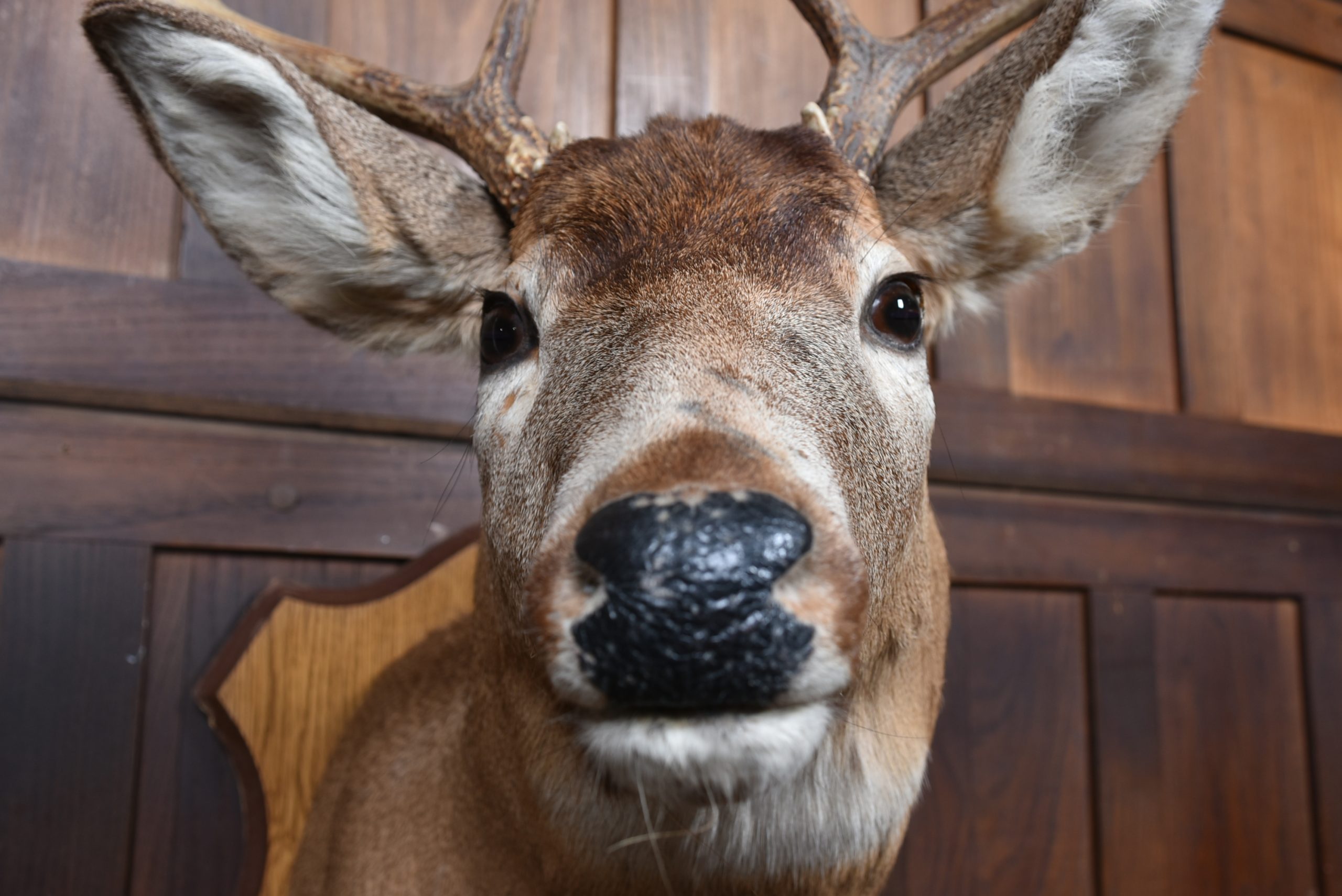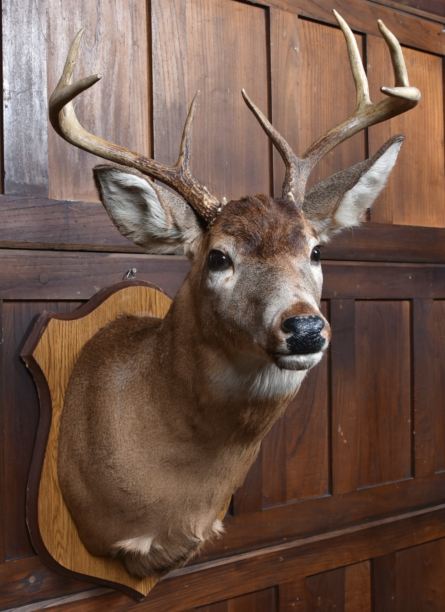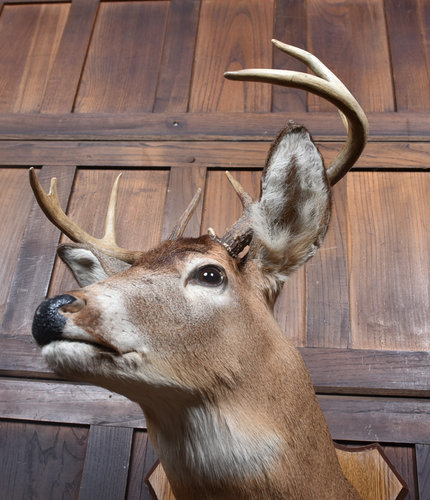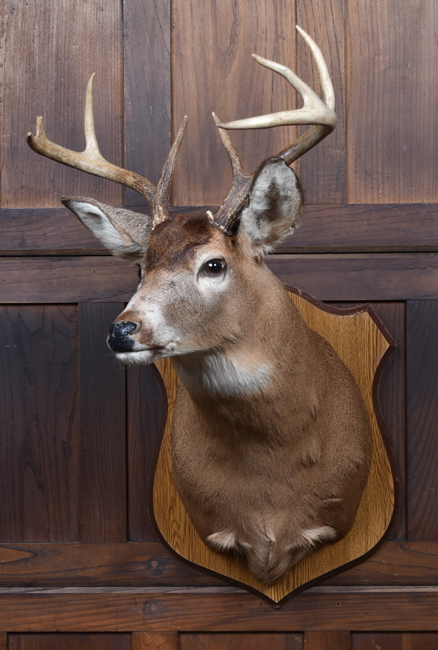 A striking taxidermy whitetail deer shoulder mount, beautifully presented on a shield shaped wooden backboard. The mount displays a fine mature buck with well‑formed antlers, natural colouring, and lifelike detailing to the face, ears, and coat. The craftsmanship is confident and sympathetic, giving the piece strong presence without feeling overly dramatic. The wooden shield‑shaped plaque complements the warm tones of the fur and makes the mount easy to hang and display. The reverse retains its original fixing plate and label. A classic decorative piece for a lodge‑style interior, country house, bar, study, or eclectic wall display — full of character and traditional charm.