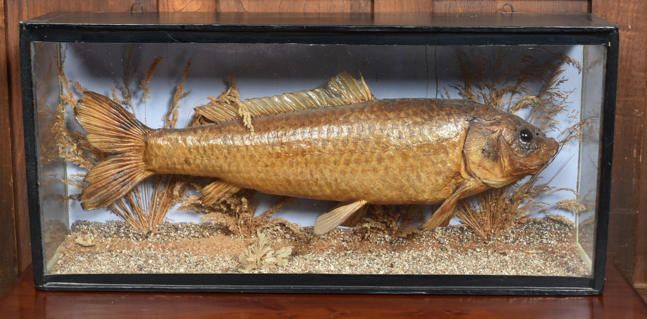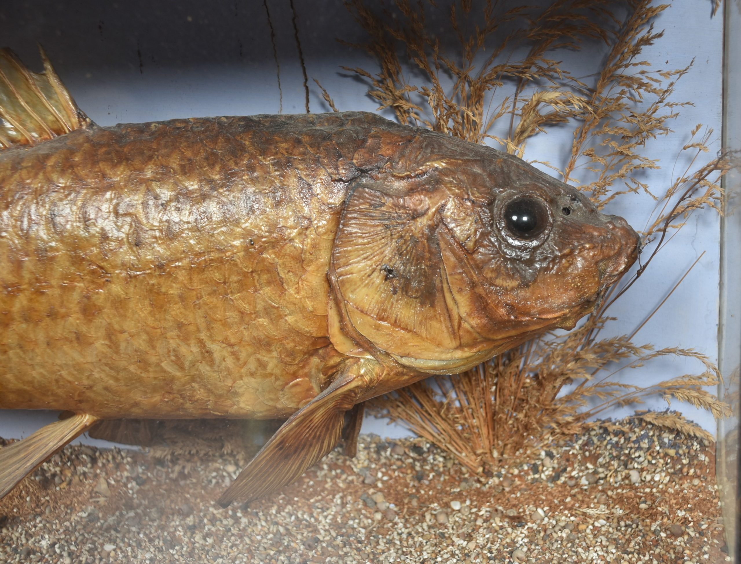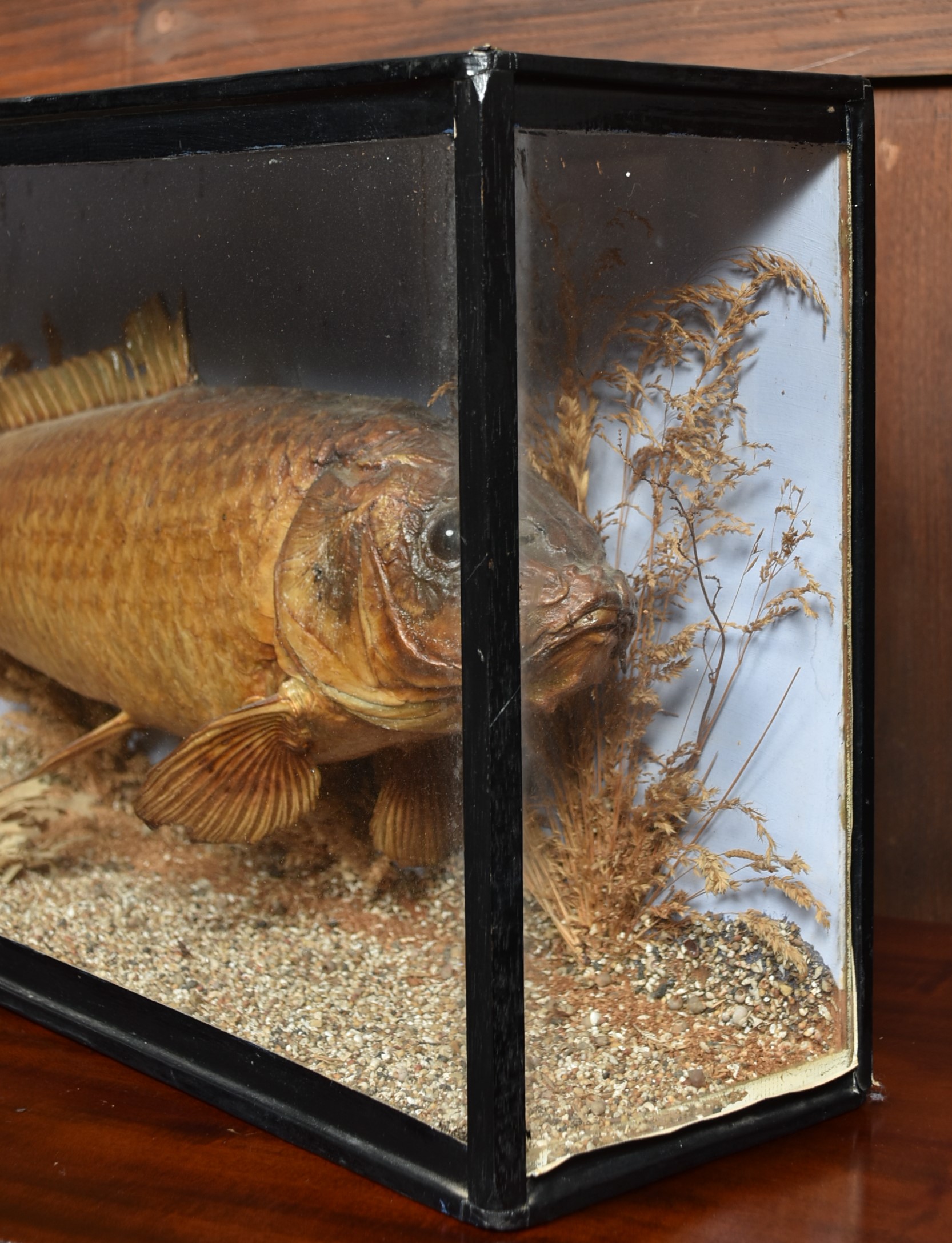 A beautifully preserved vintage taxidermy carp, showcased in a glazed case with a naturalistic aquatic setting. The fish is mounted in a lifelike pose, its golden-bronze scales catching the light with subtle iridescence. Dried aquatic plants and gravel line the base, evoking the quiet drama of a riverbed scene. A striking decorative piece that captures the grace and detail of this freshwater species.