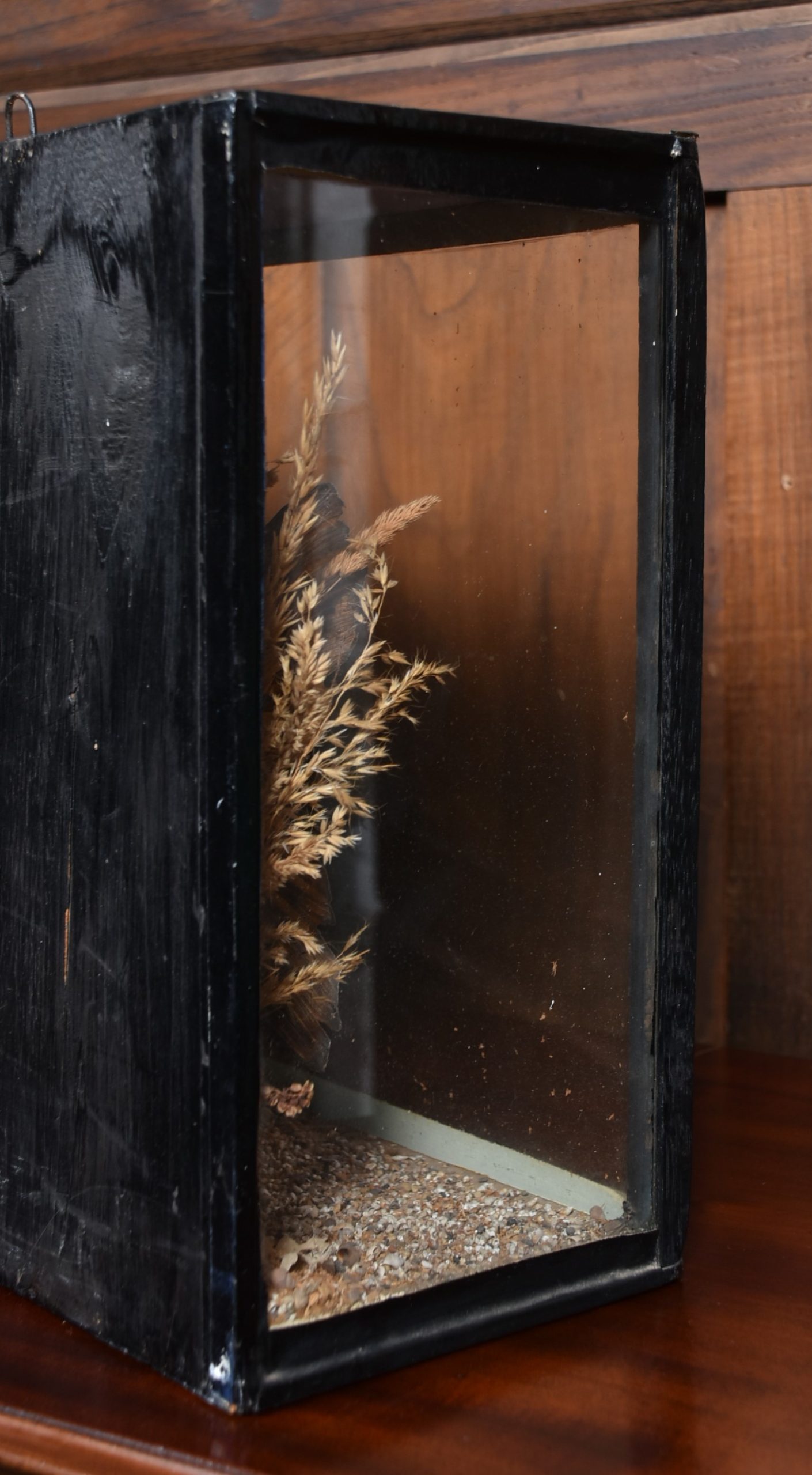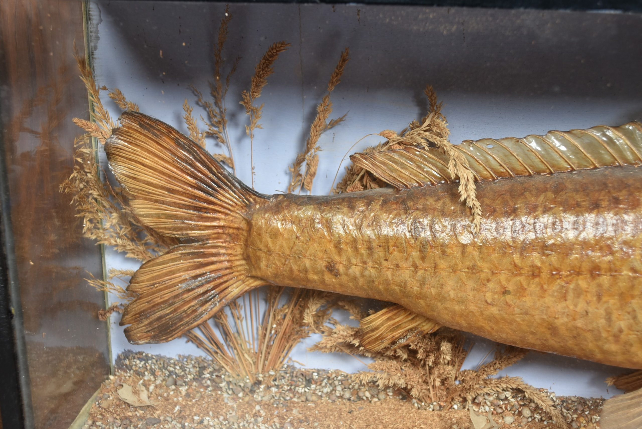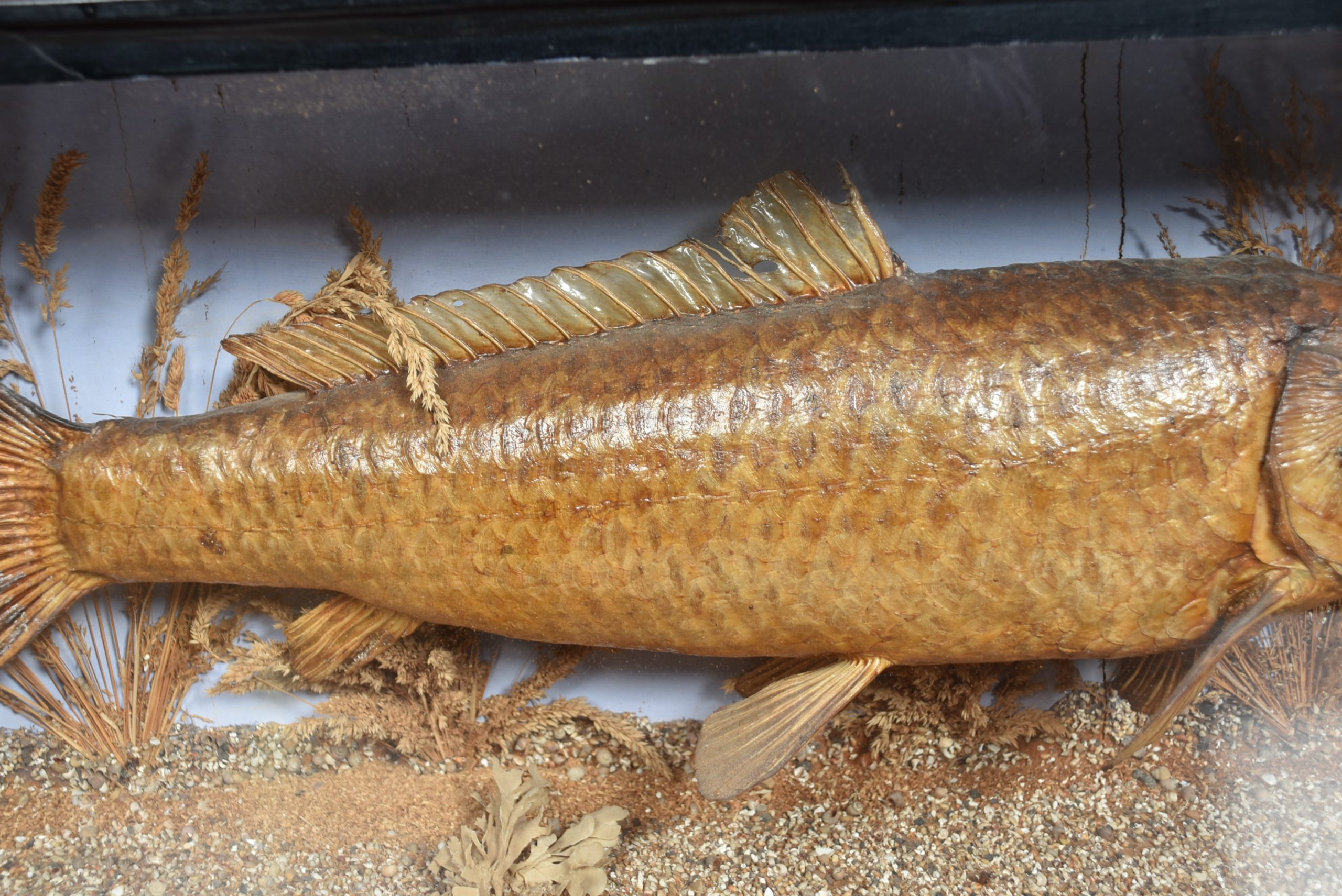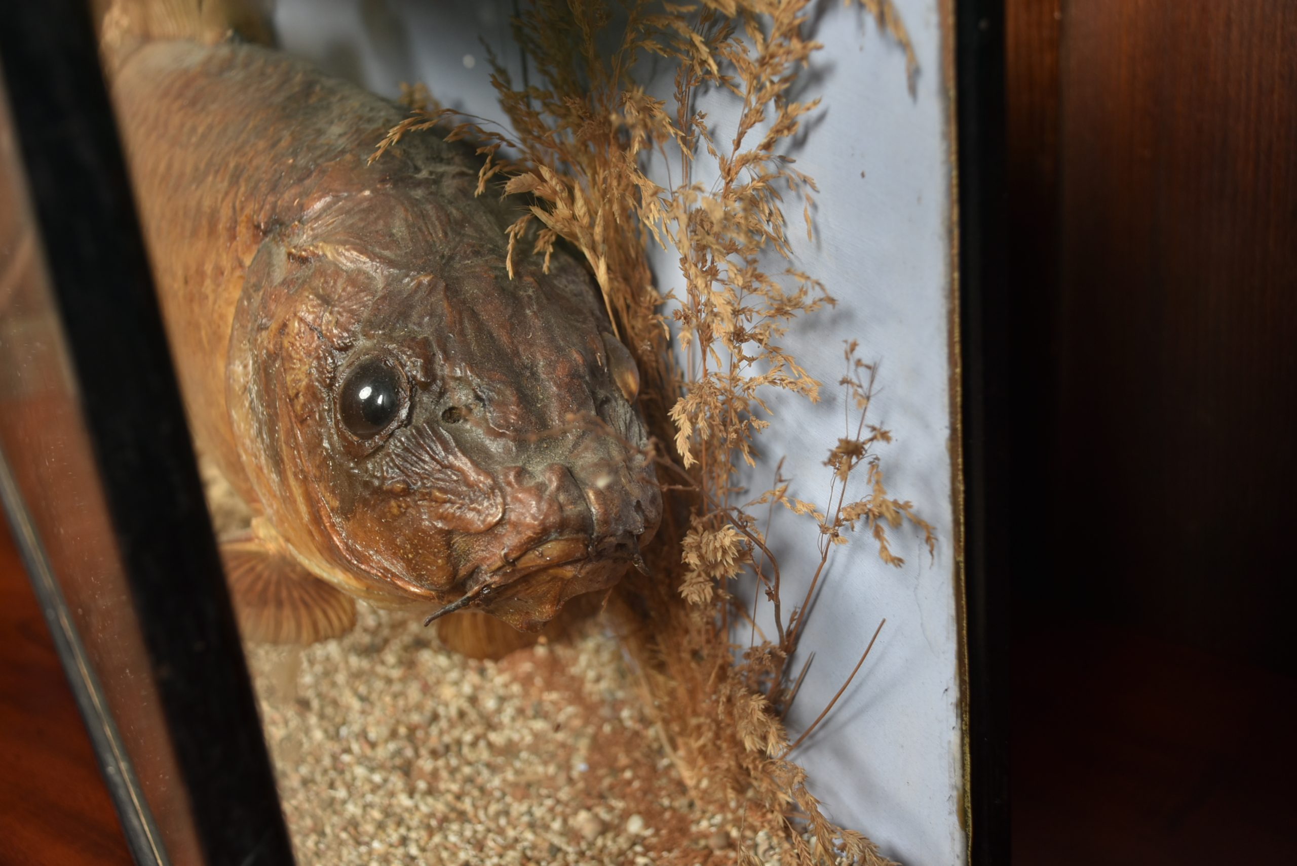 A beautifully preserved vintage taxidermy carp, showcased in a glazed case with a naturalistic aquatic setting. The fish is mounted in a lifelike pose, its golden-bronze scales catching the light with subtle iridescence. Dried aquatic plants and gravel line the base, evoking the quiet drama of a riverbed scene. A striking decorative piece that captures the grace and detail of this freshwater species.