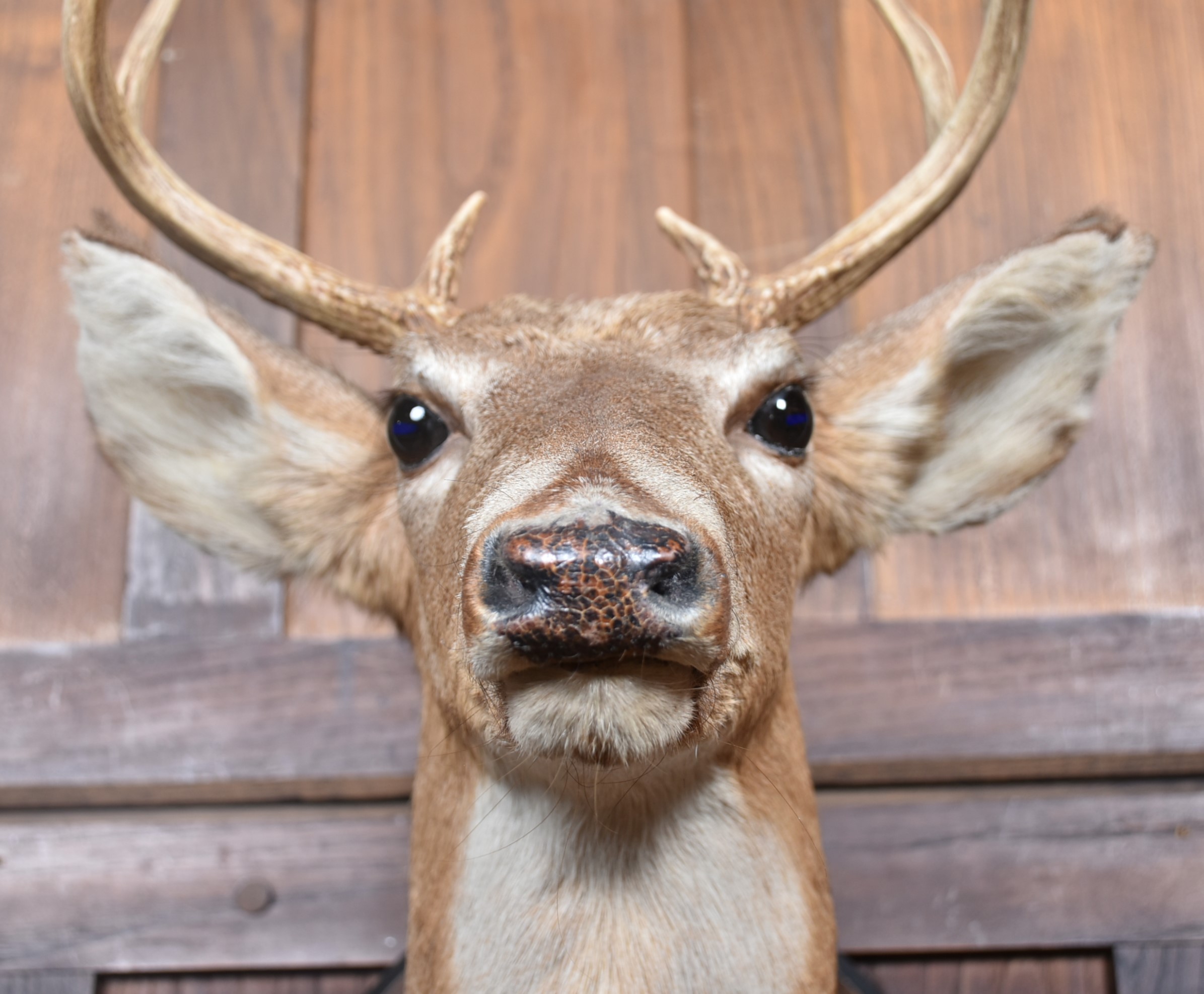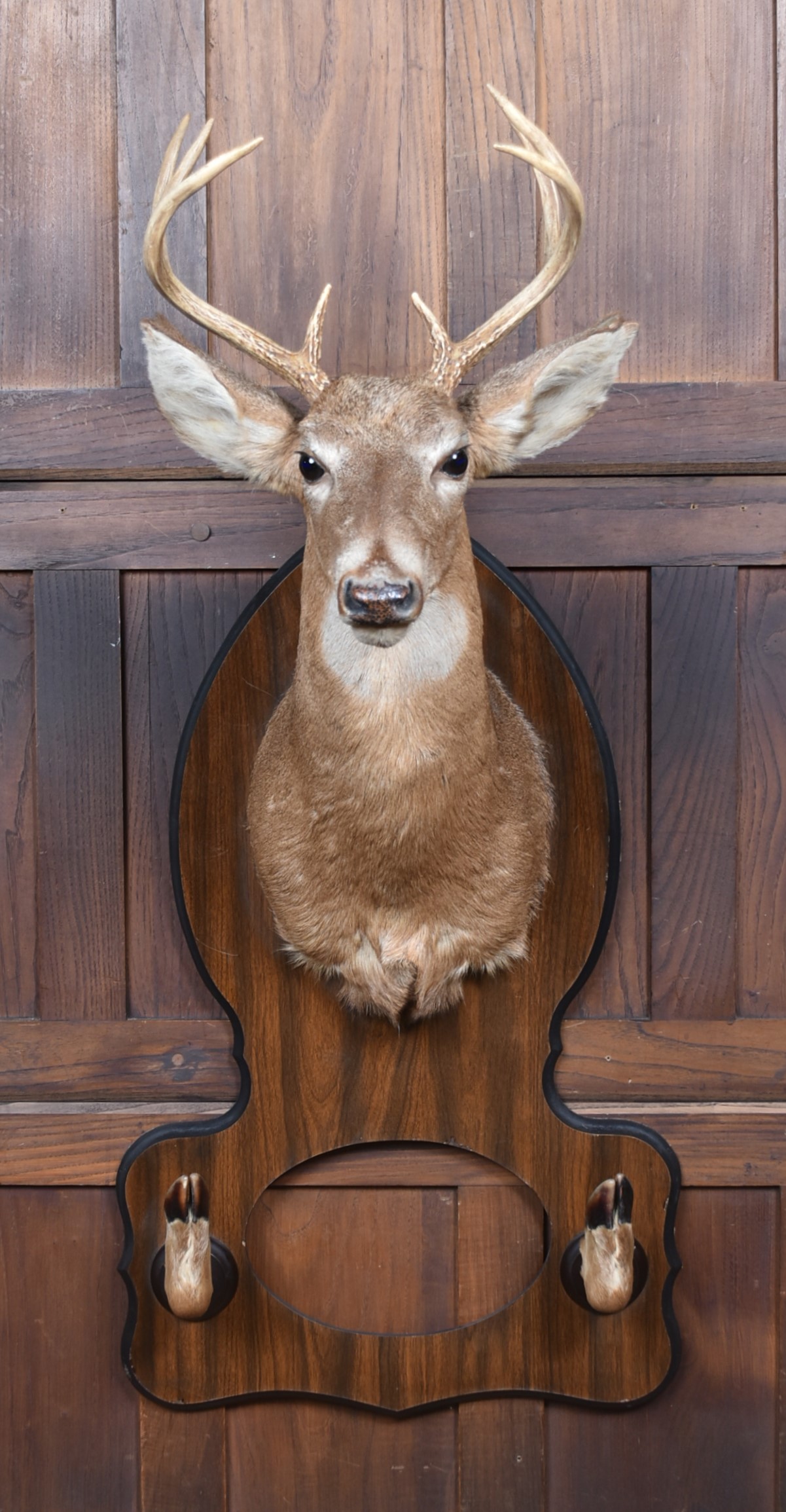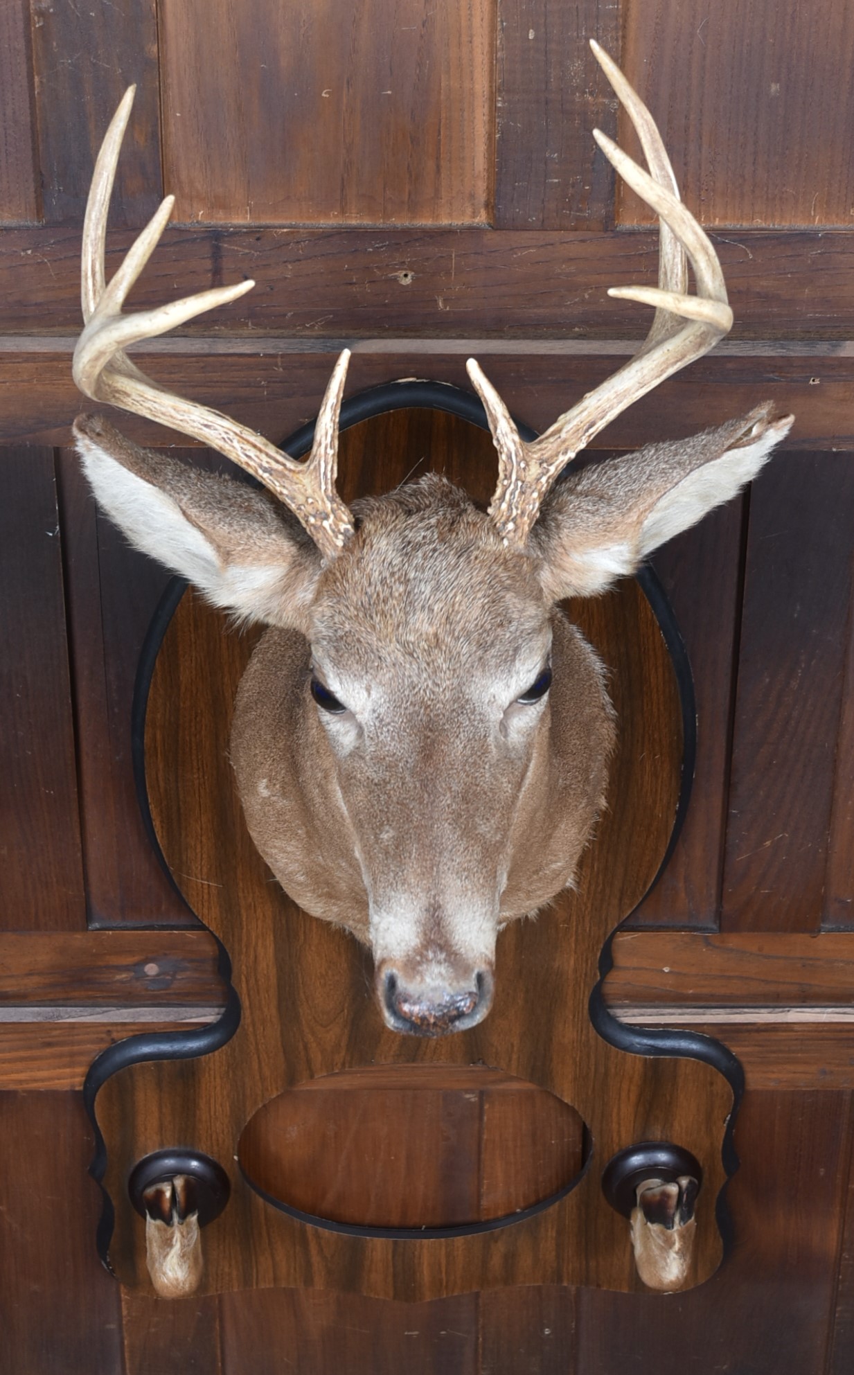 A well‑mounted taxidermy whitetail deer head, displaying an impressive 8‑point antler set and naturalistic colouring throughout. Presented on a shaped wooden plaque with matching mounted hooves, this traditional sporting trophy has strong lodge‑style character and makes a striking decorative feature. A classic piece of country house taxidermy with good presence and timeless appeal.
