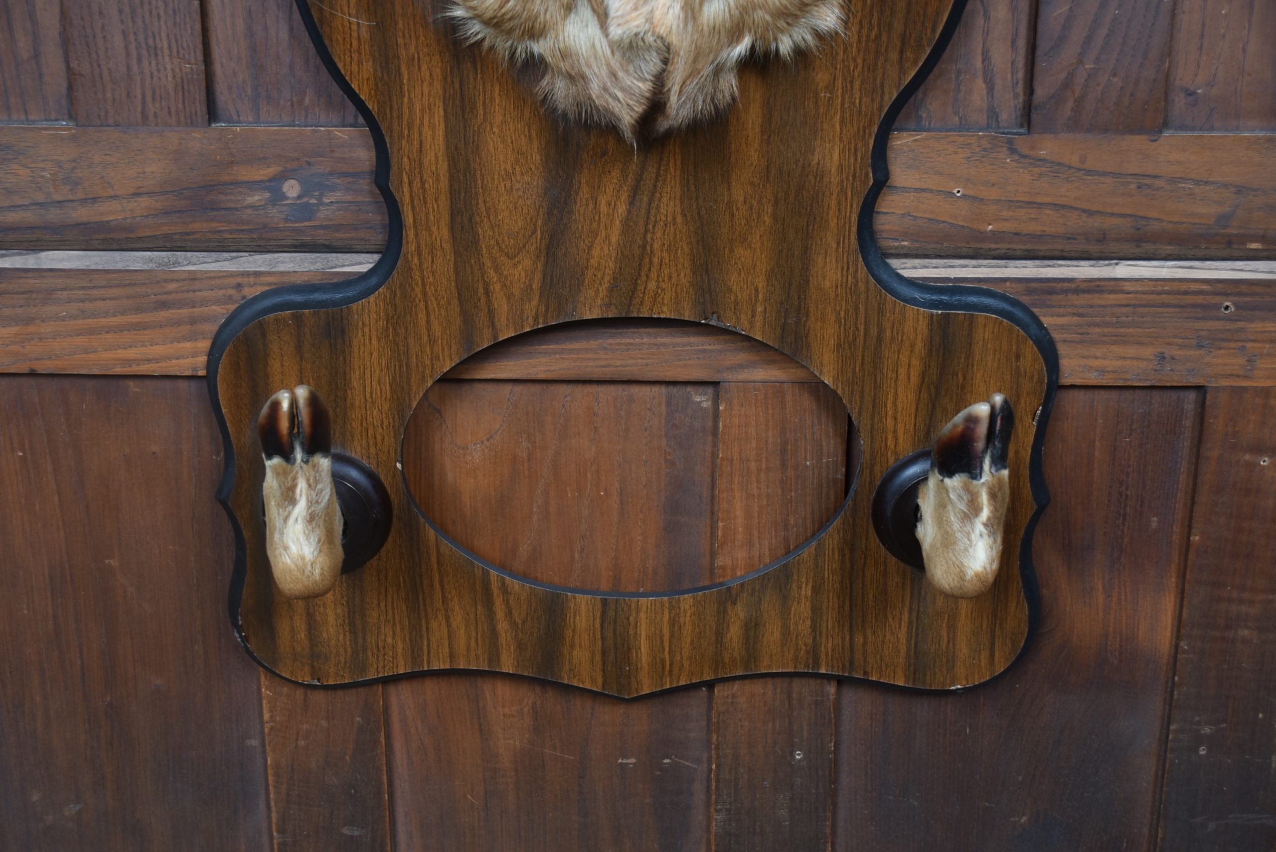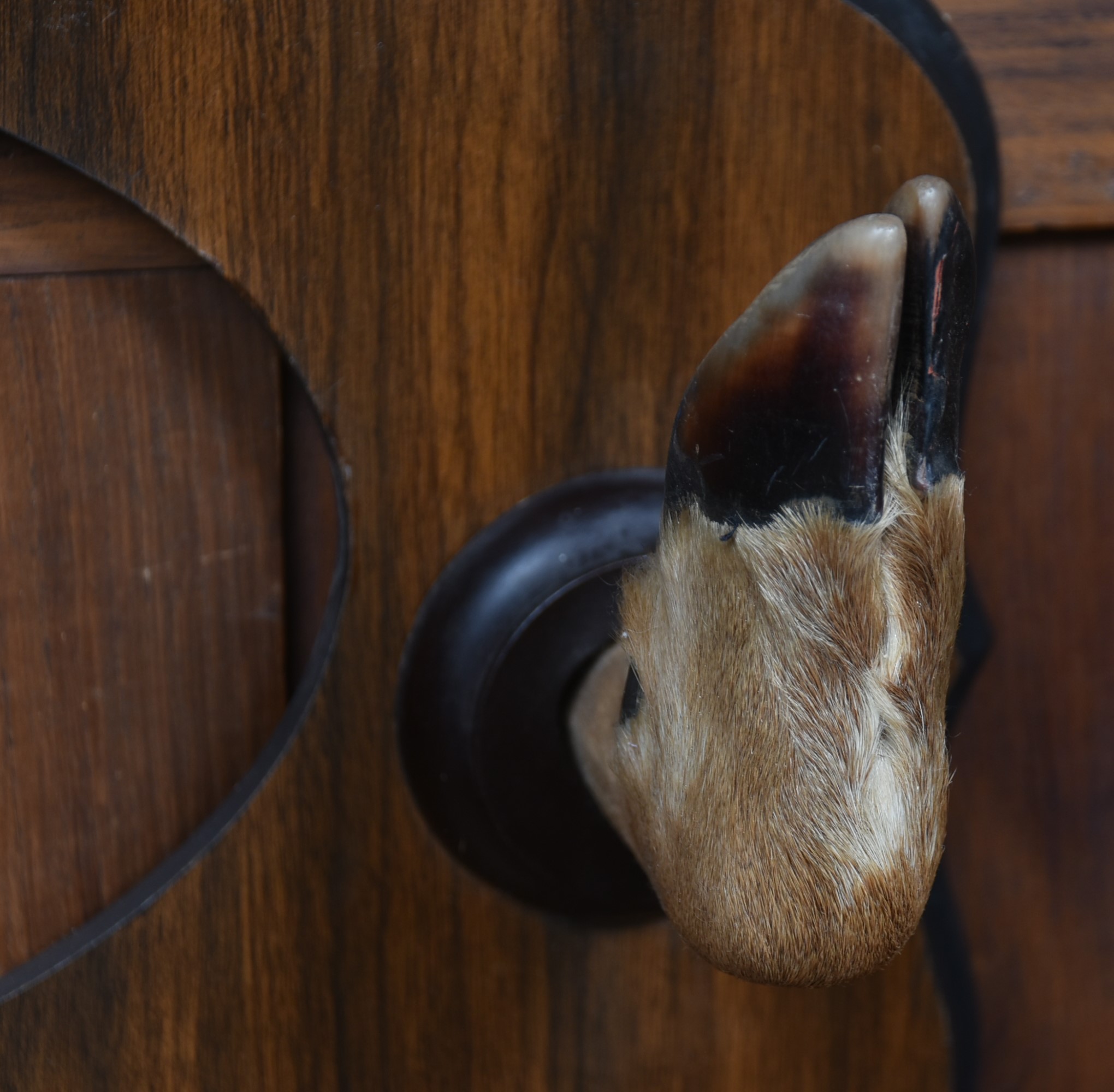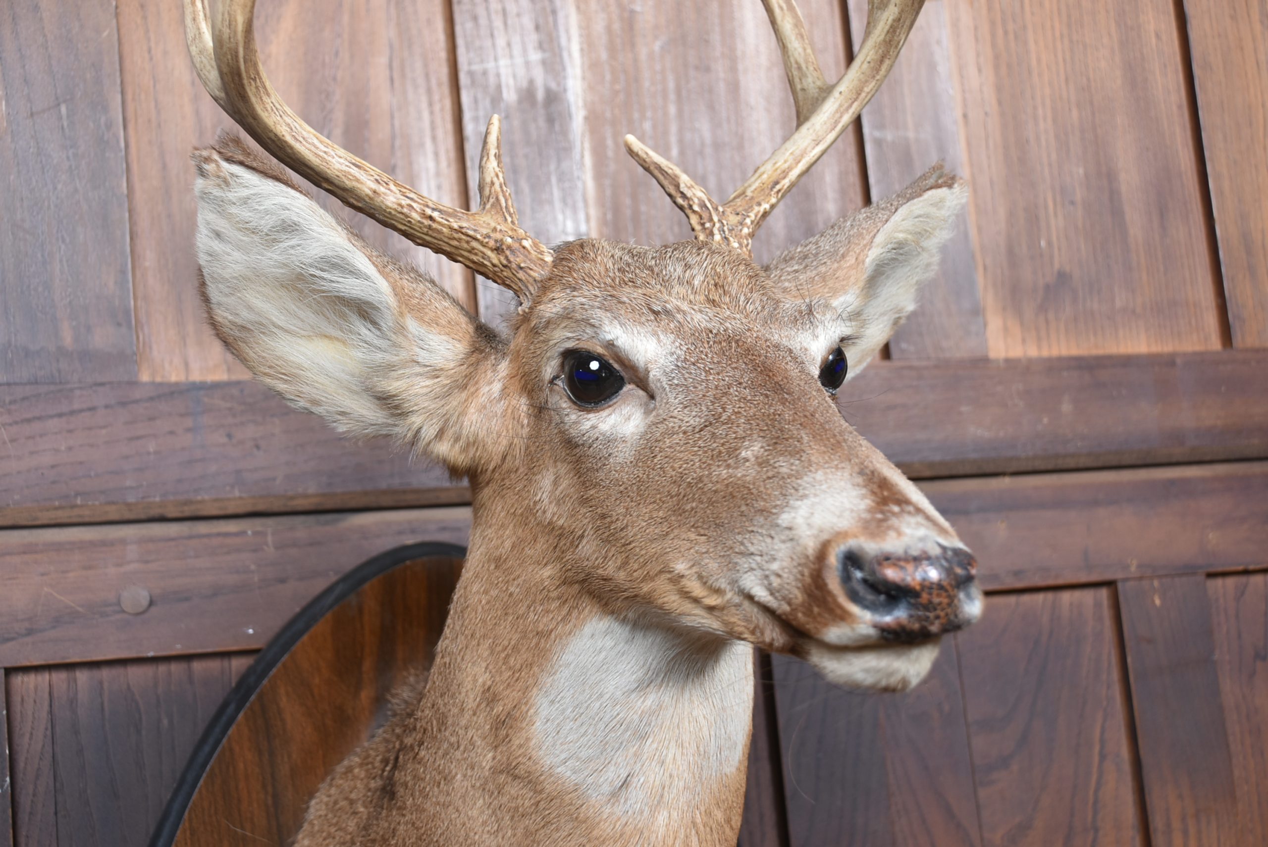 A well‑mounted taxidermy whitetail deer head, displaying an impressive 8‑point antler set and naturalistic colouring throughout. Presented on a shaped wooden plaque with matching mounted hooves, this traditional sporting trophy has strong lodge‑style character and makes a striking decorative feature. A classic piece of country house taxidermy with good presence and timeless appeal.