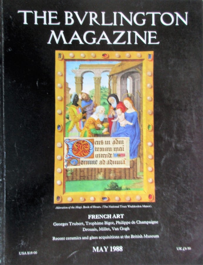 A fine clean copy of The Burlington Magazine ~ Vol. CXXX ~ No. 1022, published in May 1988. Contents include scholarly articles on “Two neo-classical designs for a Bourbon chapel in St-Denis”, by Andrew McClellan ~ “J.-F. Millet in the Allier and the Auvergne”, by Bruce Laughton ~ “Georges Trubert, the René Master and Waddesdon MS 21”, by Anne Demarquay Rook ~ “The one and only Trophime Bigot”, by Jean Boyer ~ “Philippe de Champaigne ~ A commission of 1630”, by Richard Beresford ~ “Jean-Germain Drouais and the 1784 Pix de Rome”, by Simon Lee ~ “Jean-Germain Drouais ~ Recent Discoveries”, by Patrick Ramade, and “Vincent van Gogh ~ His frames and the presentation of his paintings”, by Ann Hoenigswald ~ OBITUARIES ~ “Pierre Verlet”, by Geoffrey de Bellaigue ~ “Lawrence Turčié”, by Duncan Bull ~ BOOK REVIEWS ~ CONFERENCE REPORT ~ EXHIBITION REVIEWS ~ London ~ “Süleyman the Magnificent ~ British Museum” ~ “Old Master Paintings ~ Royal Academy and Walpole Gallery” ~ “Lucian Freud ~ Hayward Gallery” ~ “Exhibition Road ~ Royal College of Art” ~ “Gerhard Richter ~ Anthony d’Offay” ~ “Critical Realism and Jock McFadyen ~ Camden Arts Centre” ~ Paris ~ “Les demoiselles d’Avignon ~ Musée Picasso” ~ Frankfurt ~ “Poussin and Claude ~ Städelsches Kunstinstitut” ~ Berlin and Stuttgart ~ “Alberto Giacometti ~ Nationalgalerie and Staatsgalerie” ~ Philadelphia ~ “Seventeenth Century Dutch landscape painting ~ Museum of Art” ~ Recent acquisitions of ceramics and glass in the British Museum. ~ Soft covers.