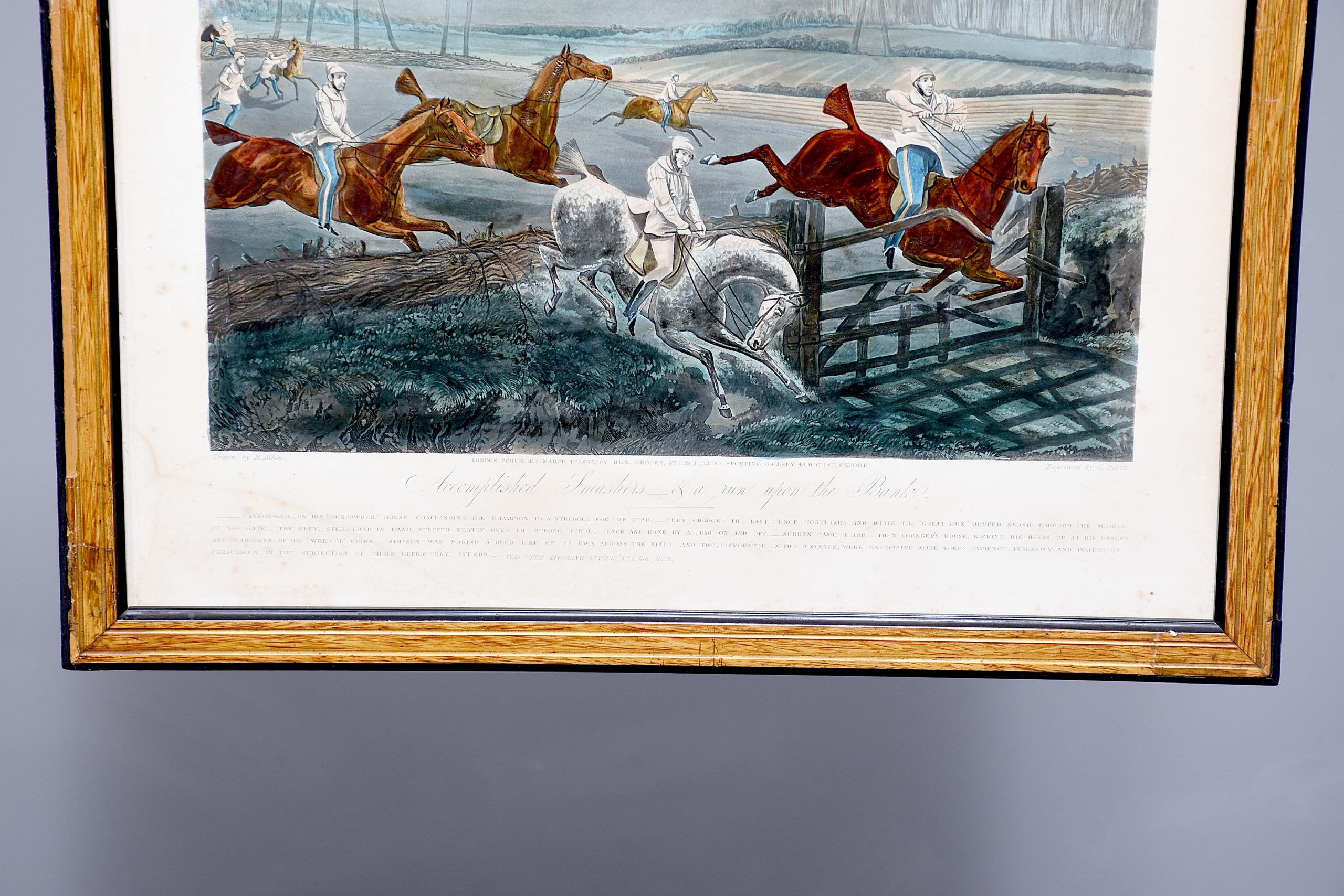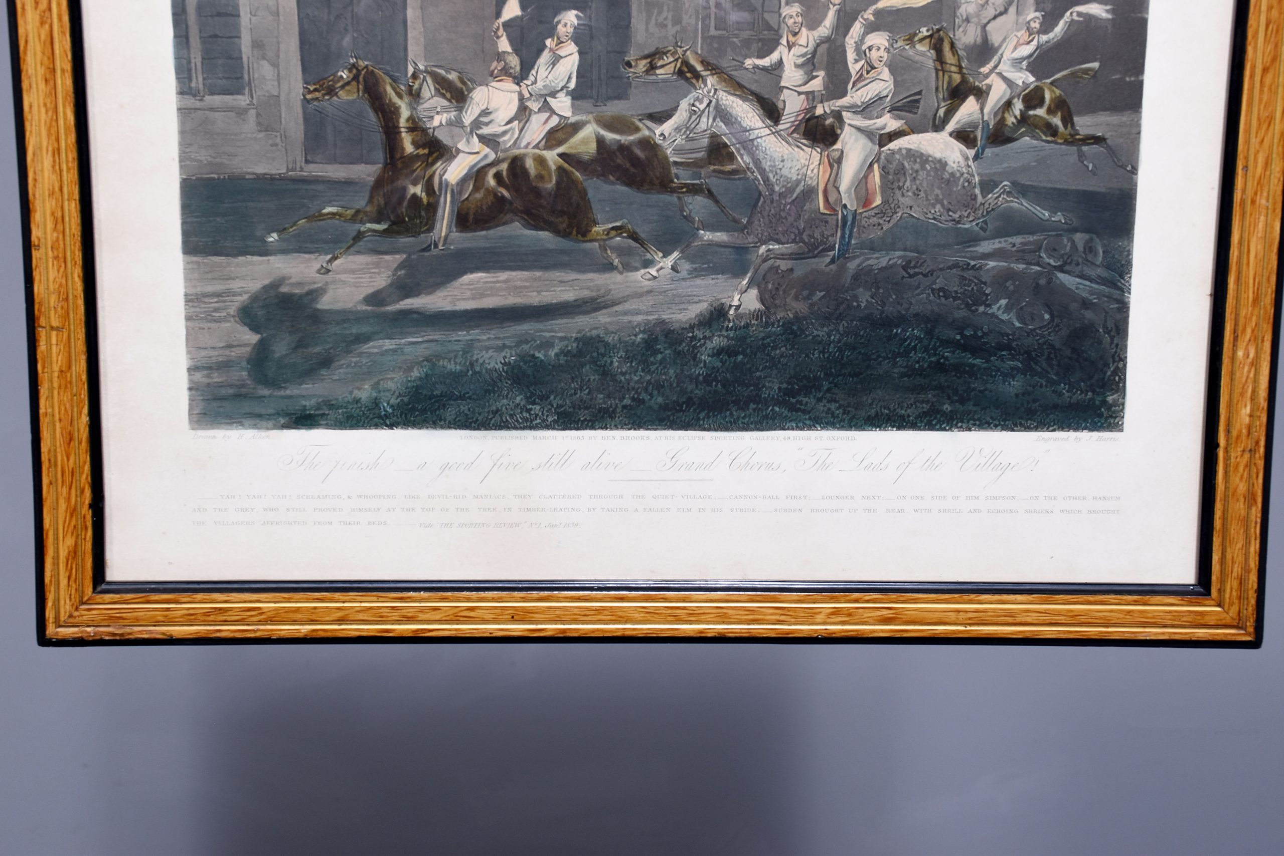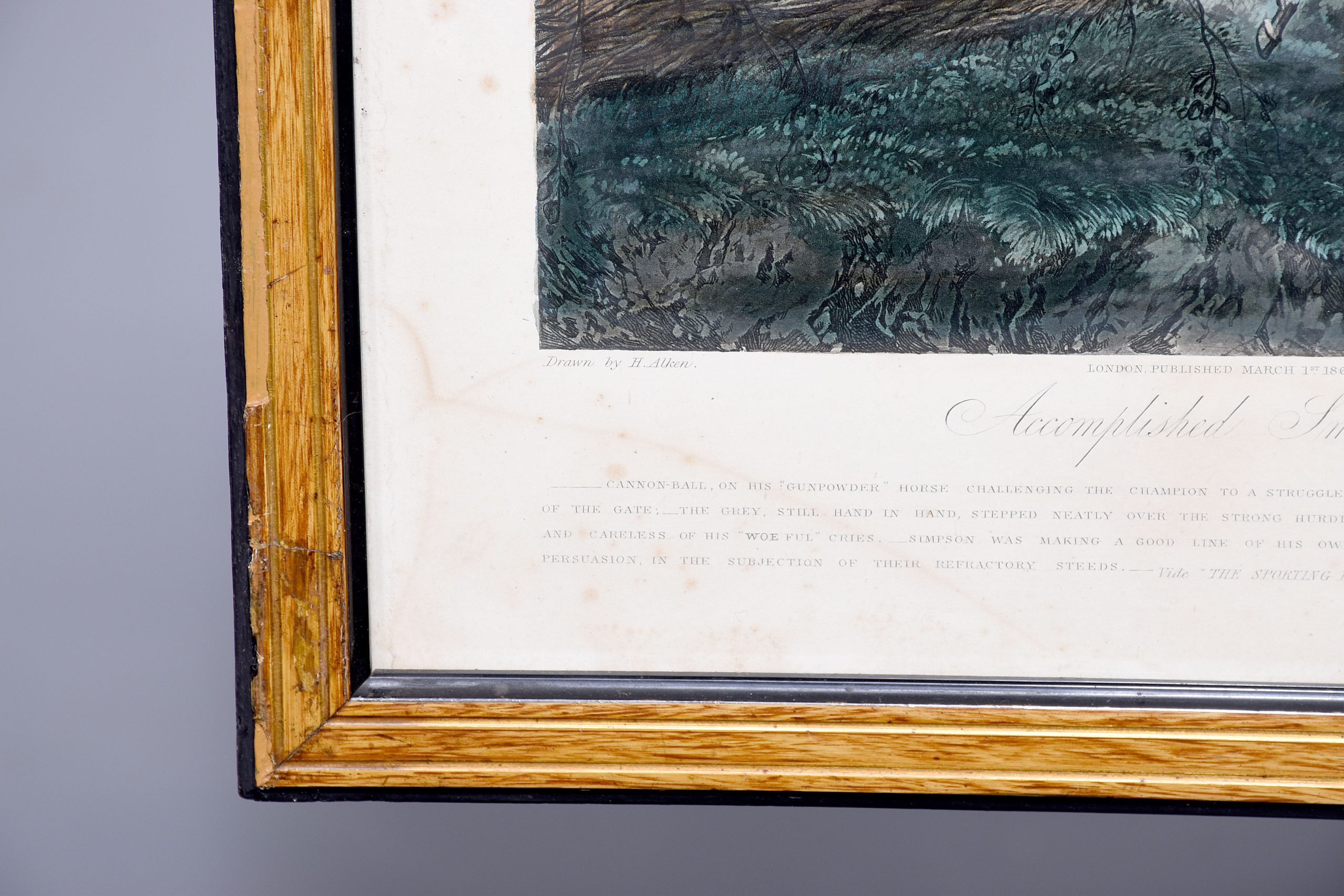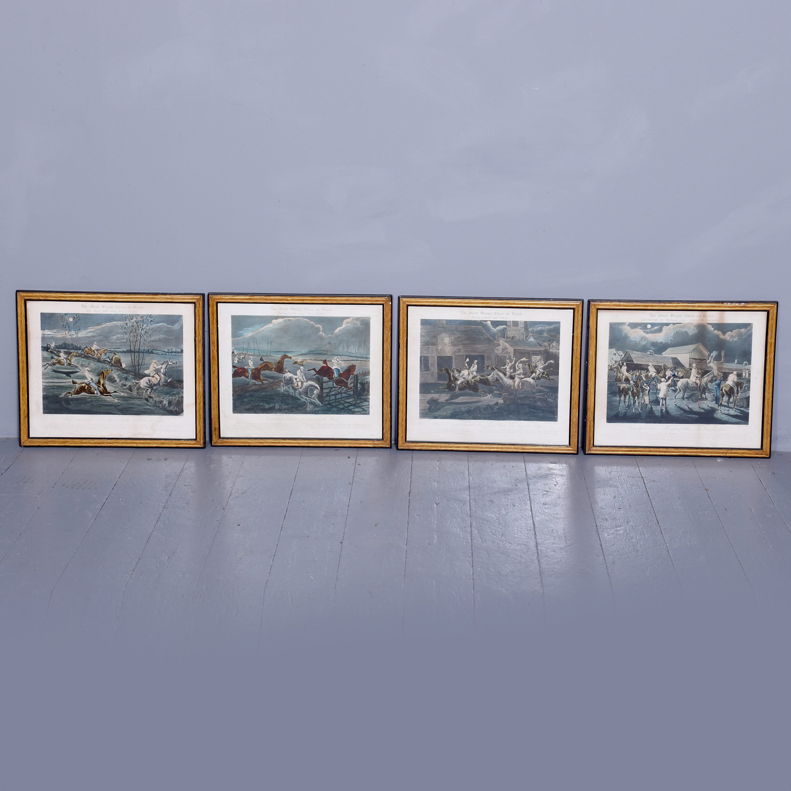 A set of 4 original hand coloured Aqua-prints after by ‘H. Aiken’ published 1st March 1862 by ‘Ben Brookes’, Oxford and engraved by ‘J. Harris’, the four plates with writing above and below the aqua-prints, all glazed and scumbled frames with two ribbed sections.