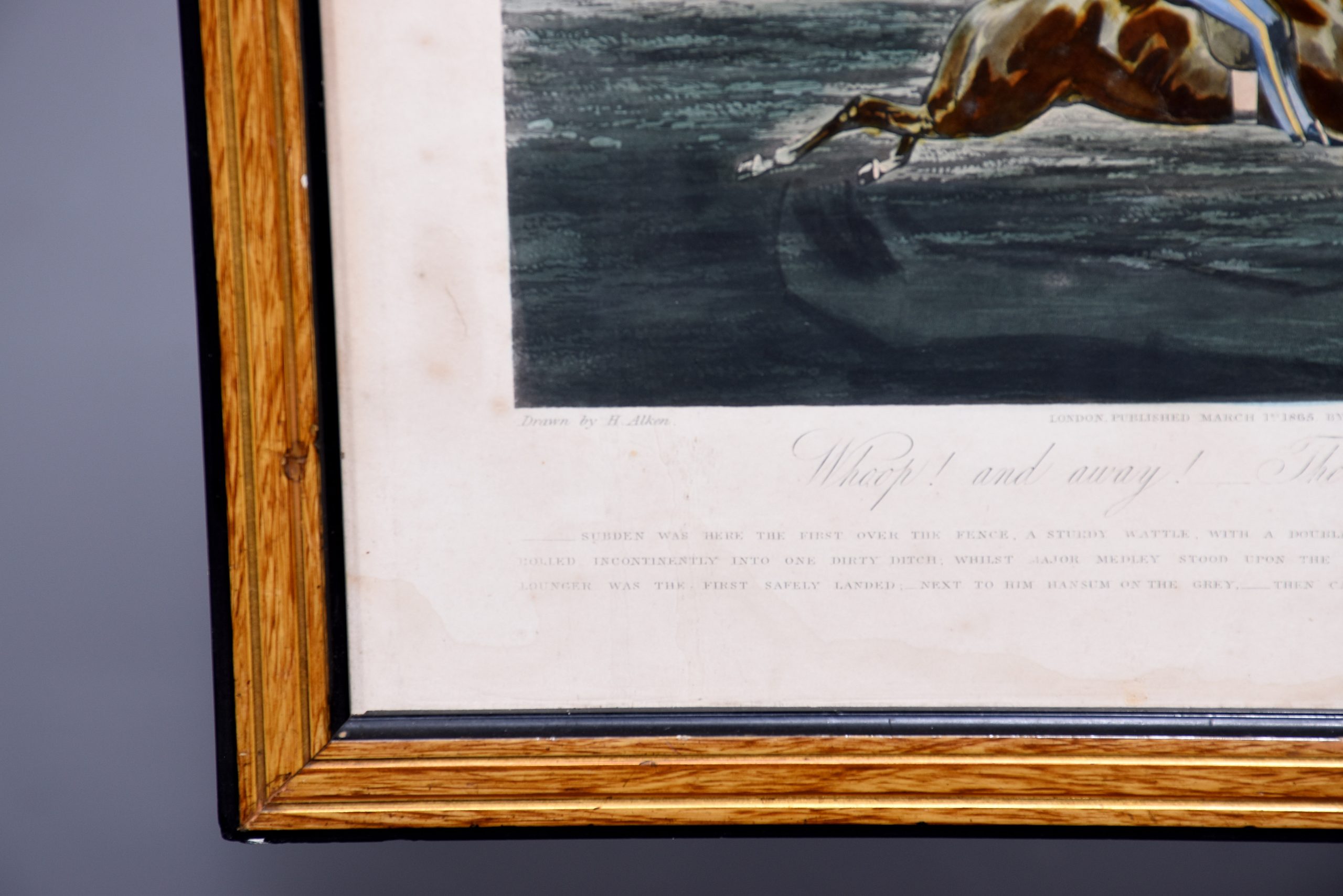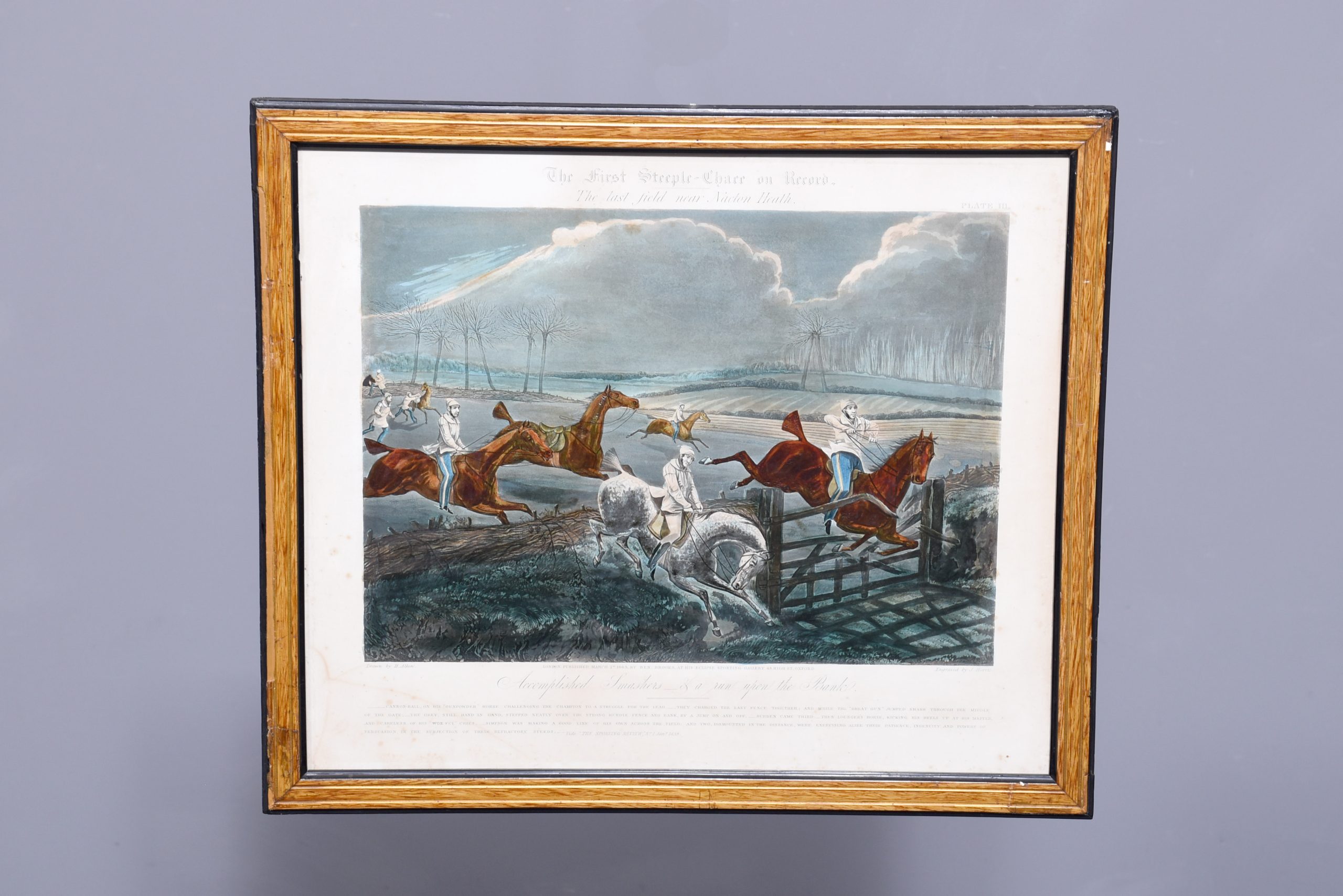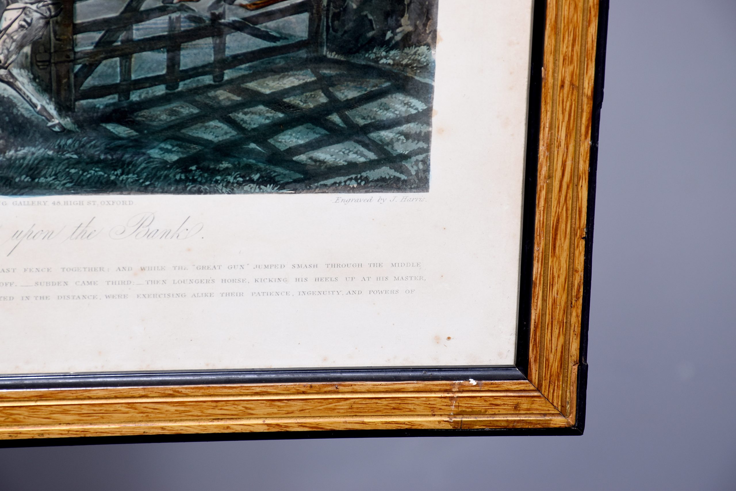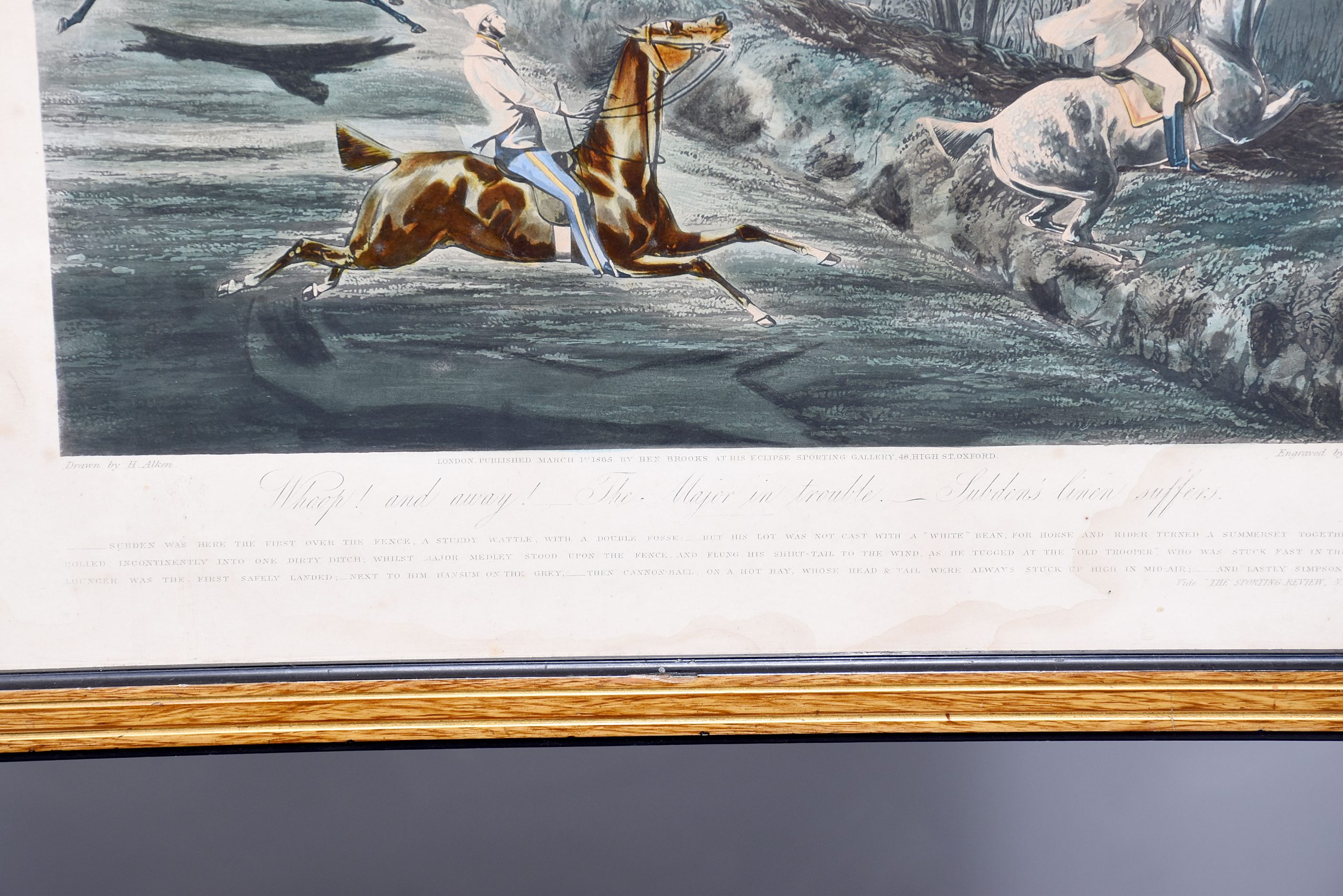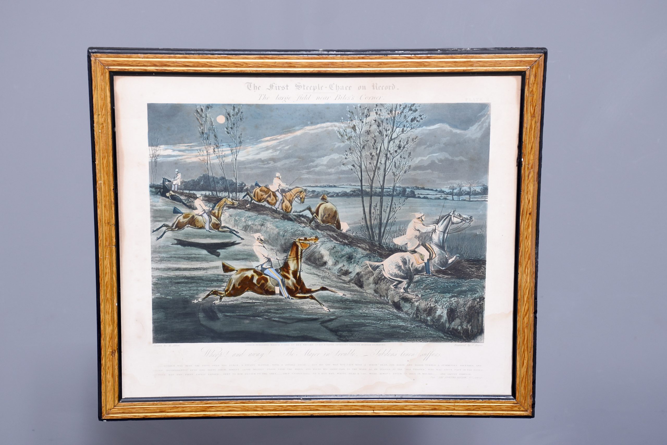 A set of 4 original hand coloured Aqua-prints after by ‘H. Aiken’ published 1st March 1862 by ‘Ben Brookes’, Oxford and engraved by ‘J. Harris’, the four plates with writing above and below the aqua-prints, all glazed and scumbled frames with two ribbed sections.