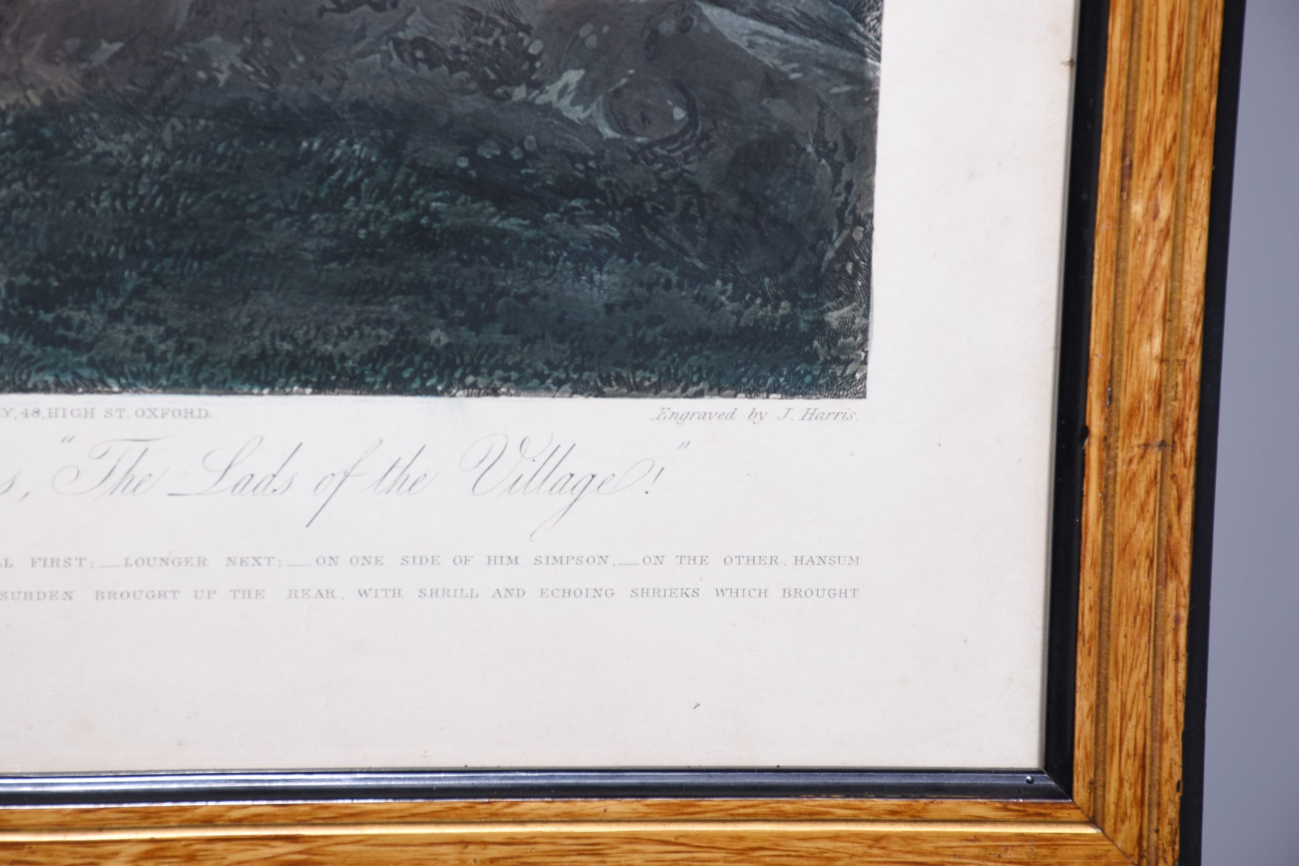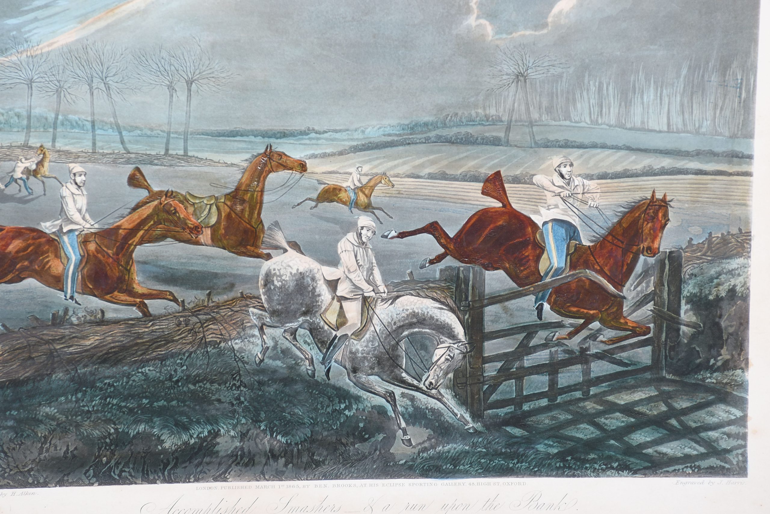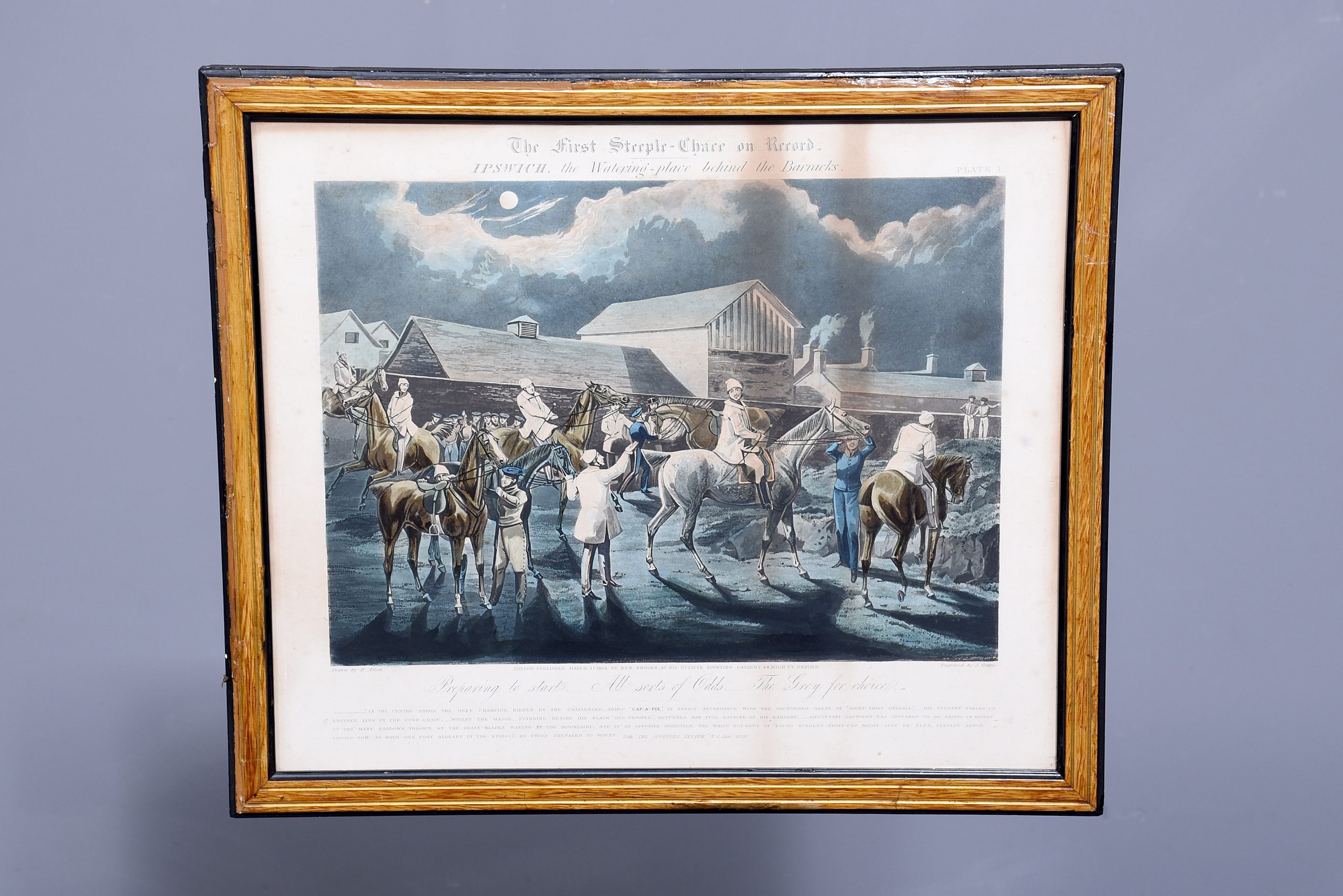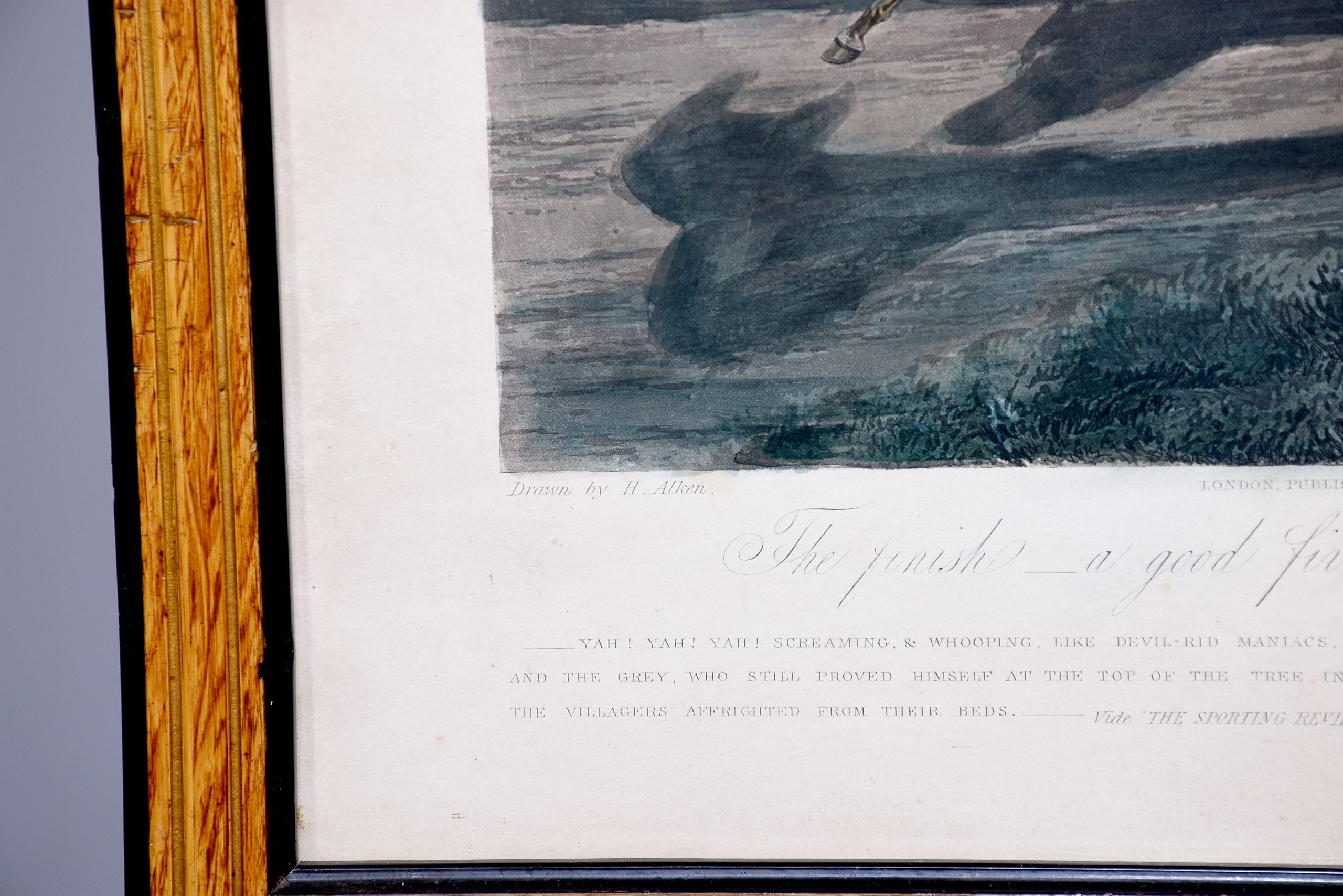 A set of 4 original hand coloured Aqua-prints after by ‘H. Aiken’ published 1st March 1862 by ‘Ben Brookes’, Oxford and engraved by ‘J. Harris’, the four plates with writing above and below the aqua-prints, all glazed and scumbled frames with two ribbed sections.