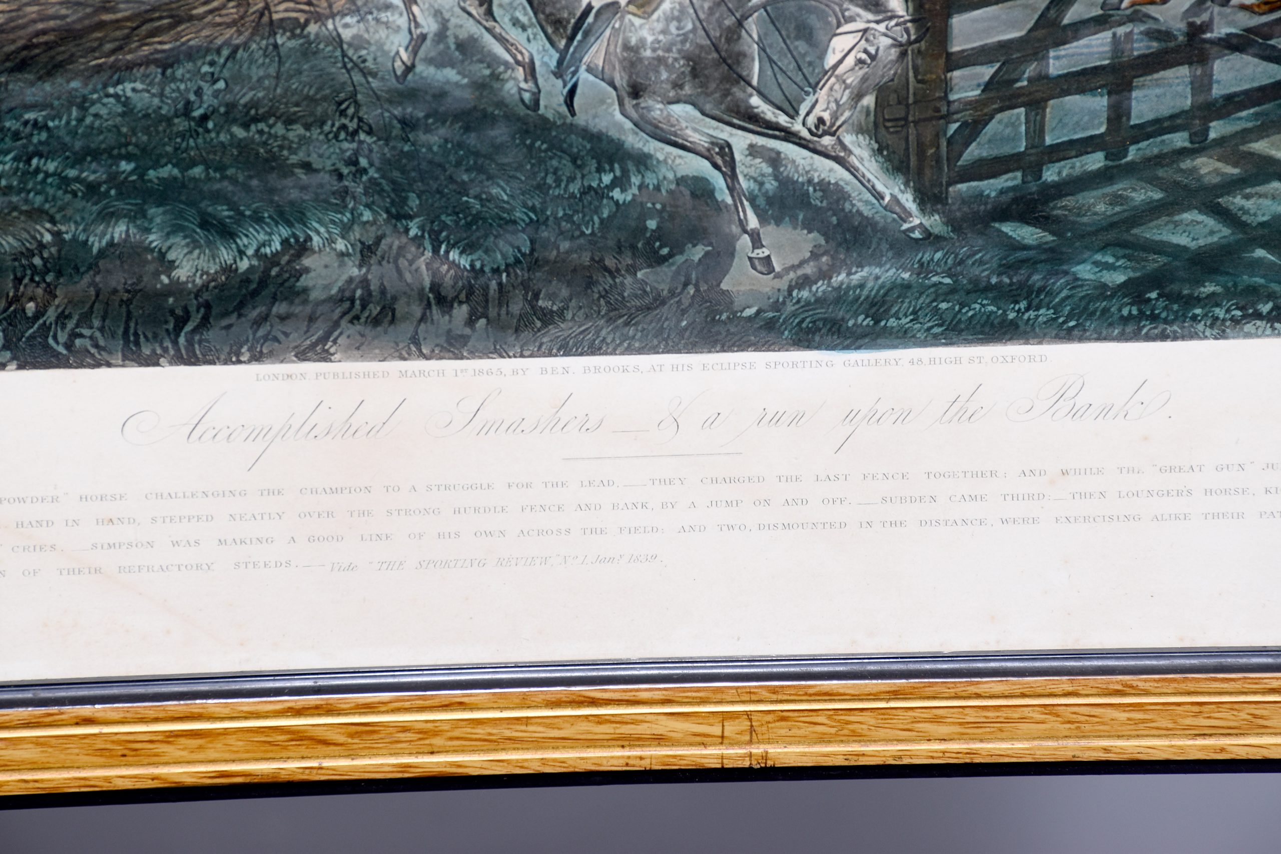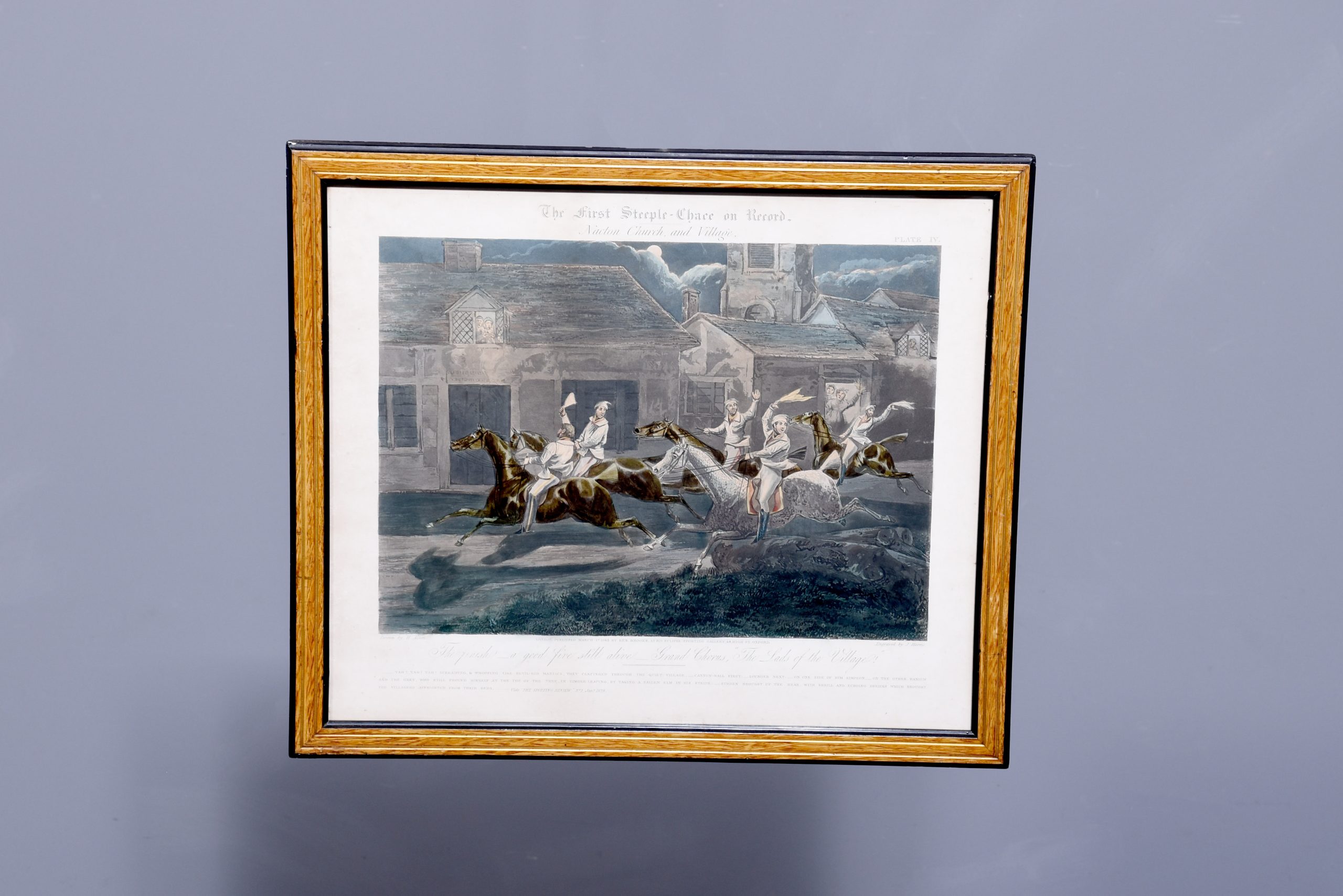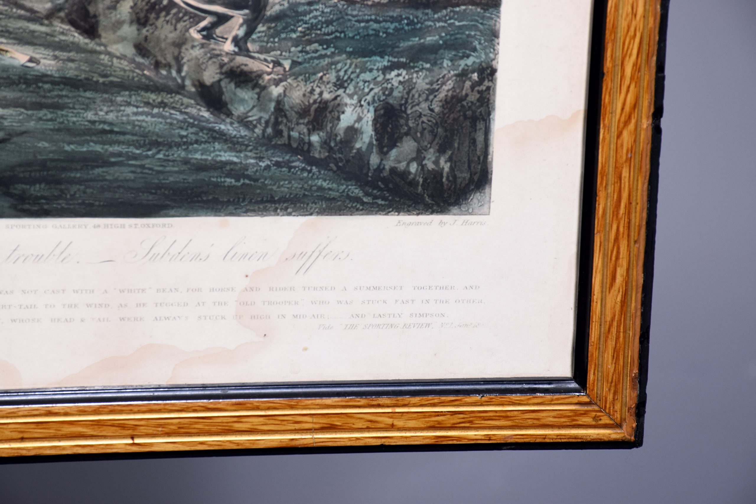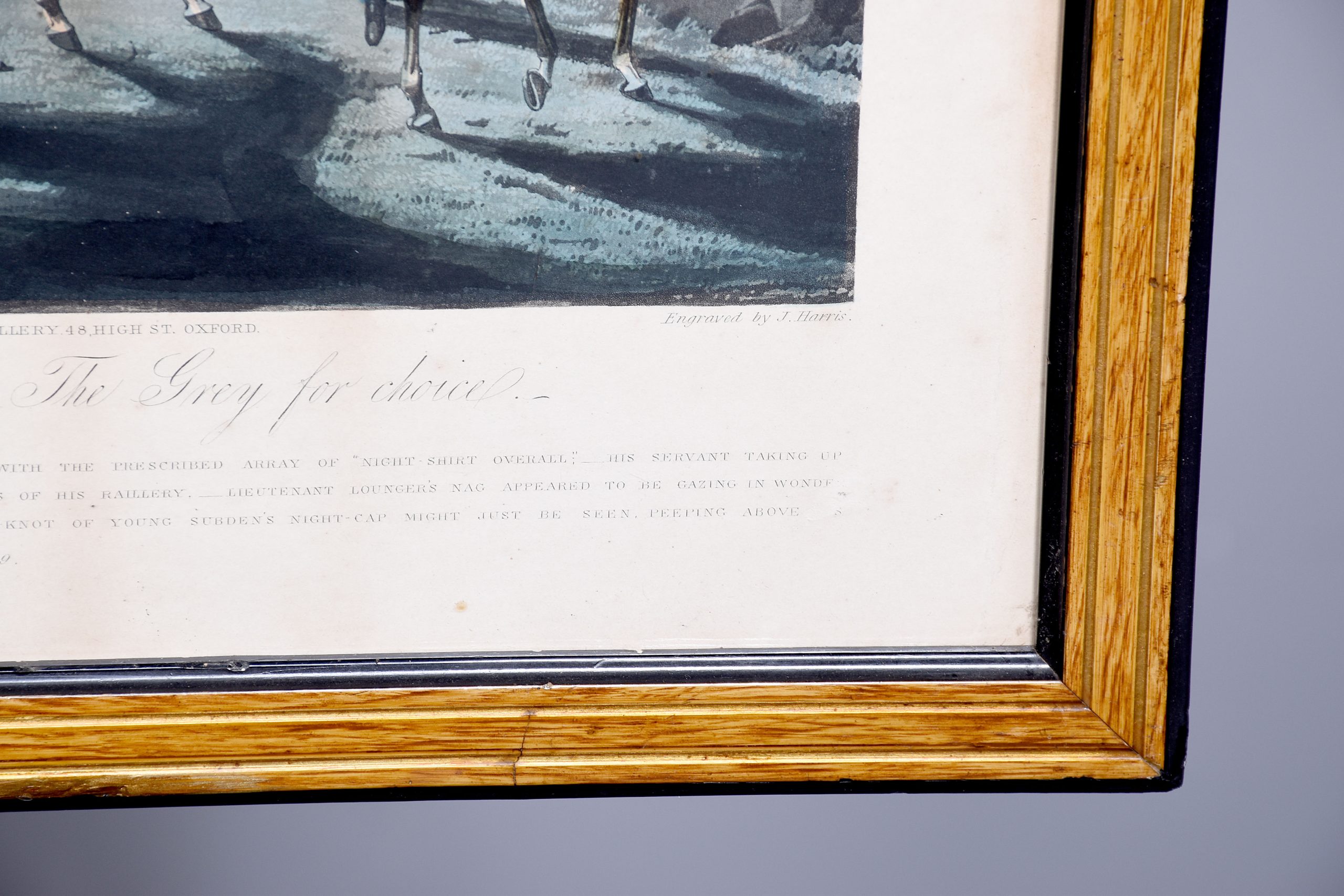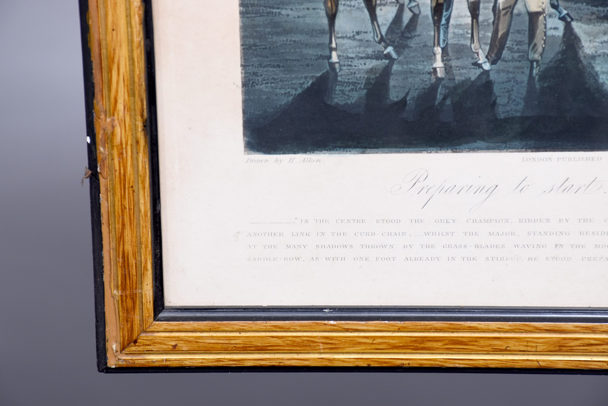 A set of 4 original hand coloured Aqua-prints after by ‘H. Aiken’ published 1st March 1862 by ‘Ben Brookes’, Oxford and engraved by ‘J. Harris’, the four plates with writing above and below the aqua-prints, all glazed and scumbled frames with two ribbed sections.