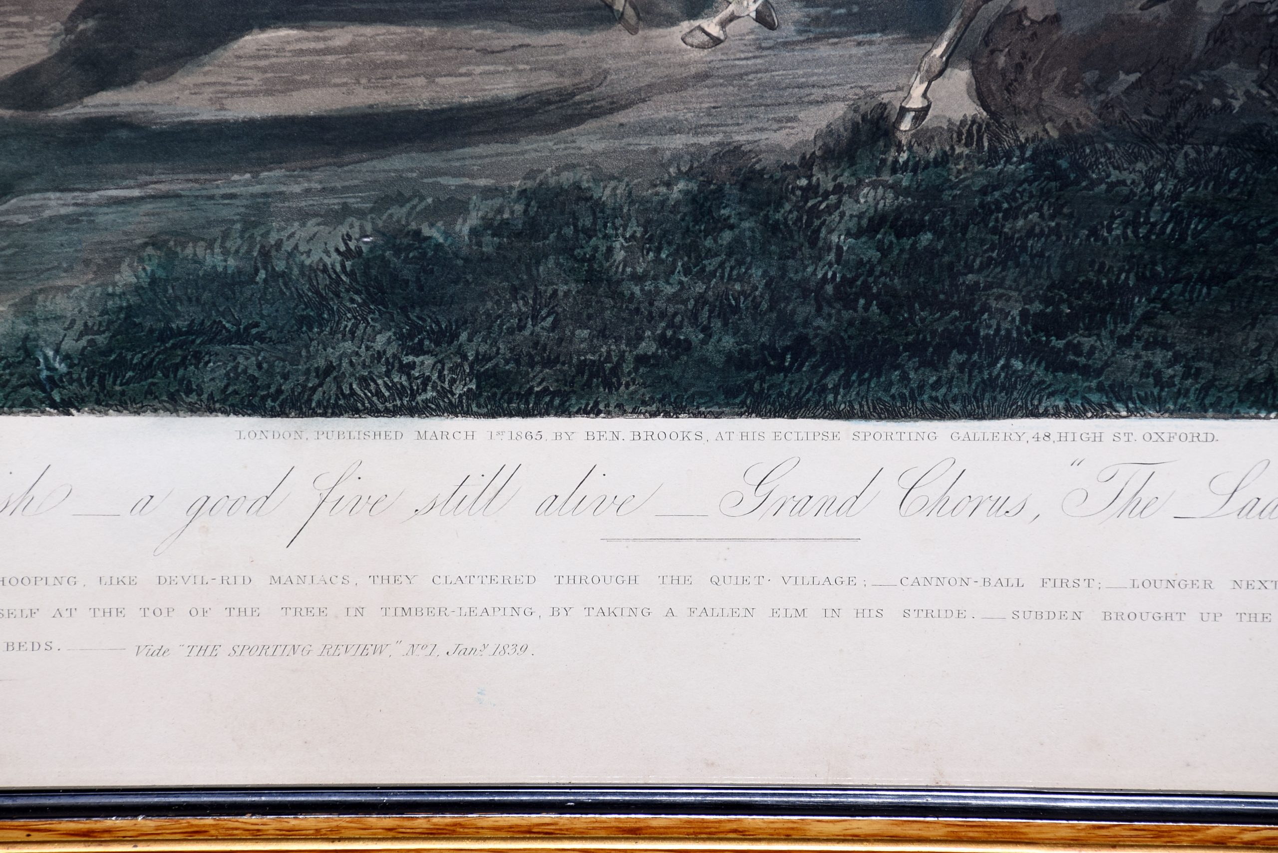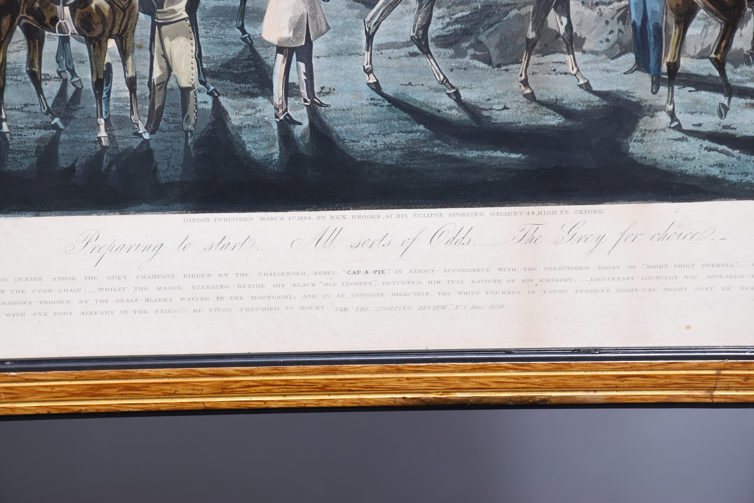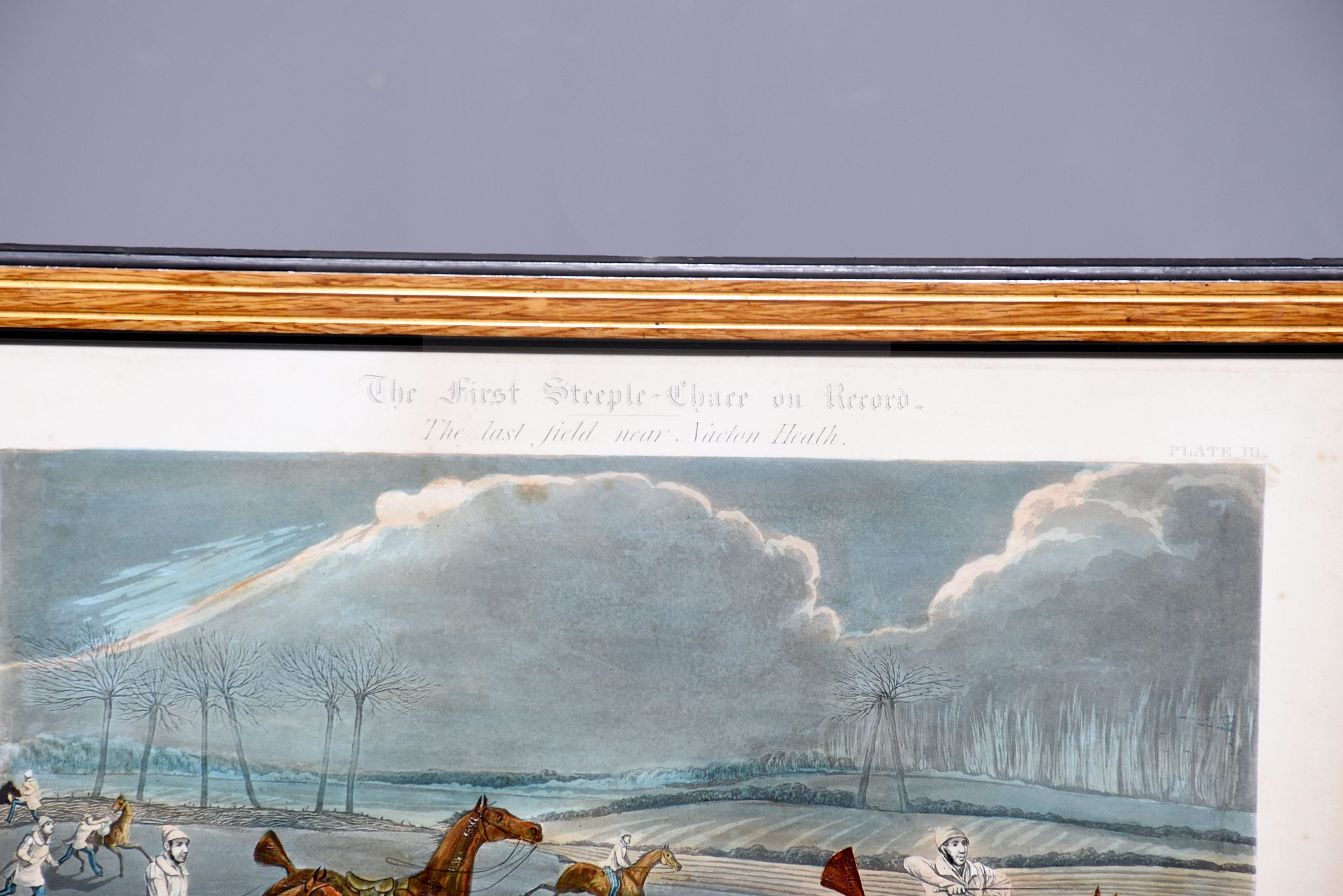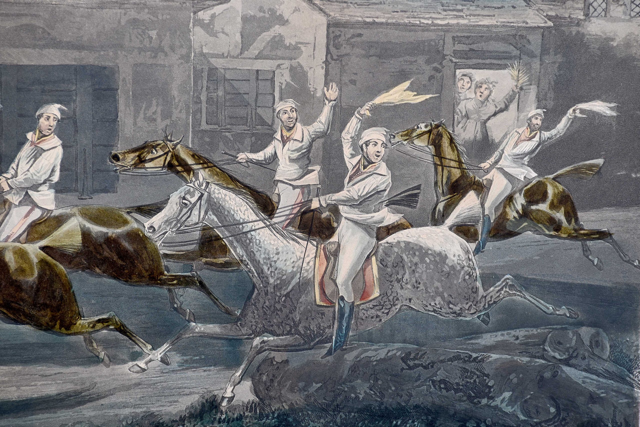 A set of 4 original hand coloured Aqua-prints after by ‘H. Aiken’ published 1st March 1862 by ‘Ben Brookes’, Oxford and engraved by ‘J. Harris’, the four plates with writing above and below the aqua-prints, all glazed and scumbled frames with two ribbed sections.