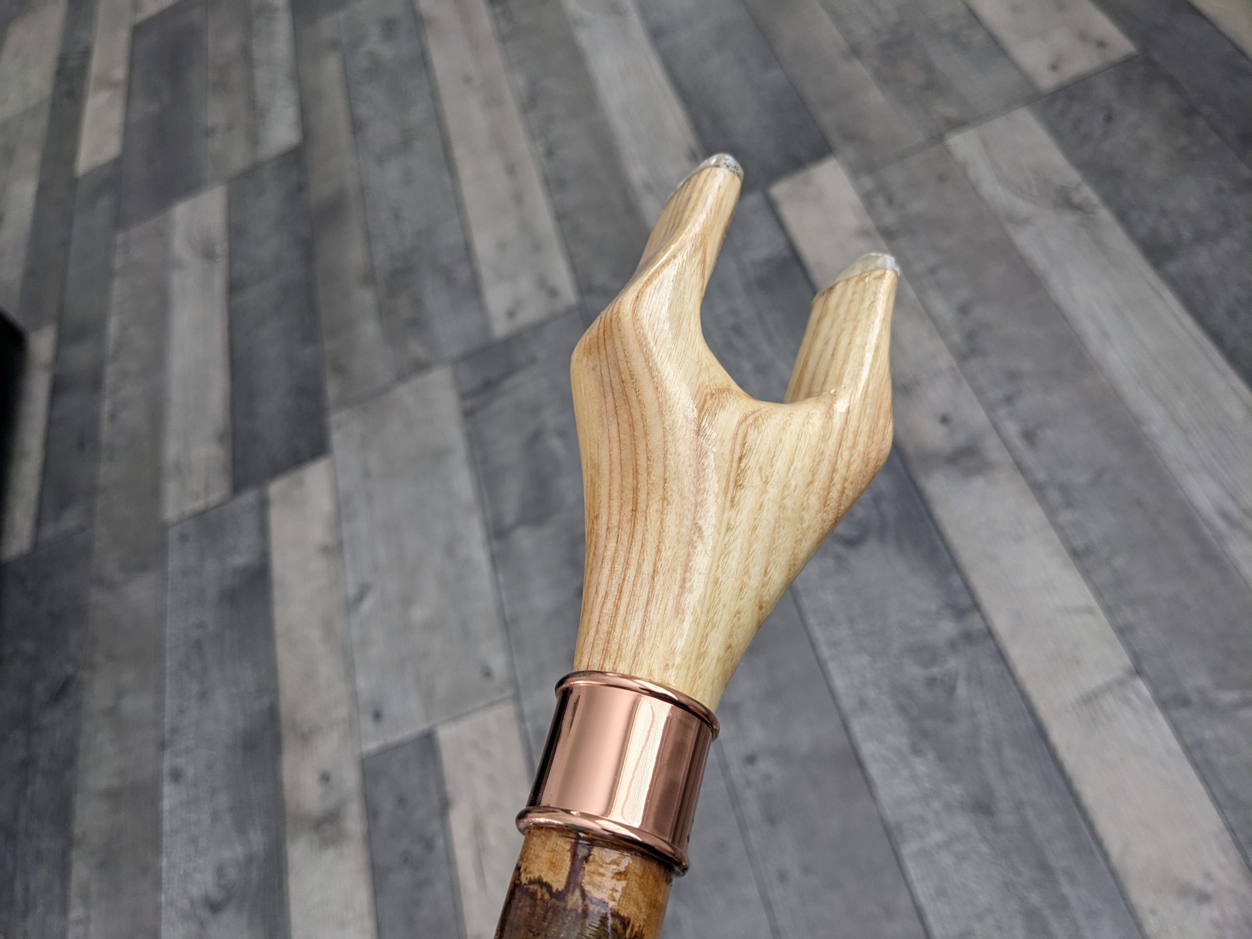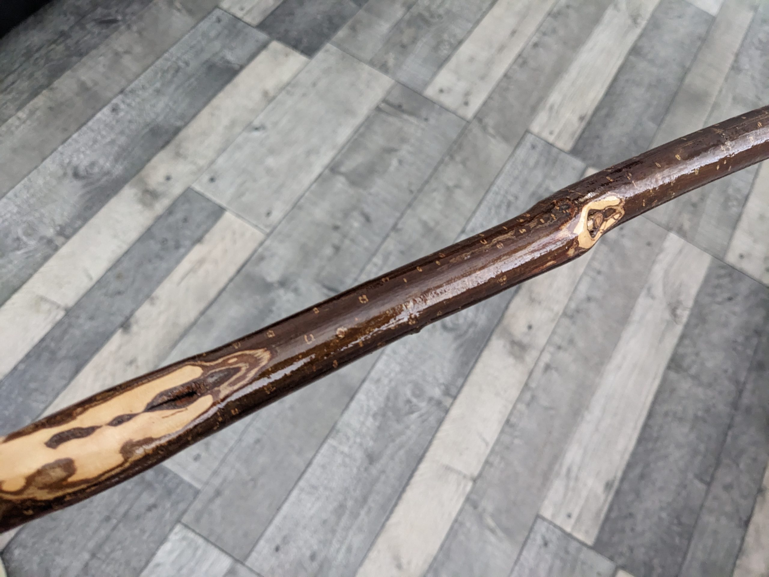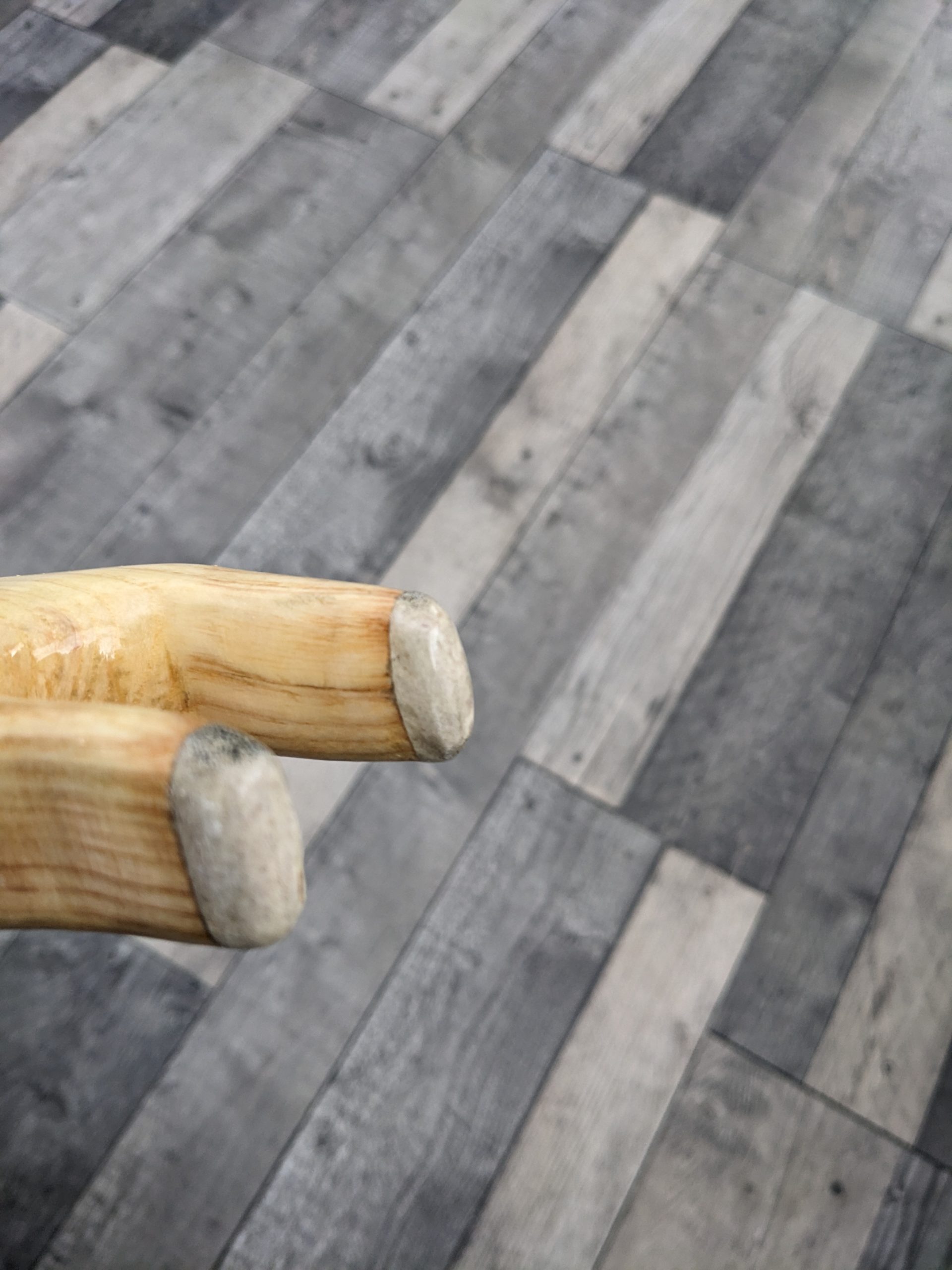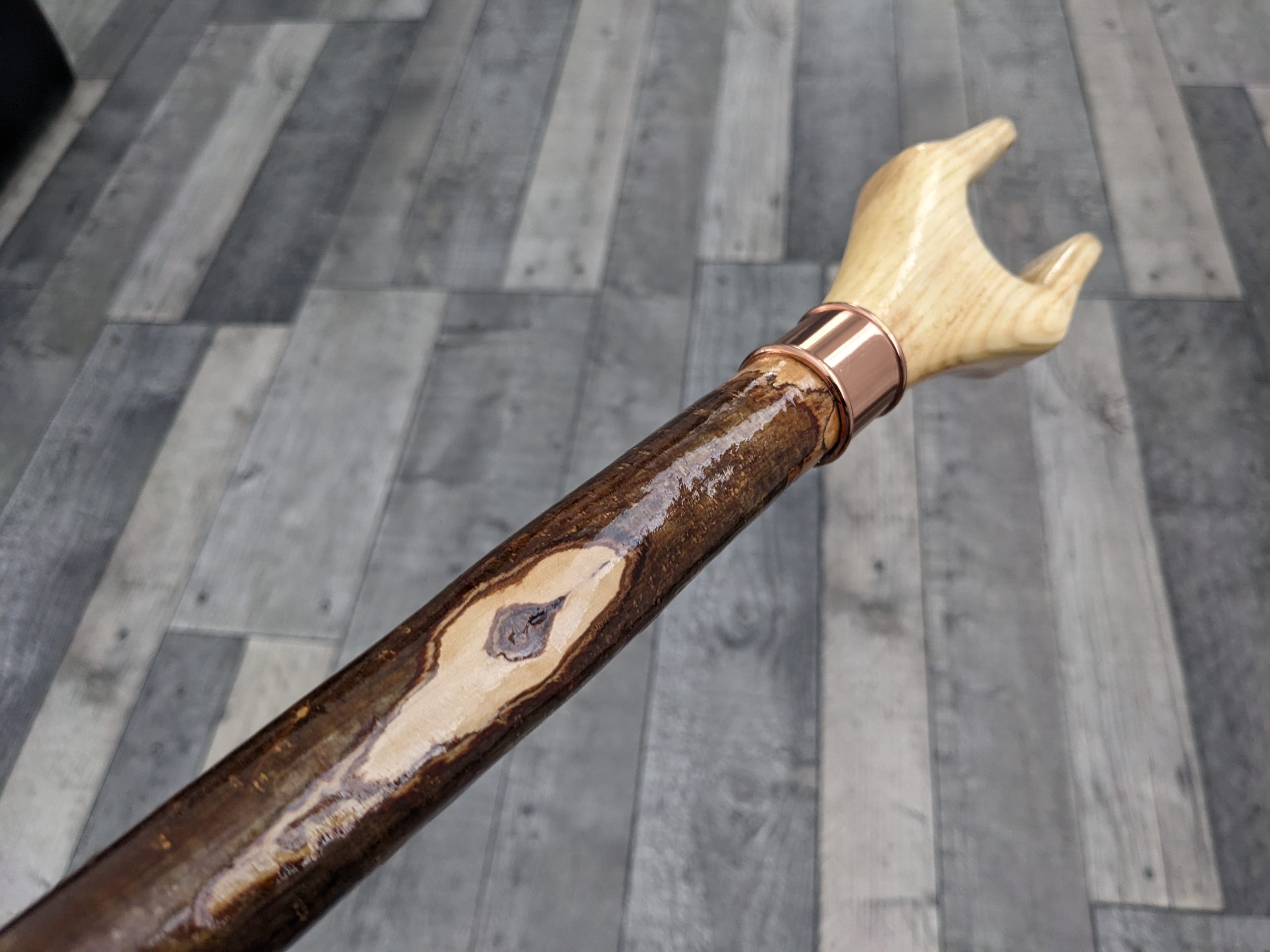 Very nice thumb stick hiking stick in ash with Stag horn tips on a very nice hazel shank lovely stick very strong and very light pp is £13.00 contact me for more information