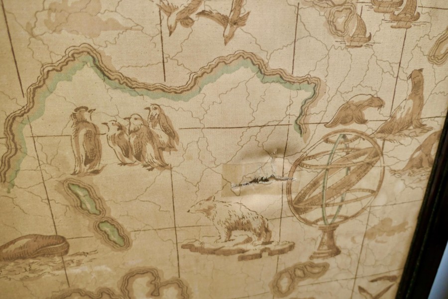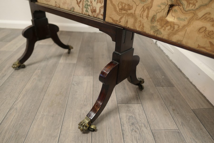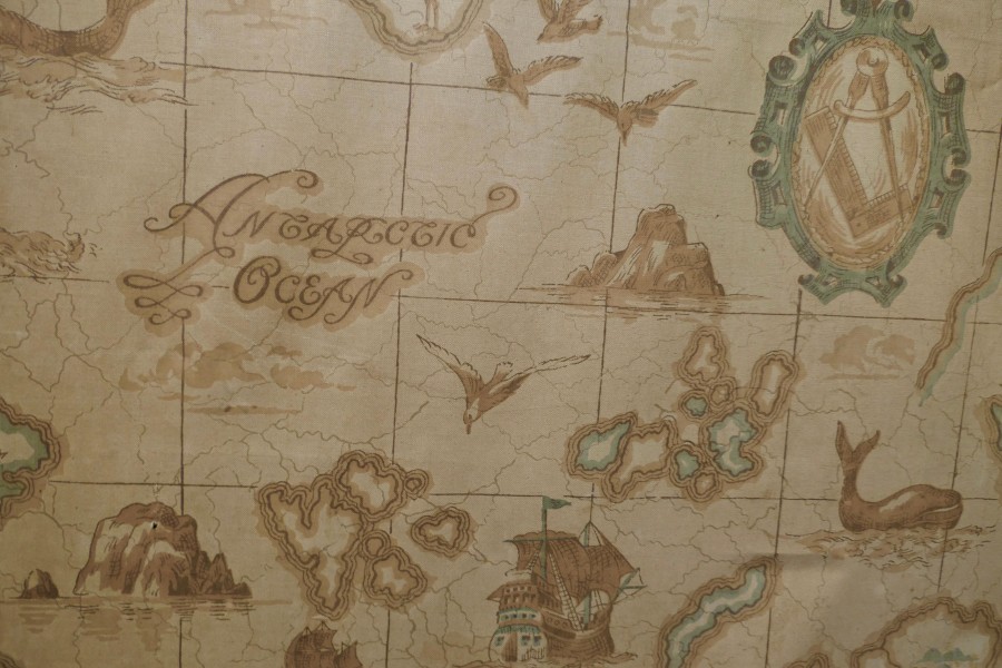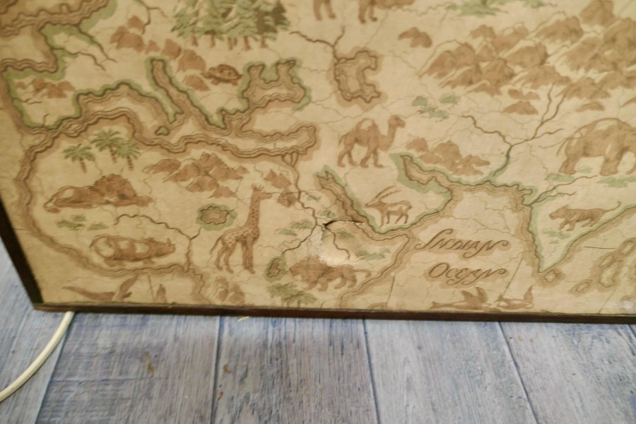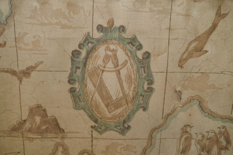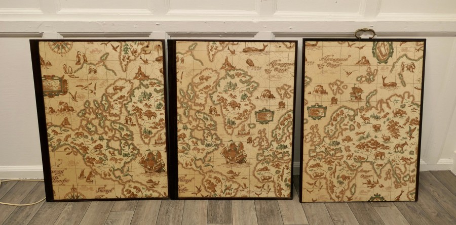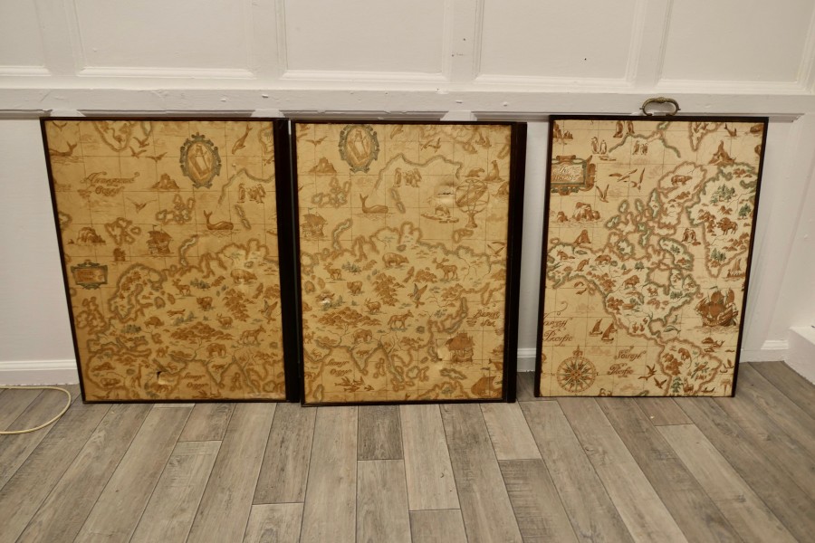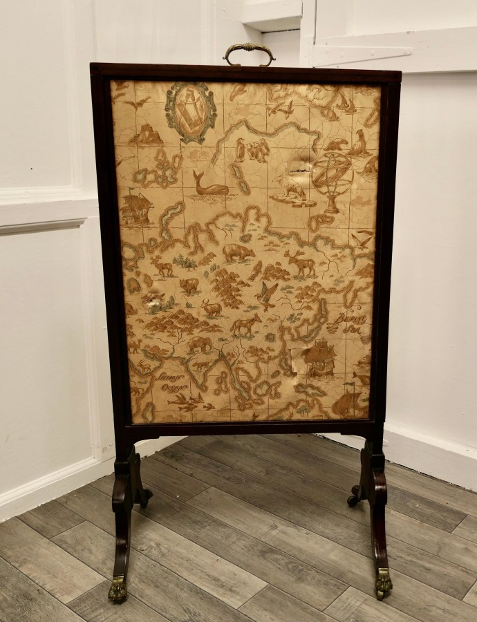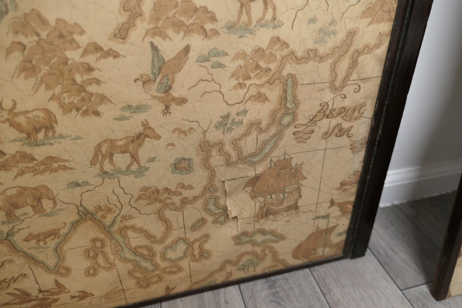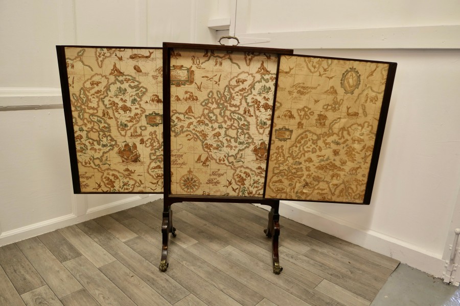 A triple extending fire screen of Northern Hemisphere Map A wonderful piece the screen has 3 double sided silk panels printed with Northern Hemisphere Mapping There are a few thin tears in the silk otherwise a very rare and interesting piece The overall size of the screen with the maps closed is 42” high, 23” wide and 16” deep on the floor TCC247. Manufacture Date : 19th Century Materials : Silk
