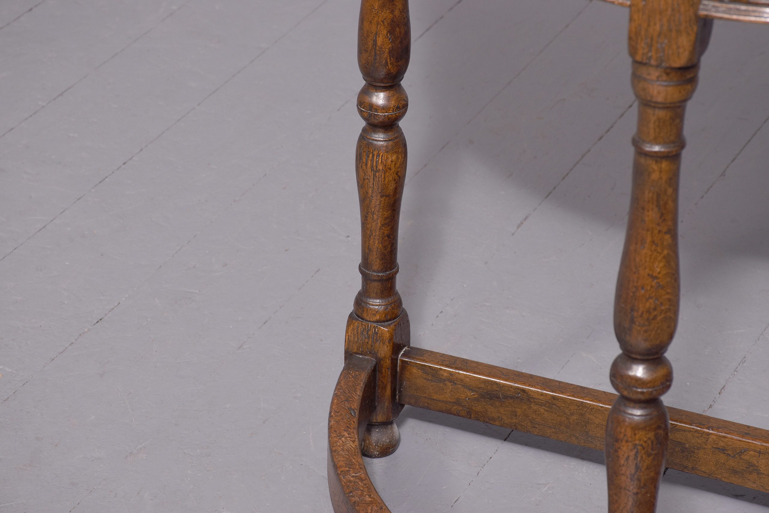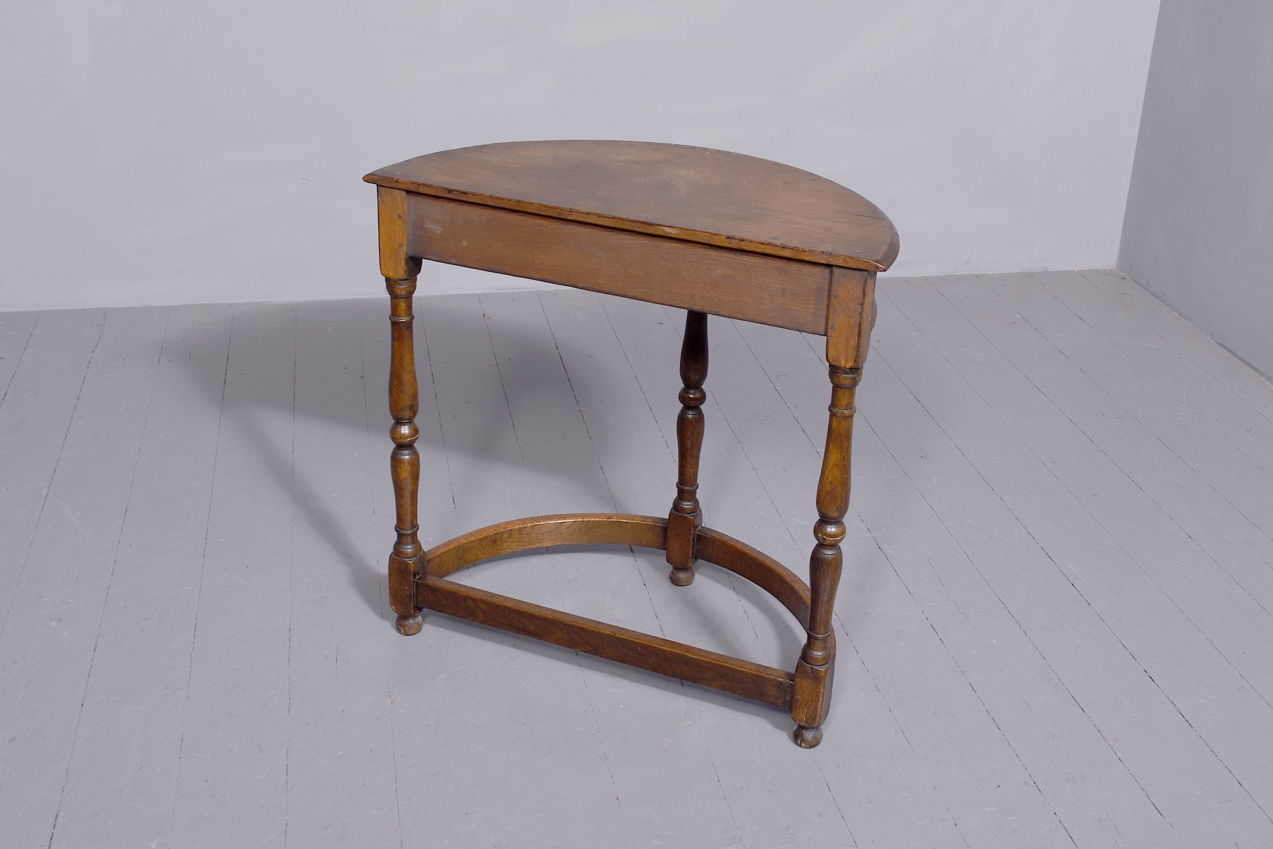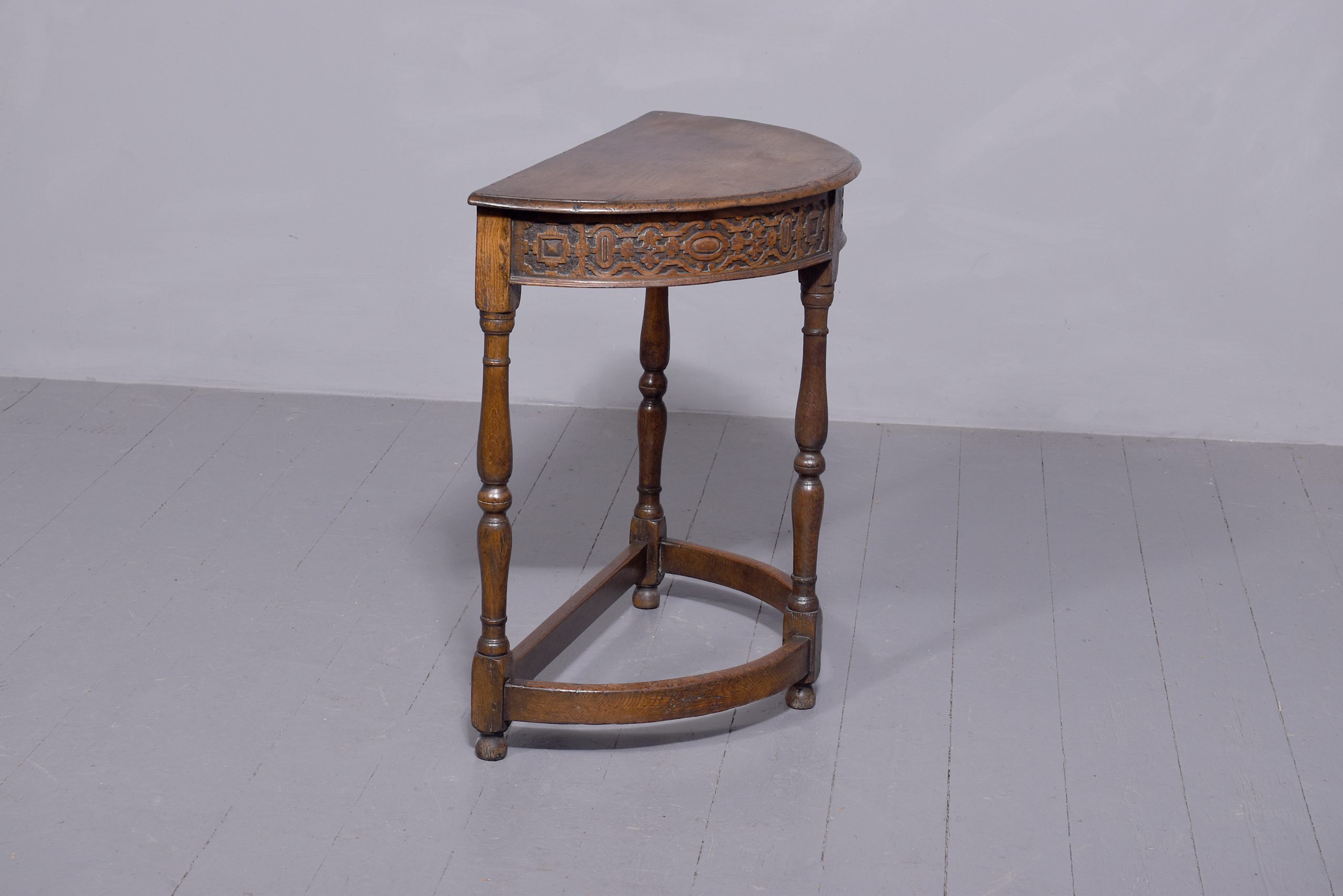 Circa 1900. A Tudor style oak demi lune occasional table, the solid top with a simple moulded fore-edge, frieze with carved classical baroque patterns with beading beneath, supported on three turned legs braced by curved stretchers which follow the form of the top, resting on small bun feet.
