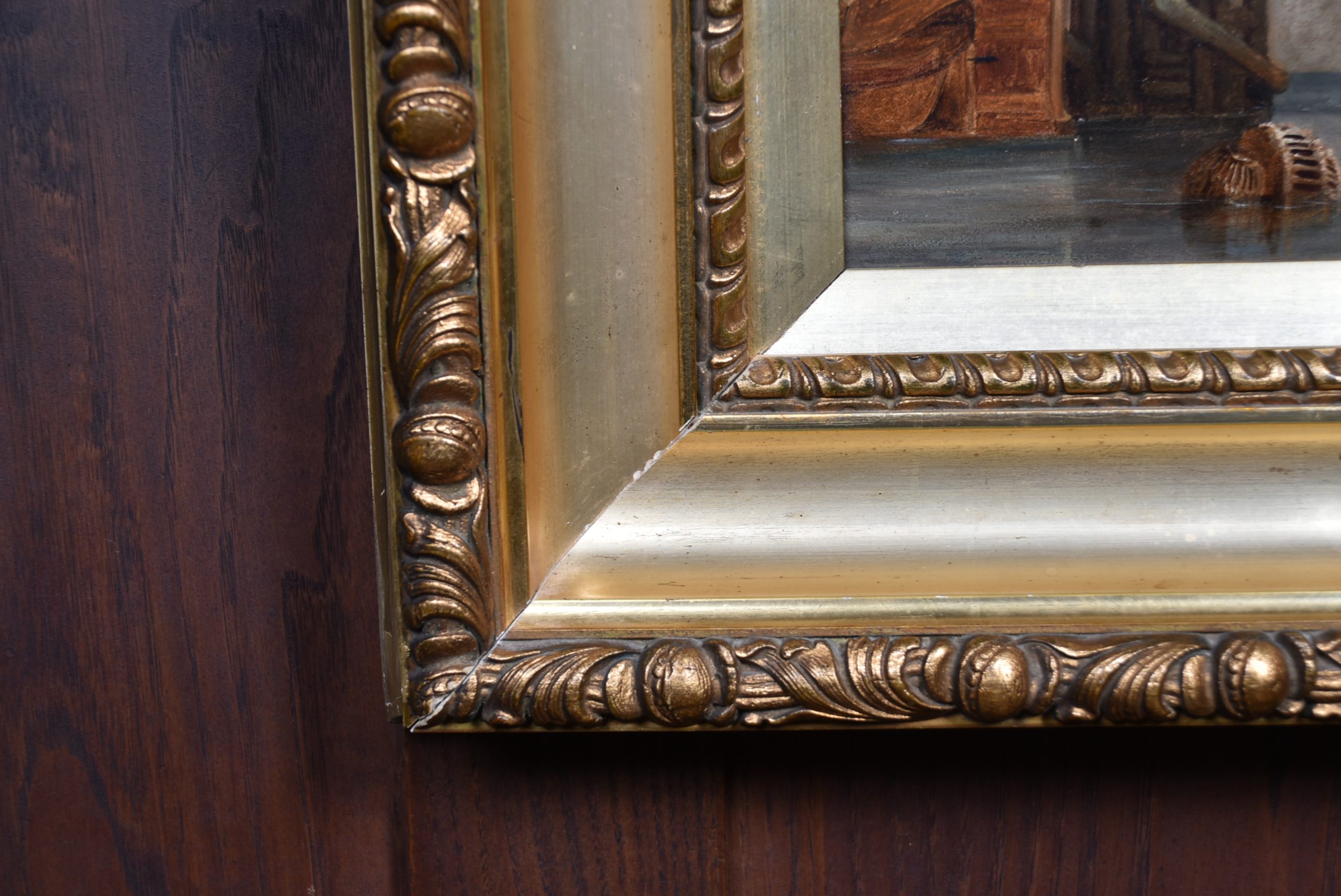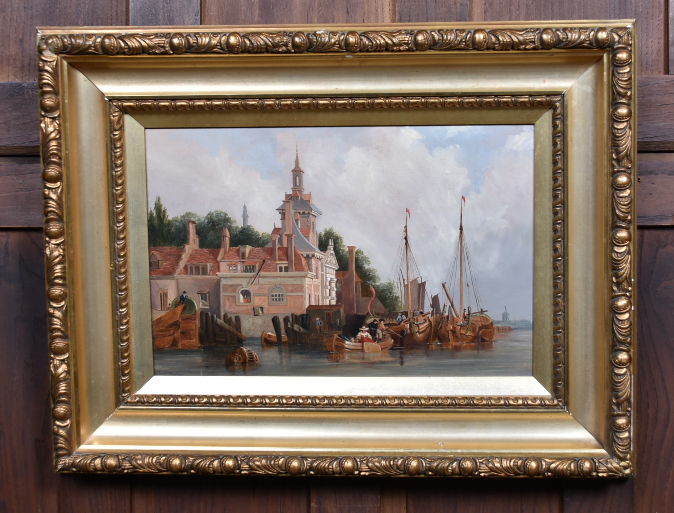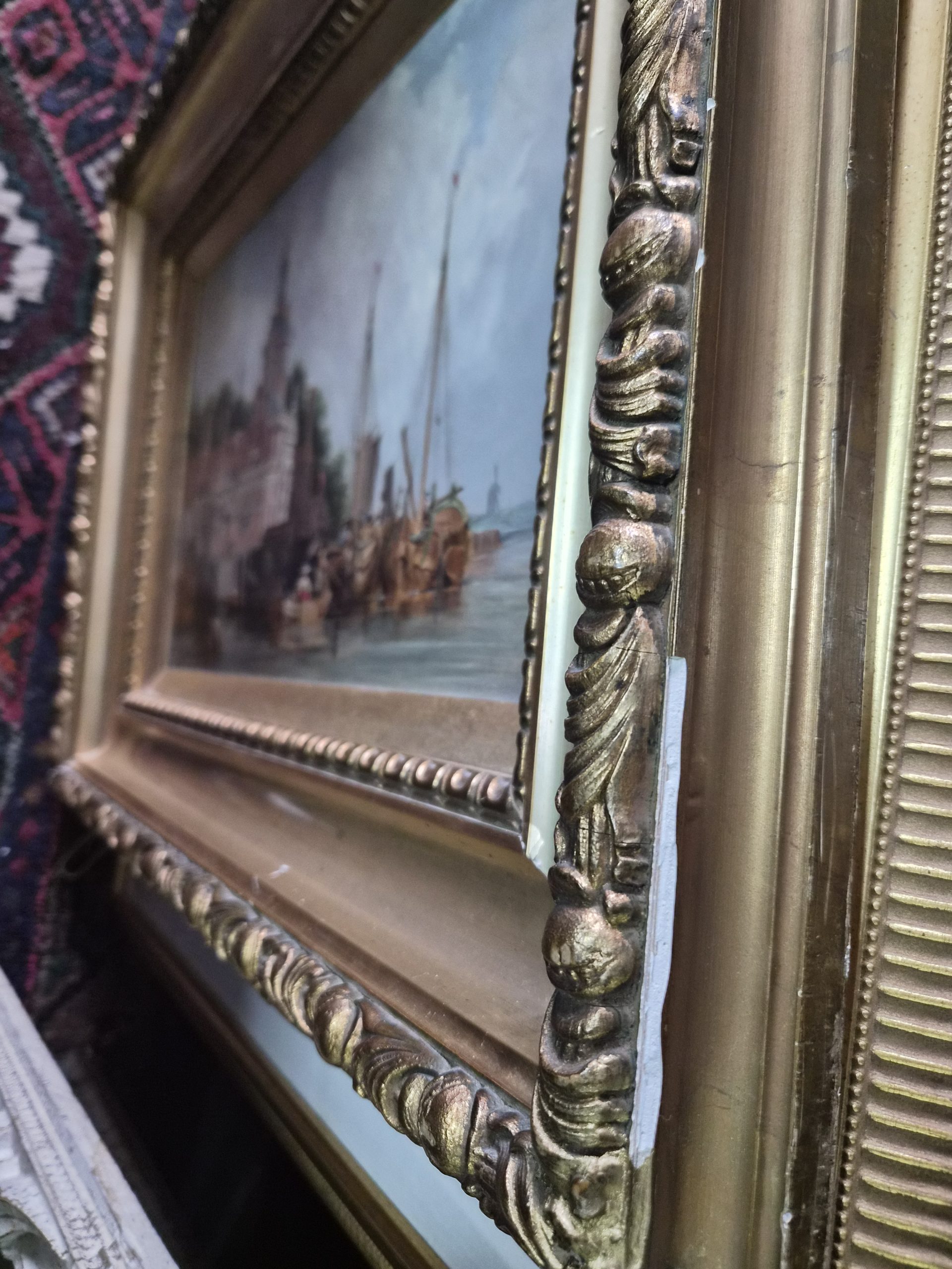 A wonderful unsigned oil painting depicting the historic Oudehoofpoort at Rotterdam, rendered in the manner of Alfred Gomersal Vickers. The composition reflects Vickers’ hallmark blend of architectural fidelity and atmospheric romanticism, with the medieval gateway and surrounding buildings mirrored in the still harbour waters. Moored boats with tall masts lend rhythm and scale to the scene, while the restrained palette, dominated by ochres, umbers, and slate blues, infuses the work with a quiet, nostalgic beauty. The ornate frame, showing gentle age-related wear, remains a sympathetic and characterful companion to the painting. Rich in charm and presence, this piece would make a distinguished and evocative addition to any interior.