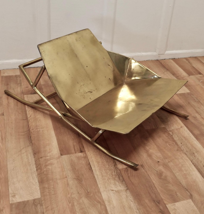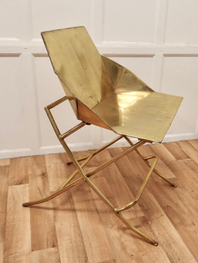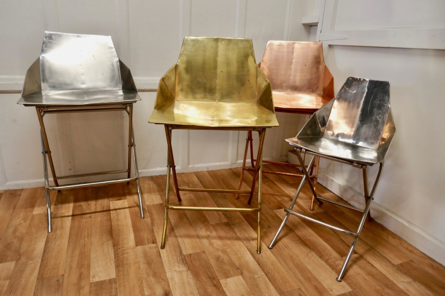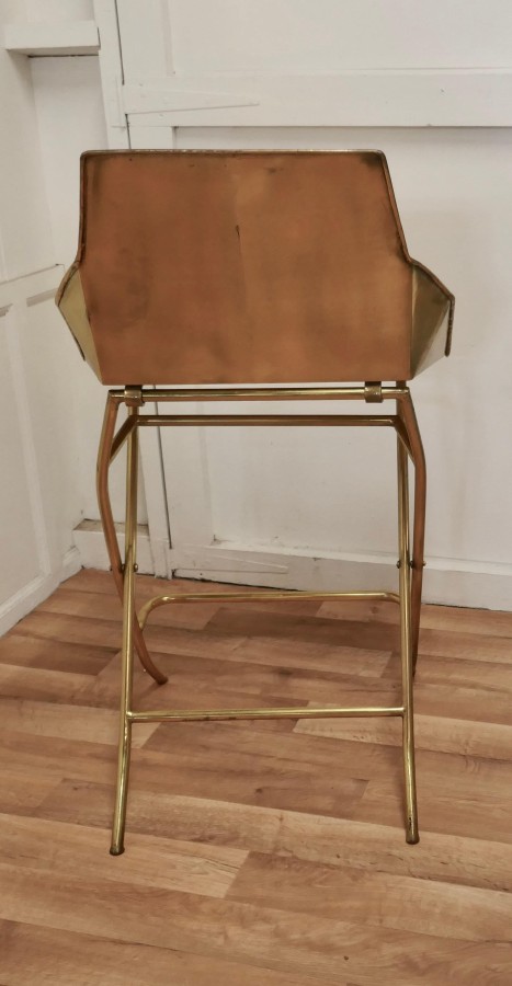 Unusual brass adjustable designer chair. A very unusual piece, this chair is all made in brass, the seat can be set to 2 different heights either to suit a Bar or a Table ( very handy for kitchen use) The chair has a foot support rail, a flat seat with slightly sloping back rest It is worth note that the chair can also be collapsed down for storage At maximum height he chair is 42” high at the back, 24” wide and 24” deep and is in good condition, the seat height is 28” or 20.5” We also have a similar chair in copper, and 2 in steel, these are different sizes. AC129. Manufacture Date : 1970 Materials : Brass