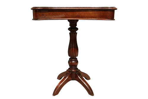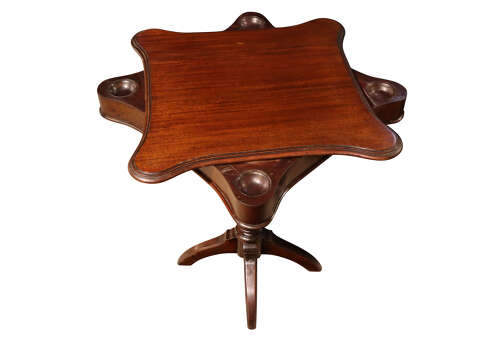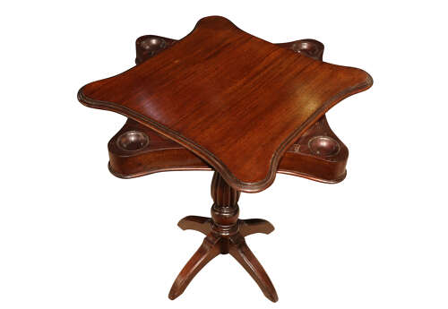 A charming and highly unusual early Victorian mahogany gaming table, the shaped square top swivelling to reveal four recessed circular dish compartments for counters or coins. The well-figured mahogany top with moulded edge sits above a rounded apron, all supported on a finely turned and fluted baluster column. The table stands on an elegant quadruple splay base with shaped legs of good stance.