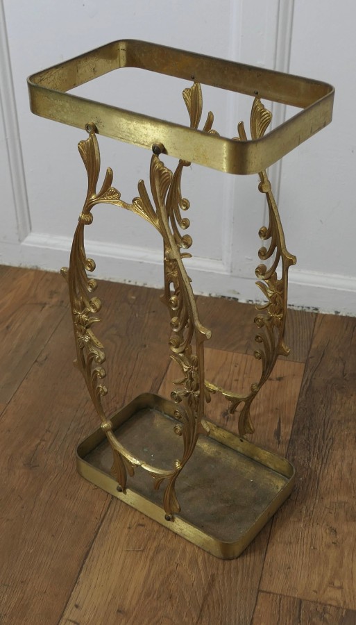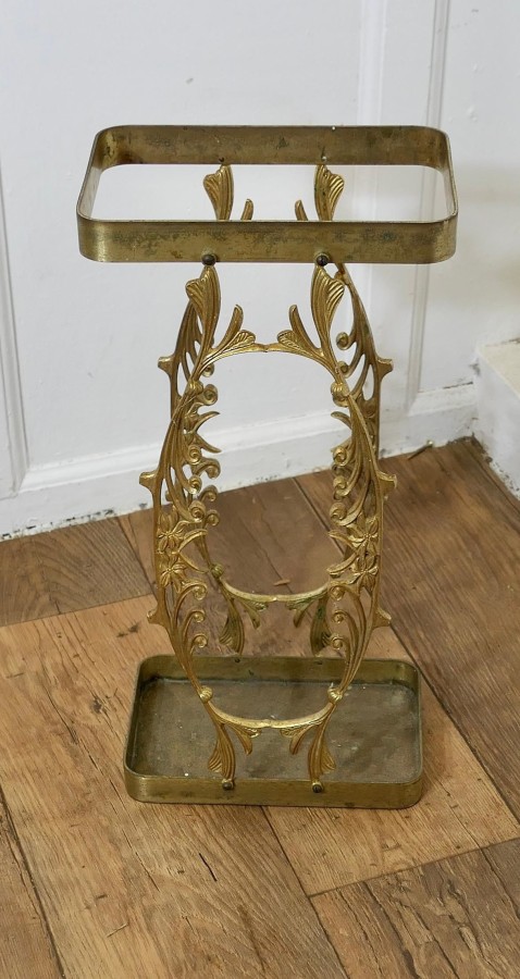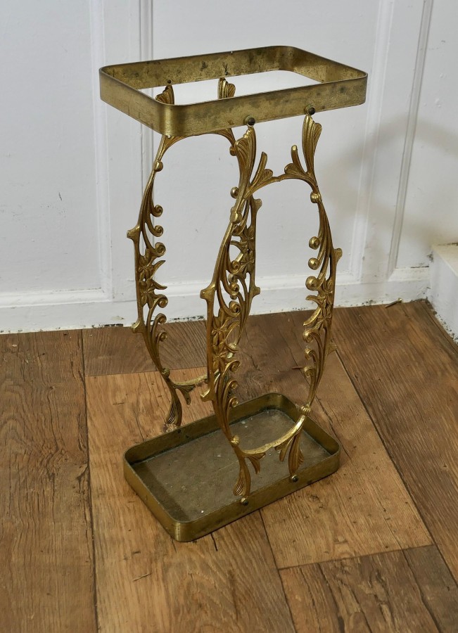 Unusual French Brass Stick Stand or Umbrella Stand A charming piece, and it has a very unusual shape, with a rectangular base and decorative brasswork back and front to hold both Walking Sticks and Umbrellas The stand is 21” high, 10” wide and 7” deep FB267 Manufacture Date : 19th century Materials : Brass