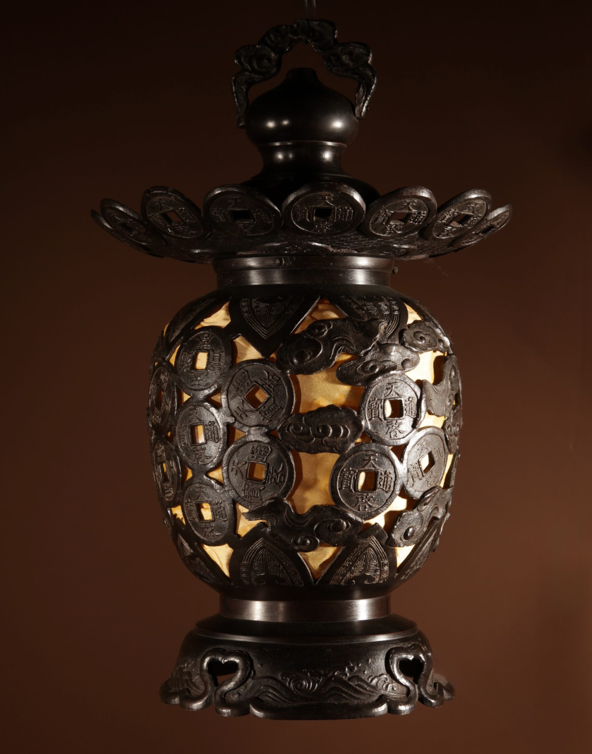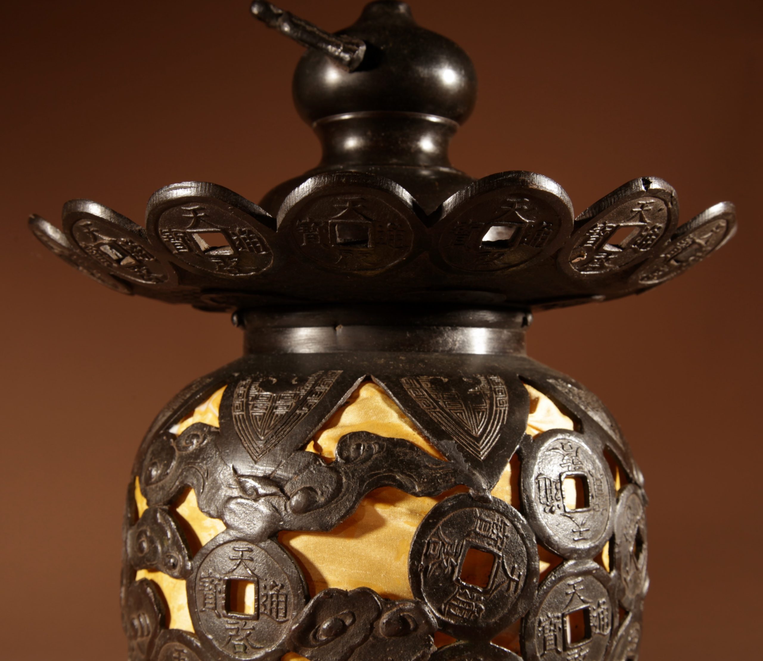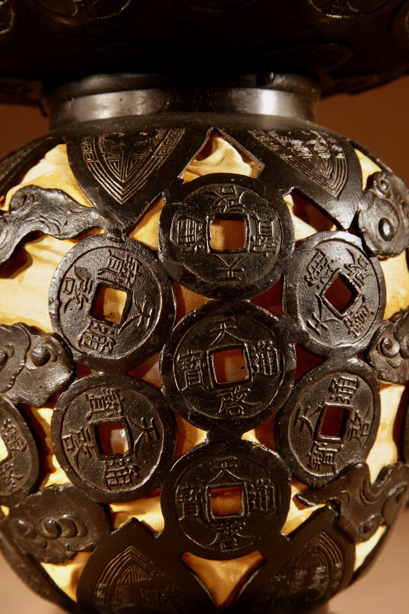 With unusual ornaments in the shape of Japanese/Chinese coins.