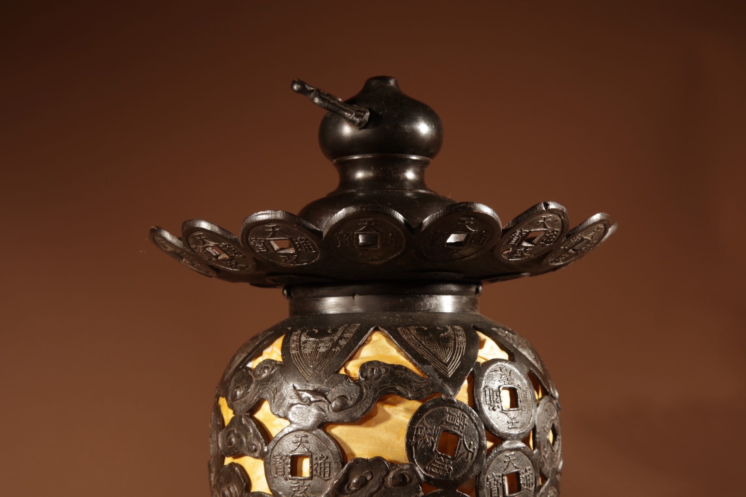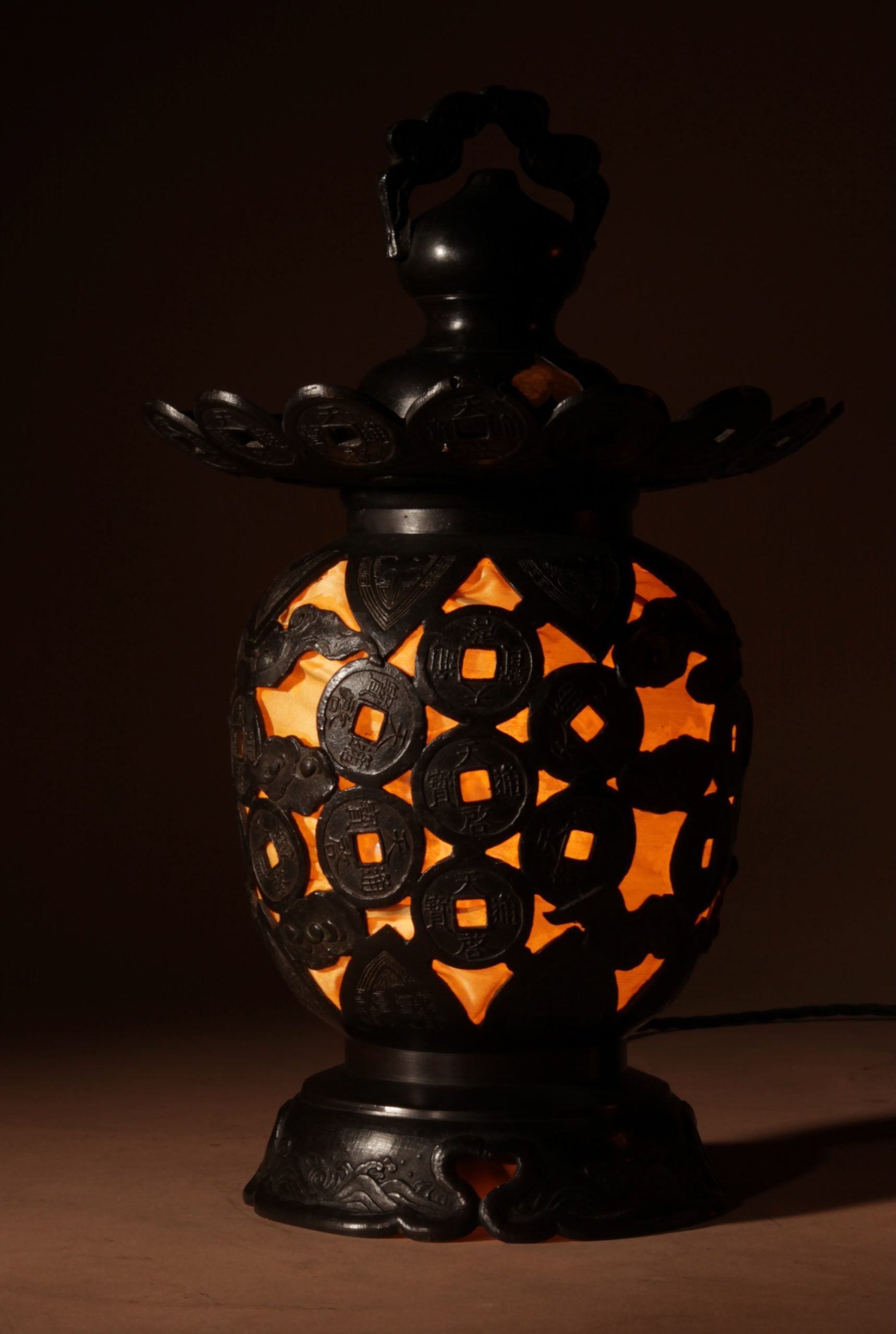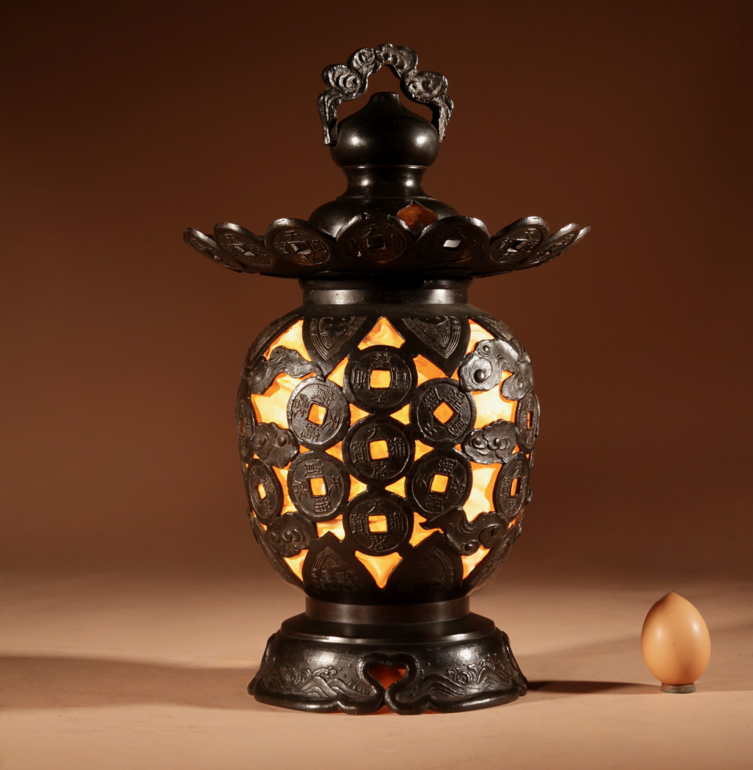 With unusual ornaments in the shape of Japanese/Chinese coins.