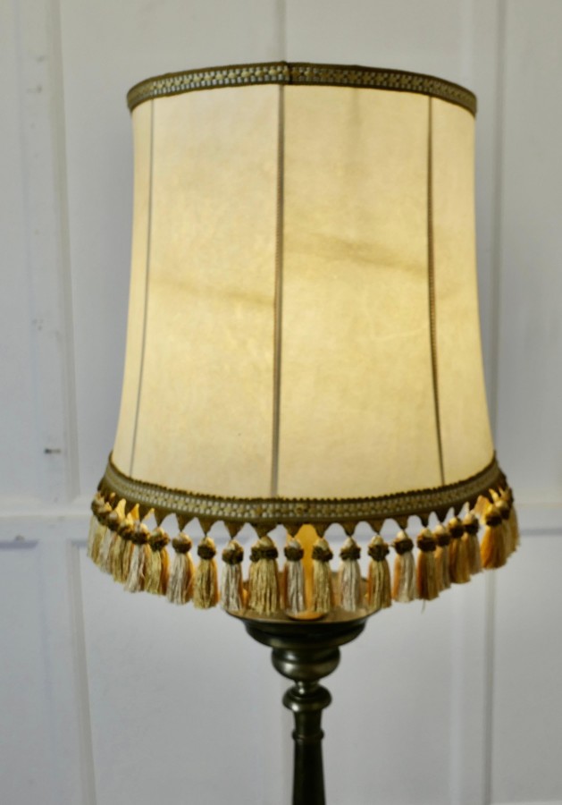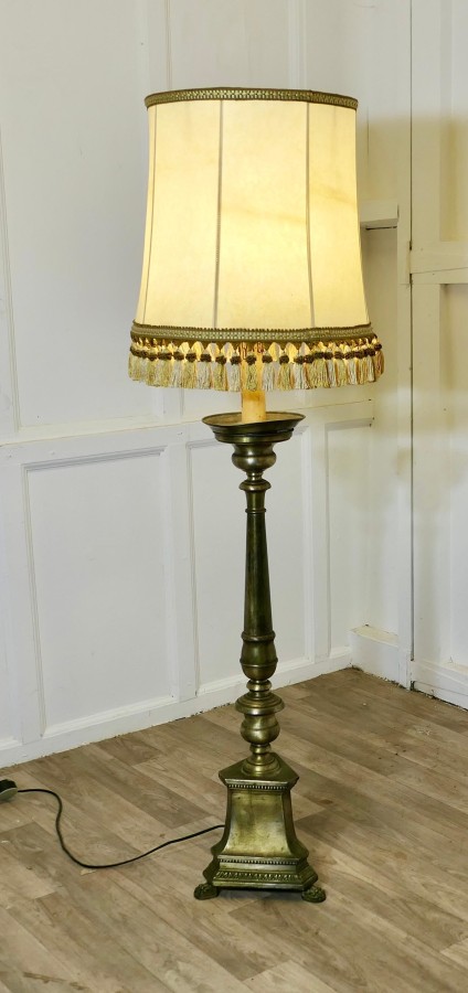 Very Large Brass Table Lamp, or a Half Height Floor Lamp This is a very sturdy and heavy piece, the lamp has a single turned column set on a heavy triangular stepped base This is an attractive piece with an aged patina and comes with its original parchment lamp shade The Lamp is 53” tall and the shade 18” diameter ZX279 Manufacture Date : 1900 Materials : Brass