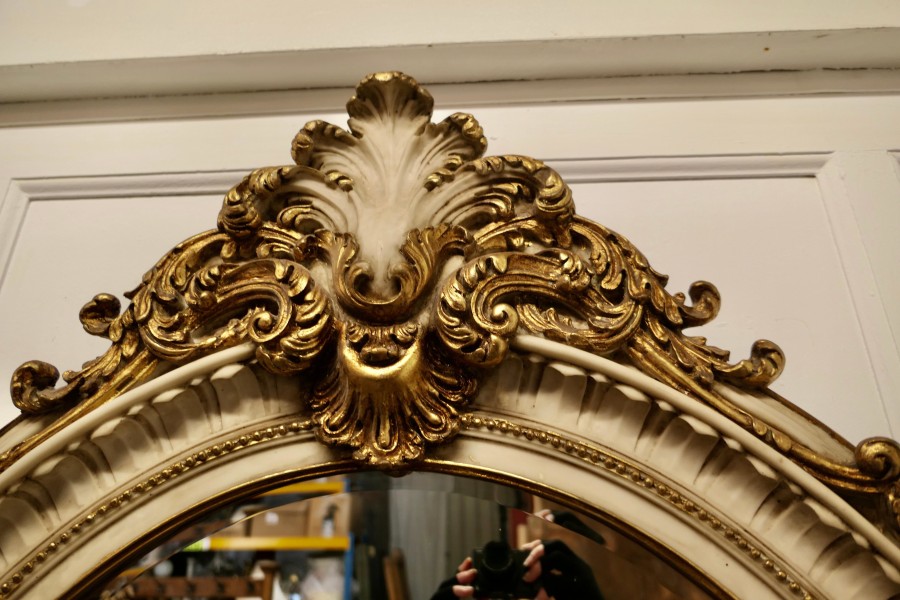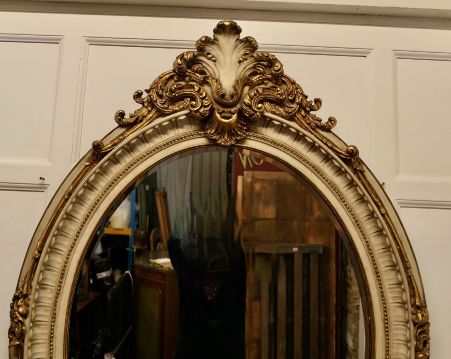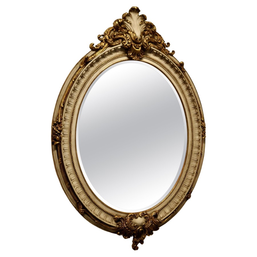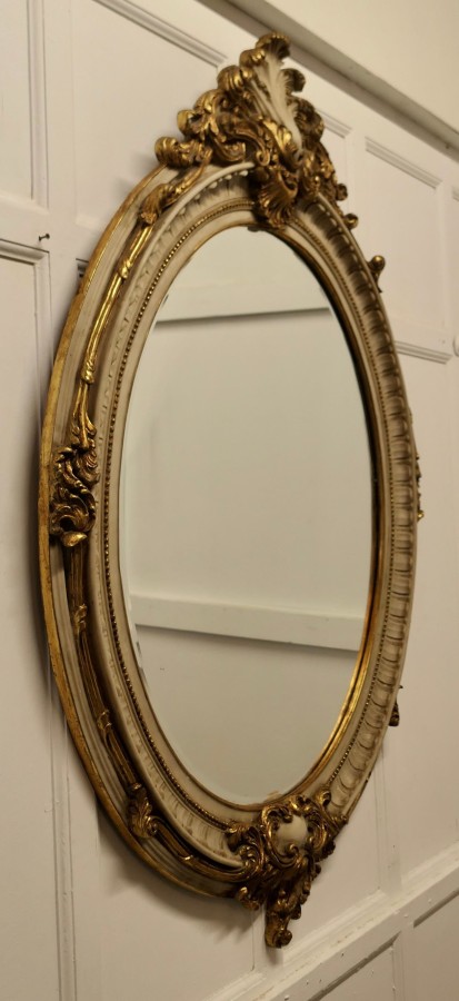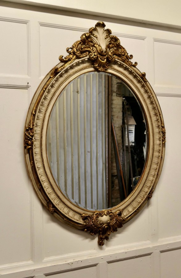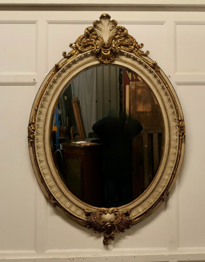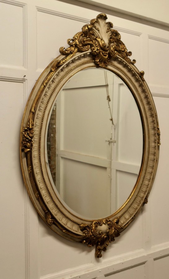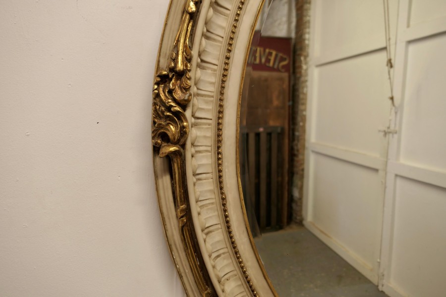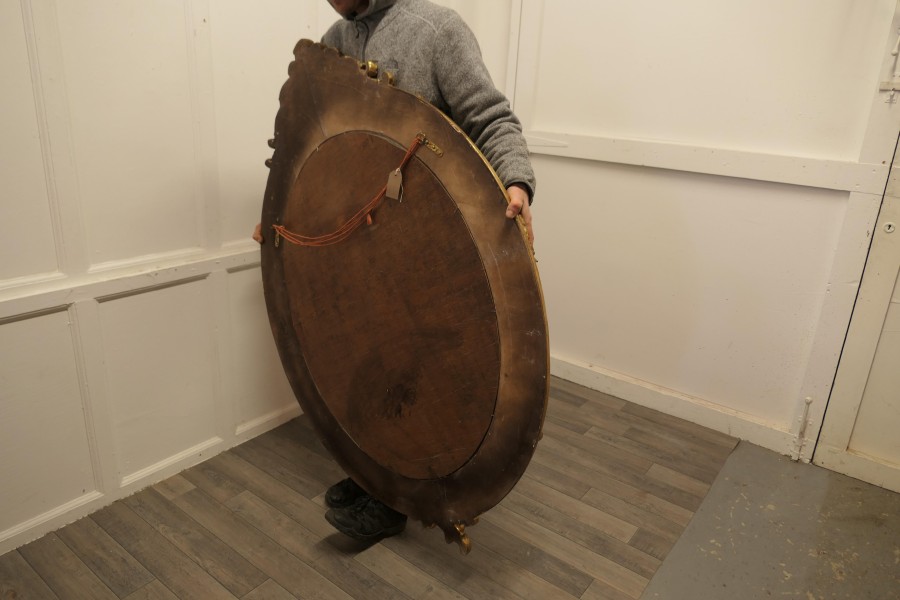 Very large French Rococo style oval gilt wall mirror. The mirror has an impressive 6” wide gilt frame in the Rococo Style, it is made in a simulated marble decorated with very large shells and scrolls in aged gilt The oval frame is in good condition with only minor wear to the finish, the Oval bevelled looking glass is original and and is also in good condition. The overall size of this impressive piece is 41” wide and 59” tall. JK206 Manufacture Date : 1950 Materials : Composition