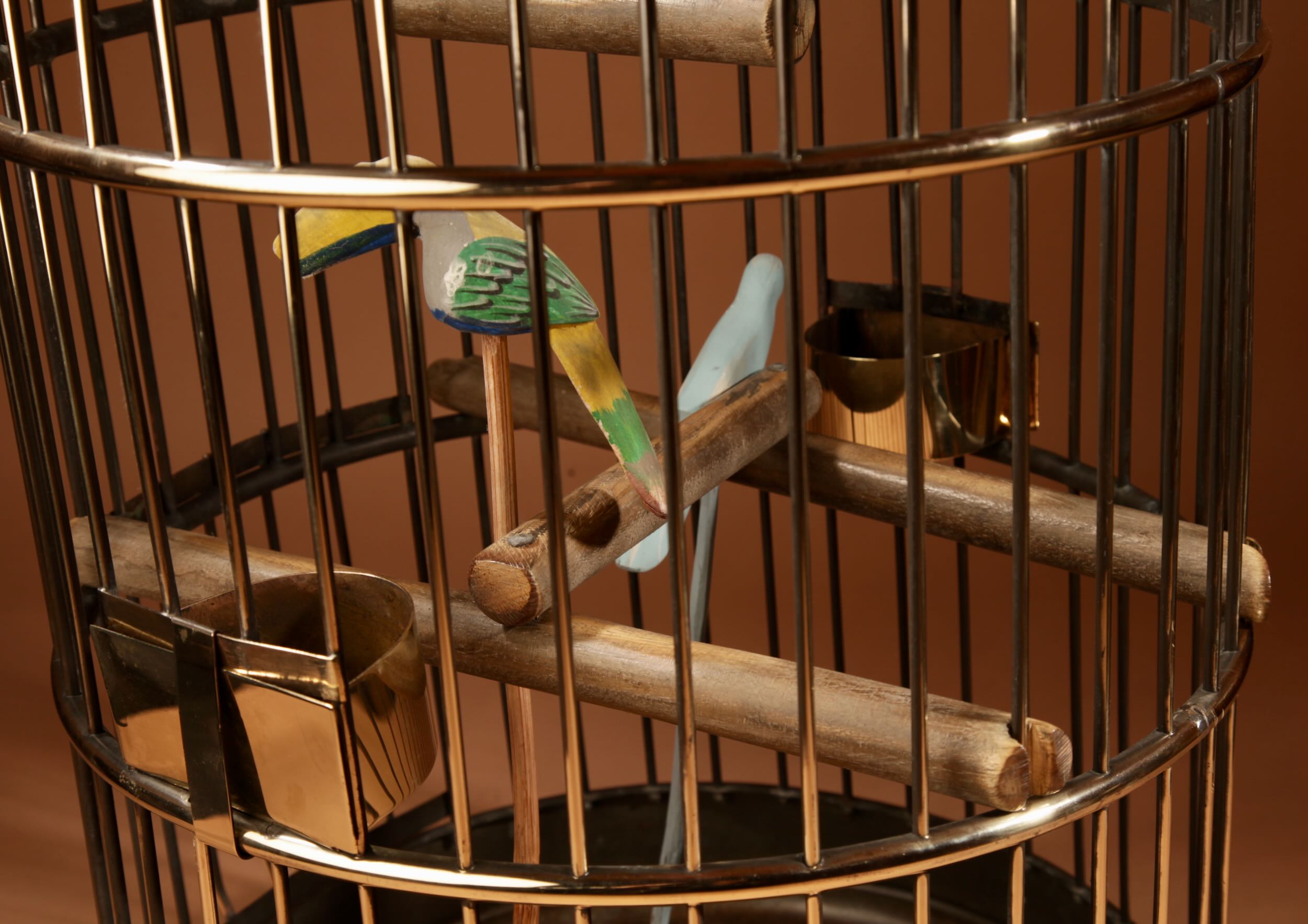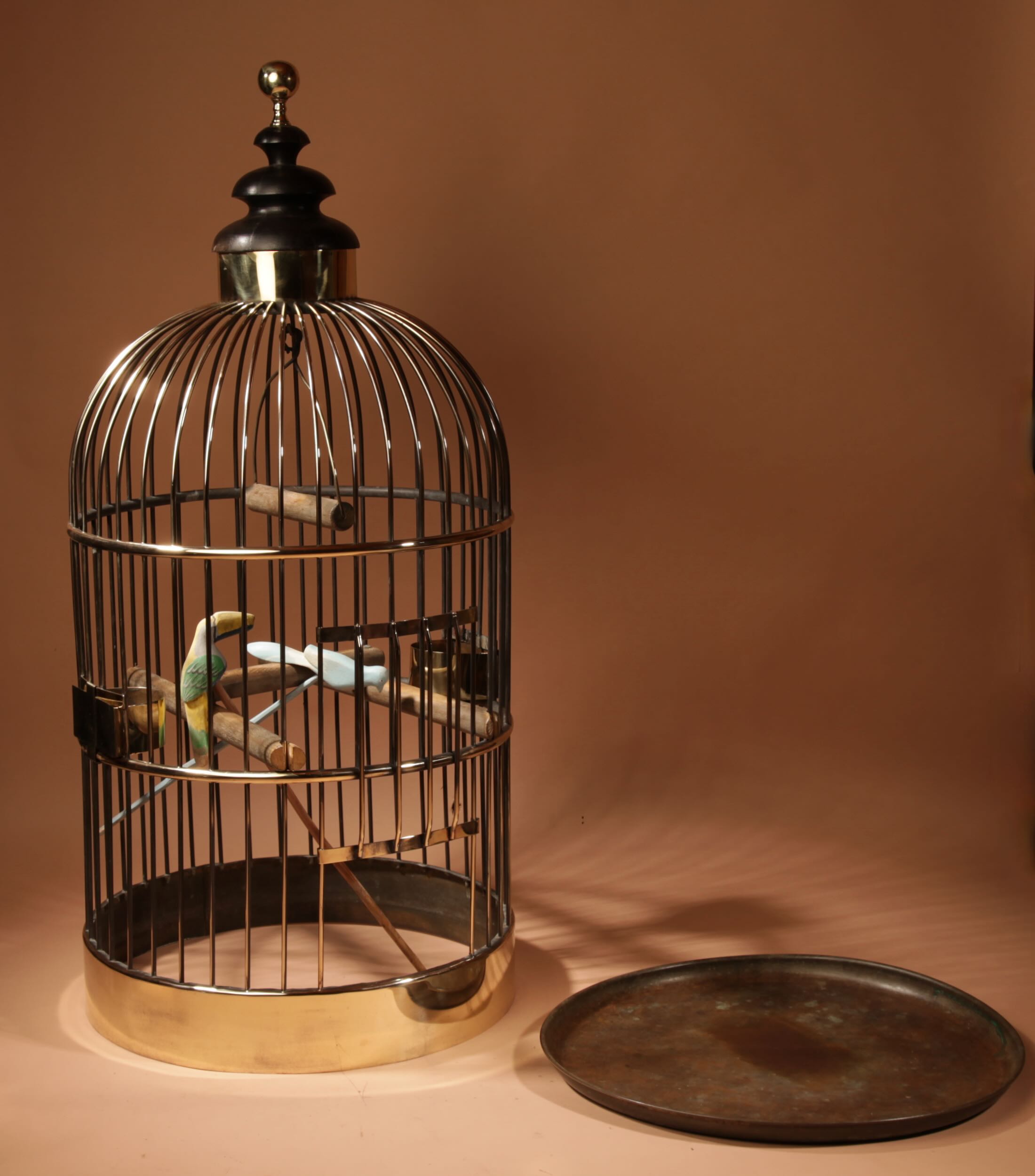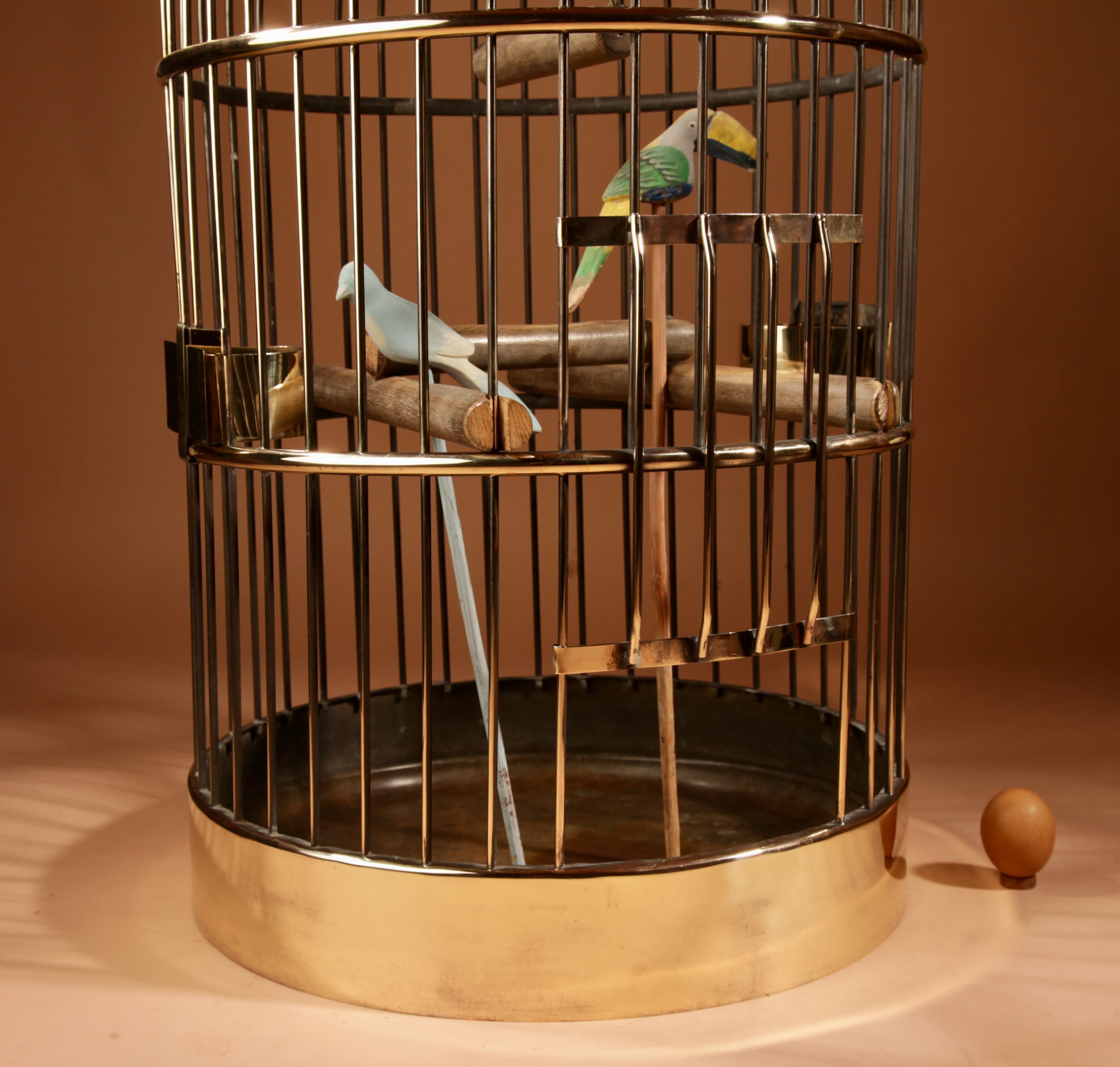 The bird cage has its original brass feeders and under tray.