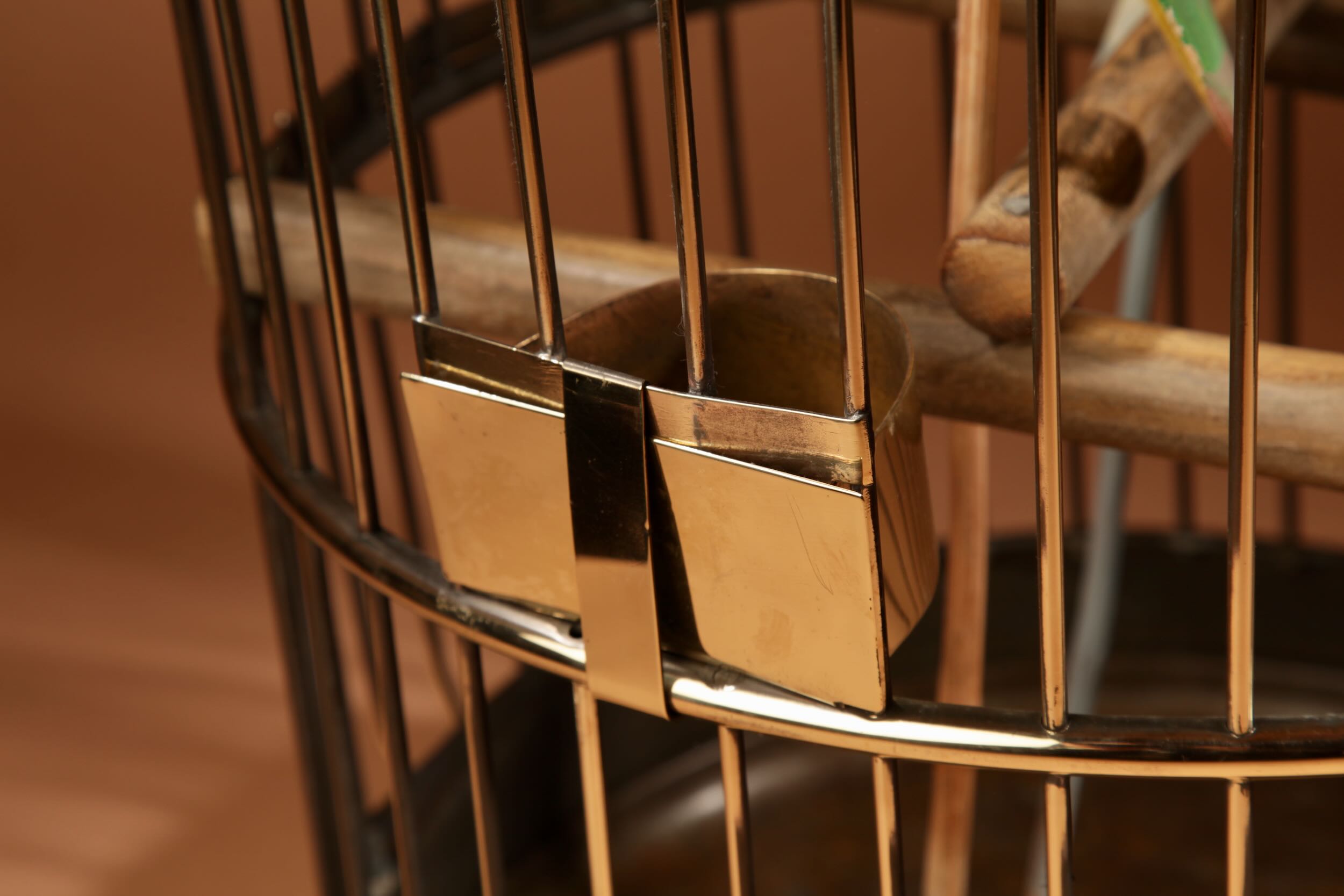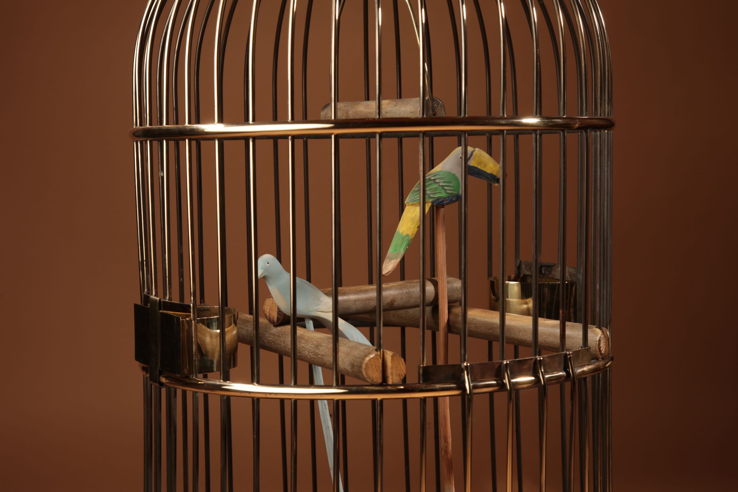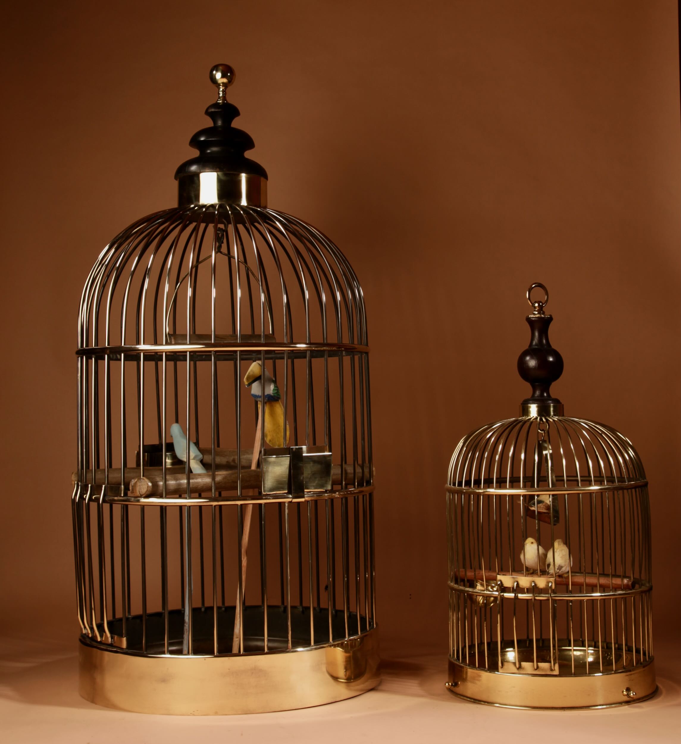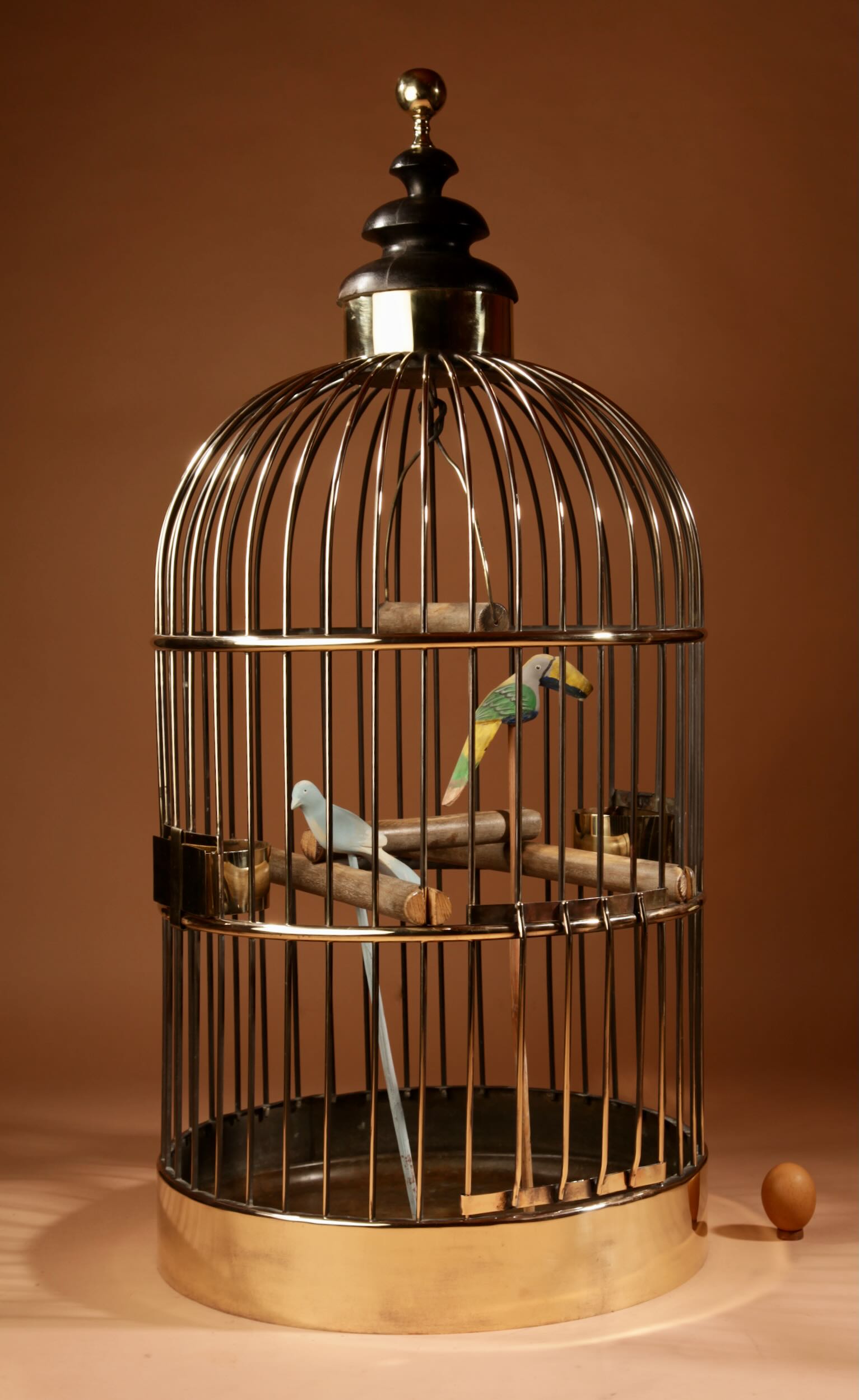 The bird cage has its original brass feeders and under tray.