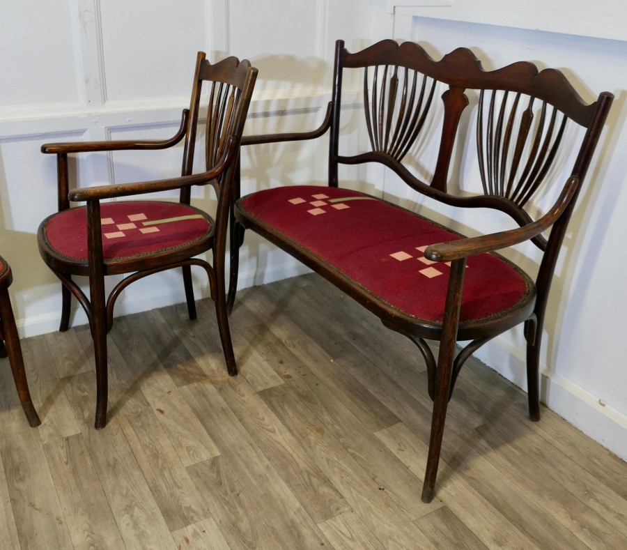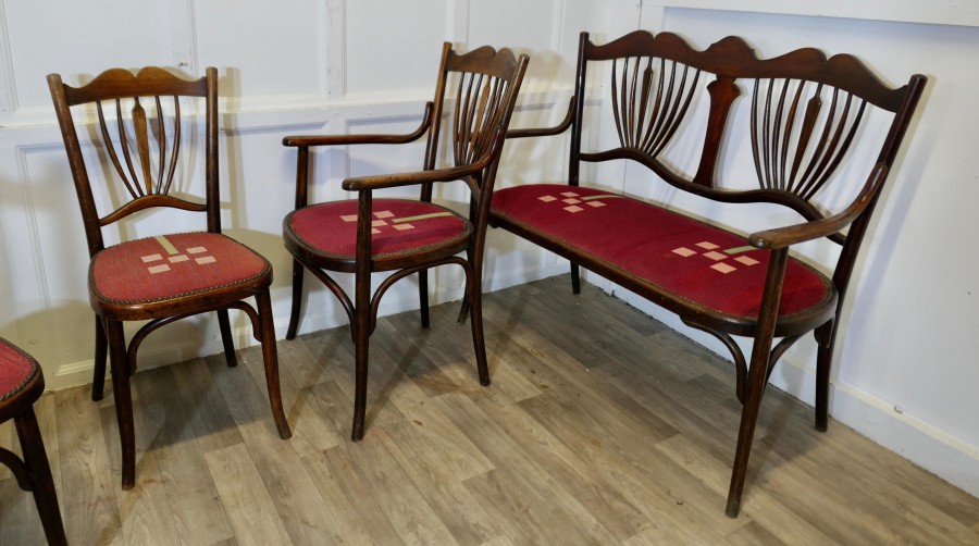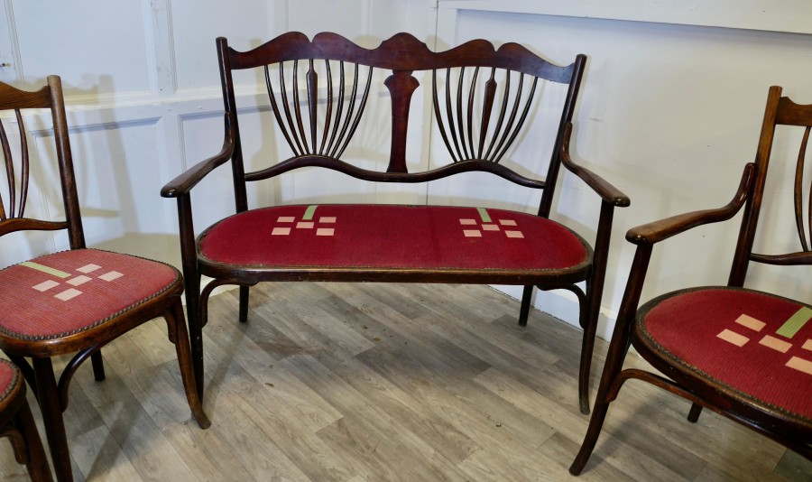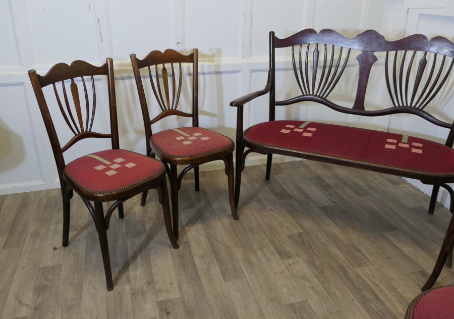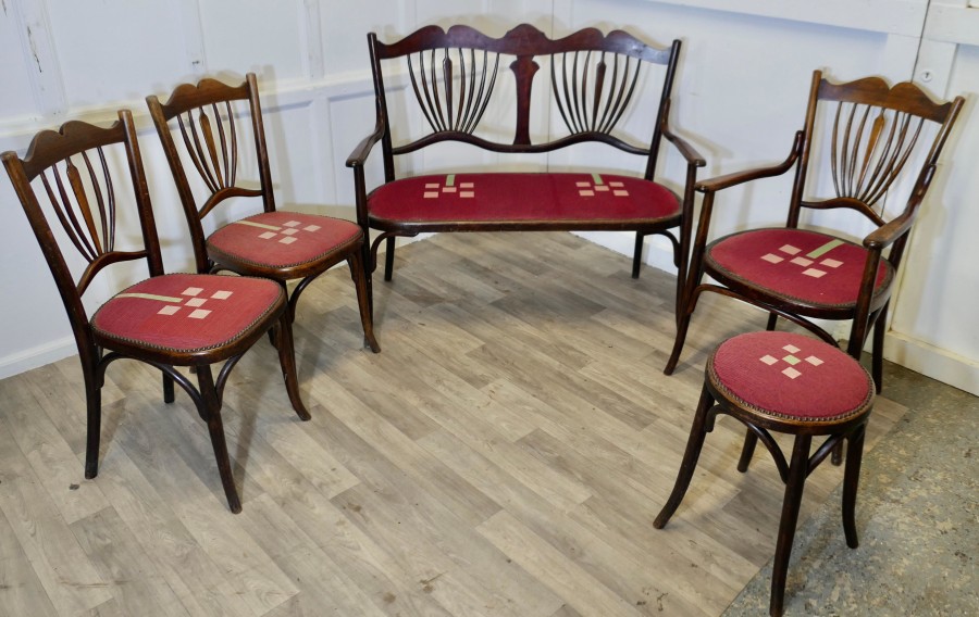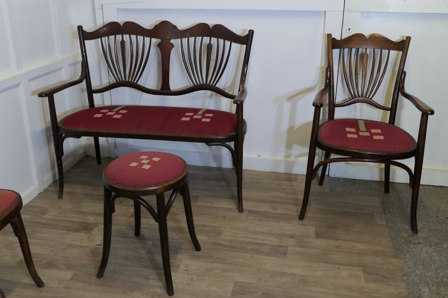 Very Rare Baumann Bentwood Salon Suite This is an original Baumann Upholstered Bent Wood Salon Suite, comprising a 2 Seater Settee, an Arm Chair, 2 side chairs and a stool. This is a rare and charming set, the settee and chairs are made in bent wood with attractive fan spindle backs, these and the stool are presented in their original woven wool upholstery, the upholstery is in remarkably good condition for its age, the set dates from about 1930 The set is in good sound condition with no breaks or repairs, the settee is 44” long 38” high at the back and the seat is 19” ZX287 Manufacture Date : 1930 Materials : Bentwood