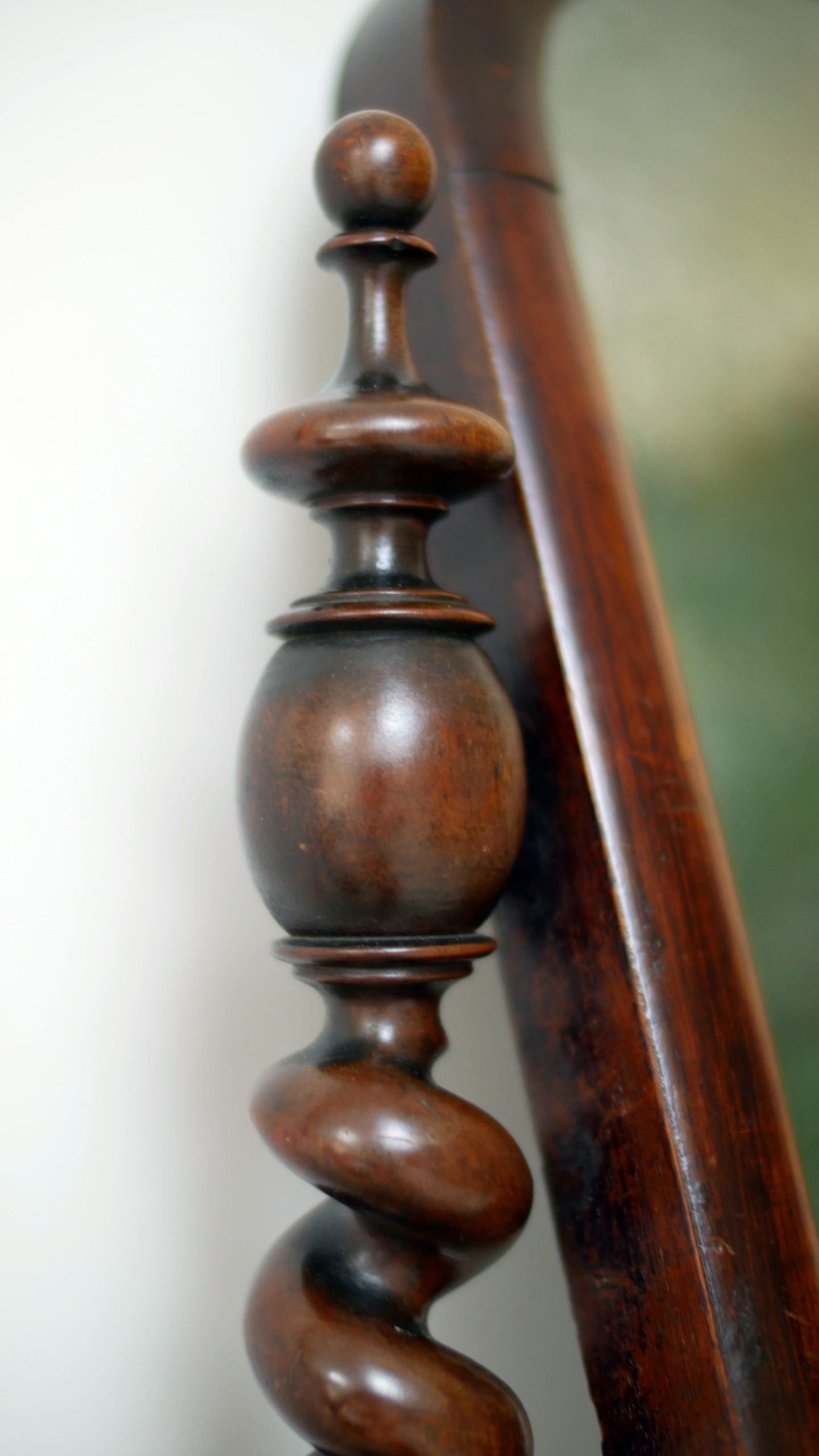 Barley-Twist Supports: The mirror is flanked by two beautifully turned barley-twist columns (a signature of the Victorian era), standing on elegant, carved bun feet.