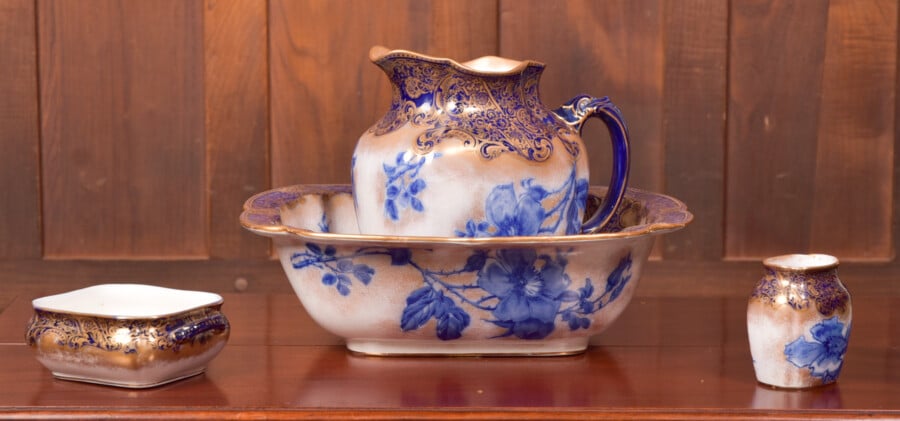 Superb Victorian earthenware set comprising of jug, basin, tooth brush pot and soap dish made by Doulton. In excellent condition with no chips or cracks to the gilded rims or paint. This set is beautifully painted and highly decorative and will look fantastic in any bathroom. c. 1882
